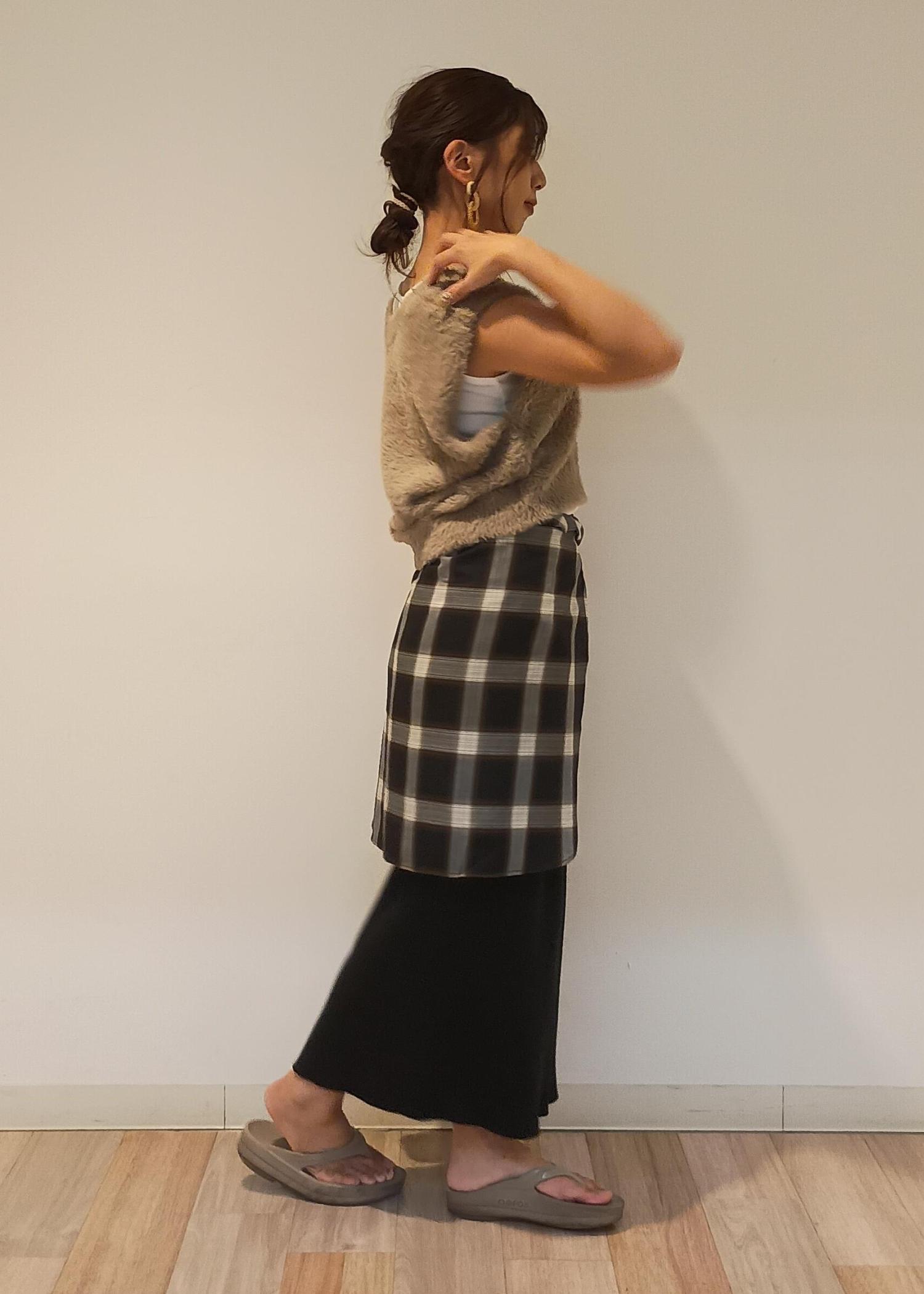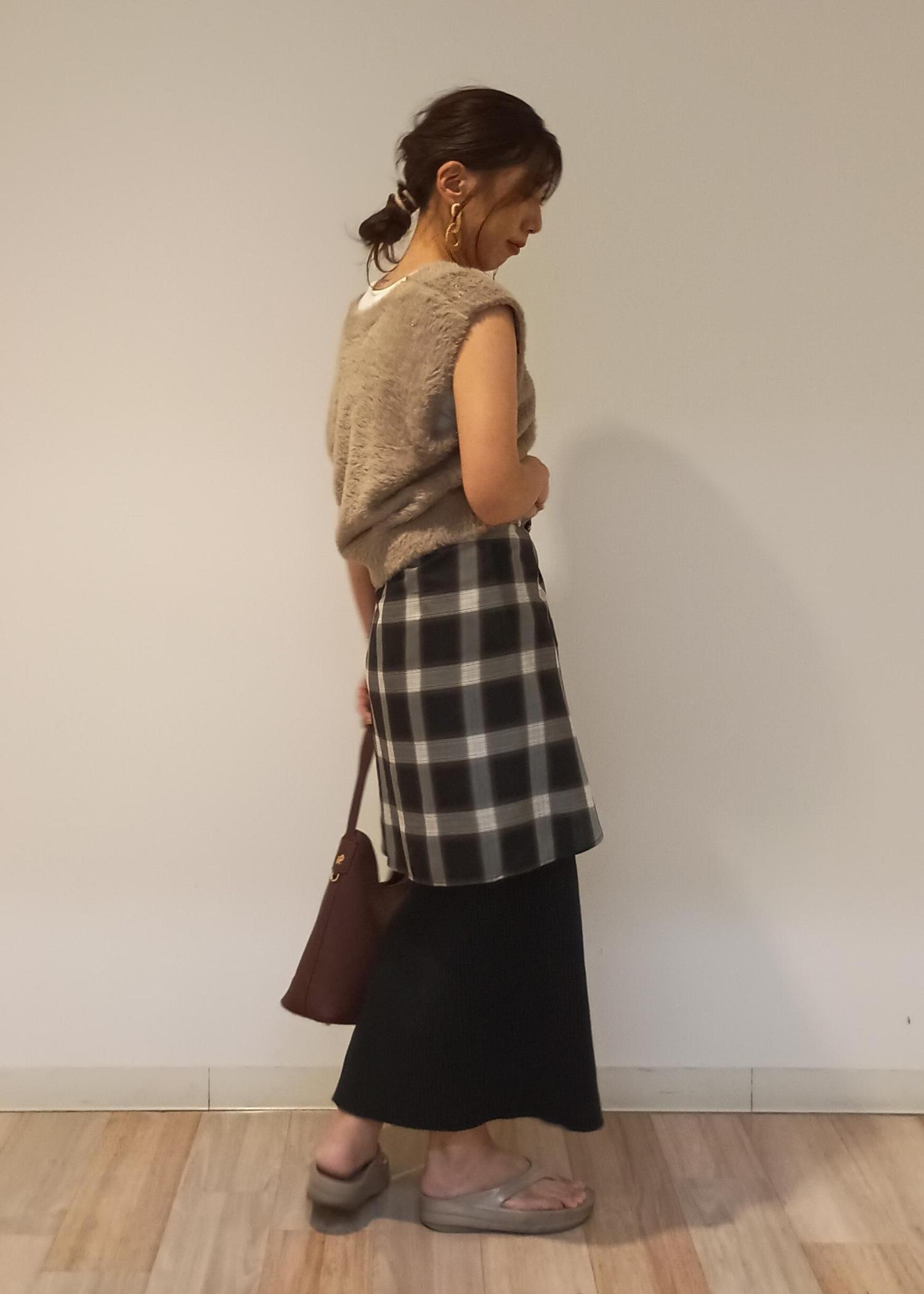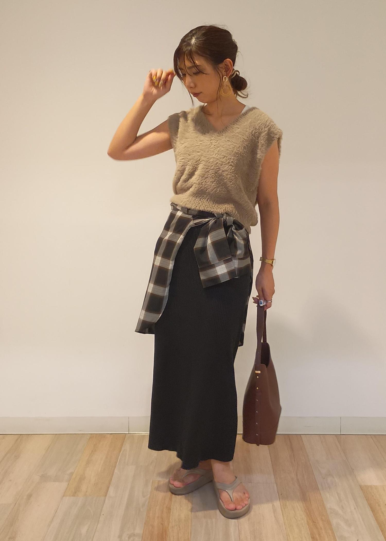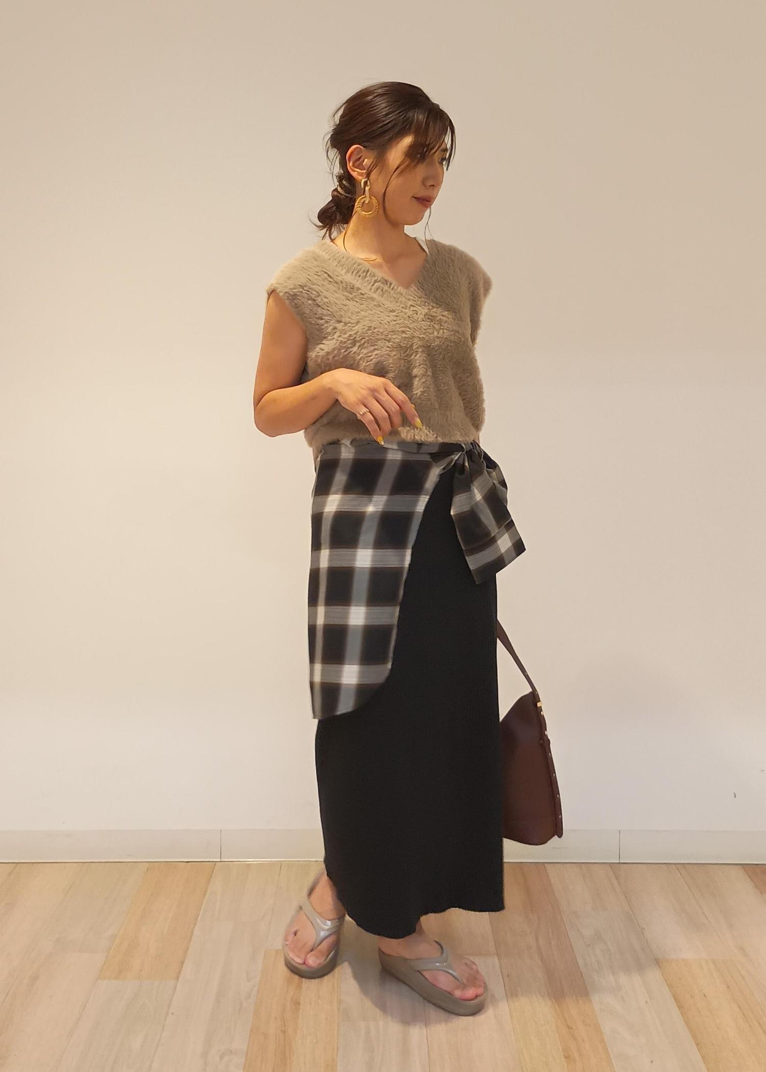 トレンド感のあるアイテムを盛り込んだ大人カジュアルコーデ。腰巻にしたチェックシャツは、羽織ってもベストの中に着ても可愛く着回しを楽しめます!