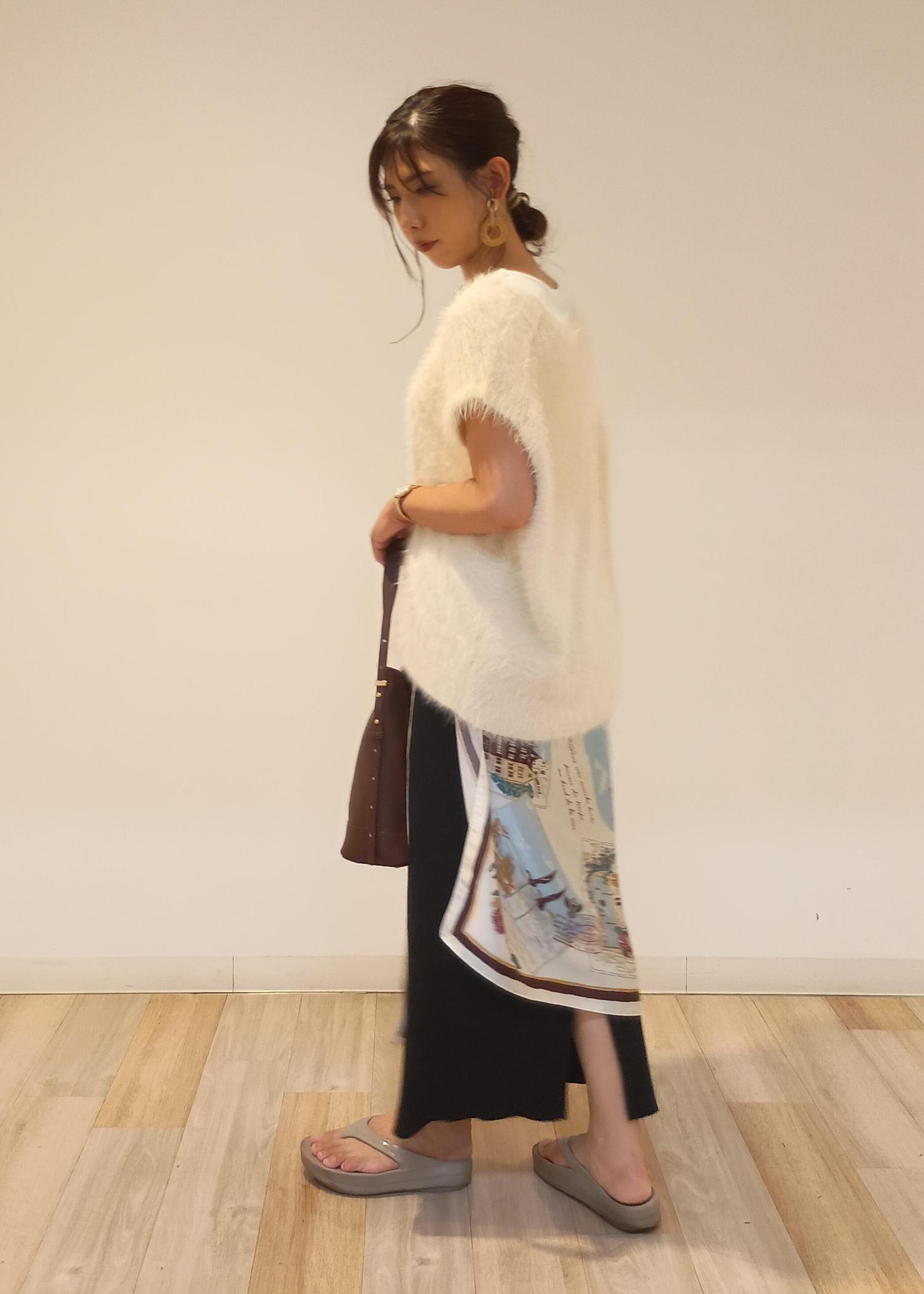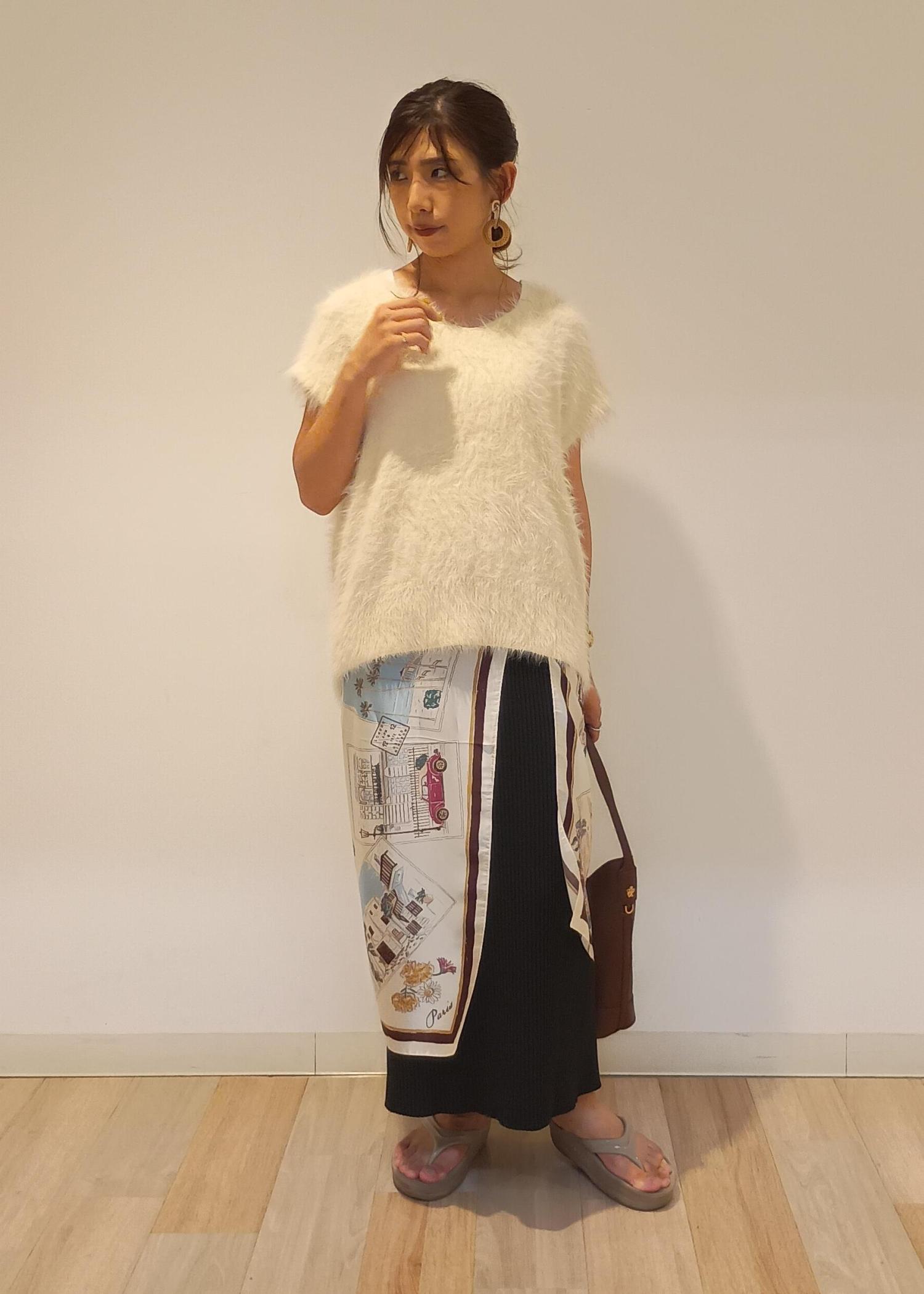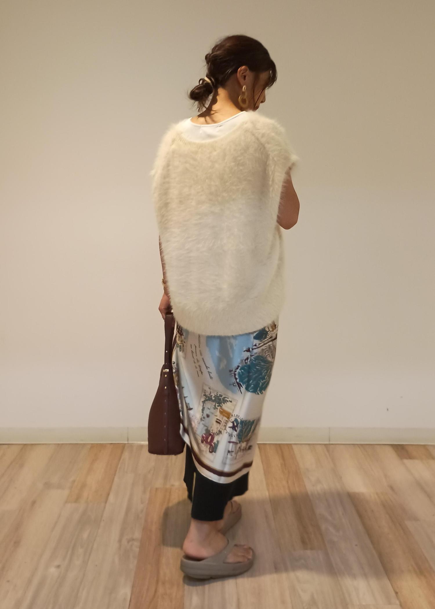 トレンドのスカーフを取り入れた大人っぽさのある秋コーデ。柔らかく肌触りの良いフェザーニットのベストと、ハリのあるタイトスカートで素材とカラーにコントラストを、スカーフとバッグでカラーをまとめているのがポイントです。