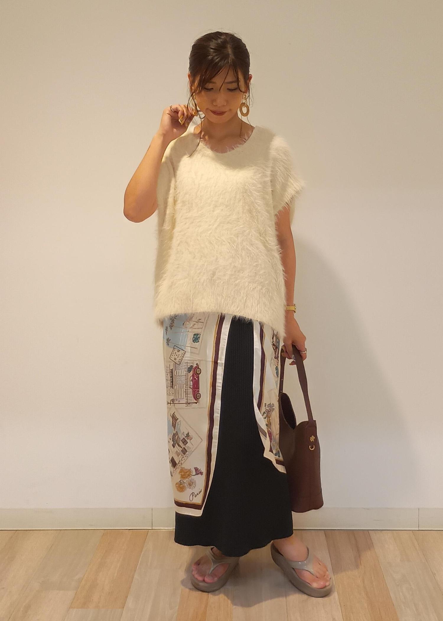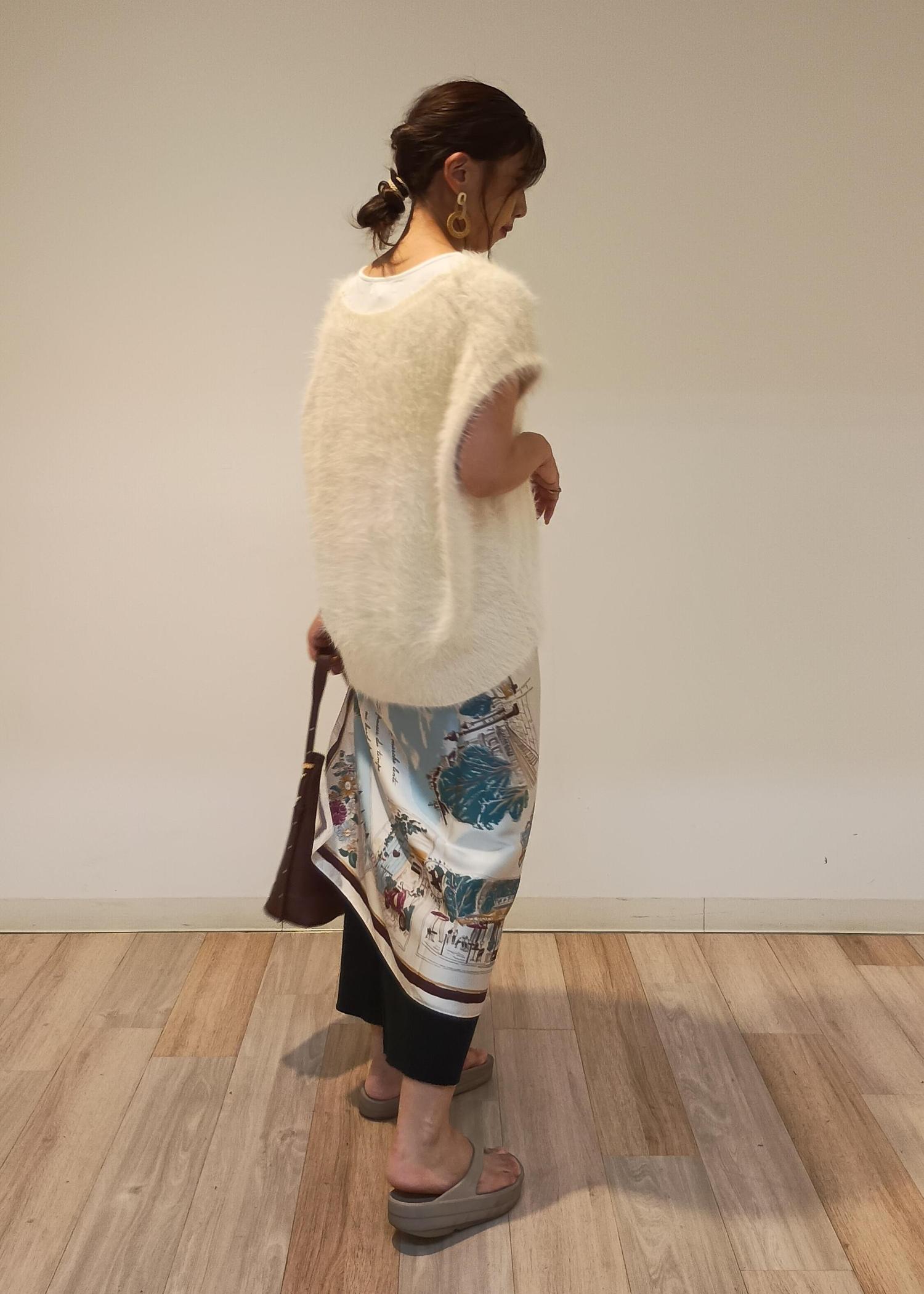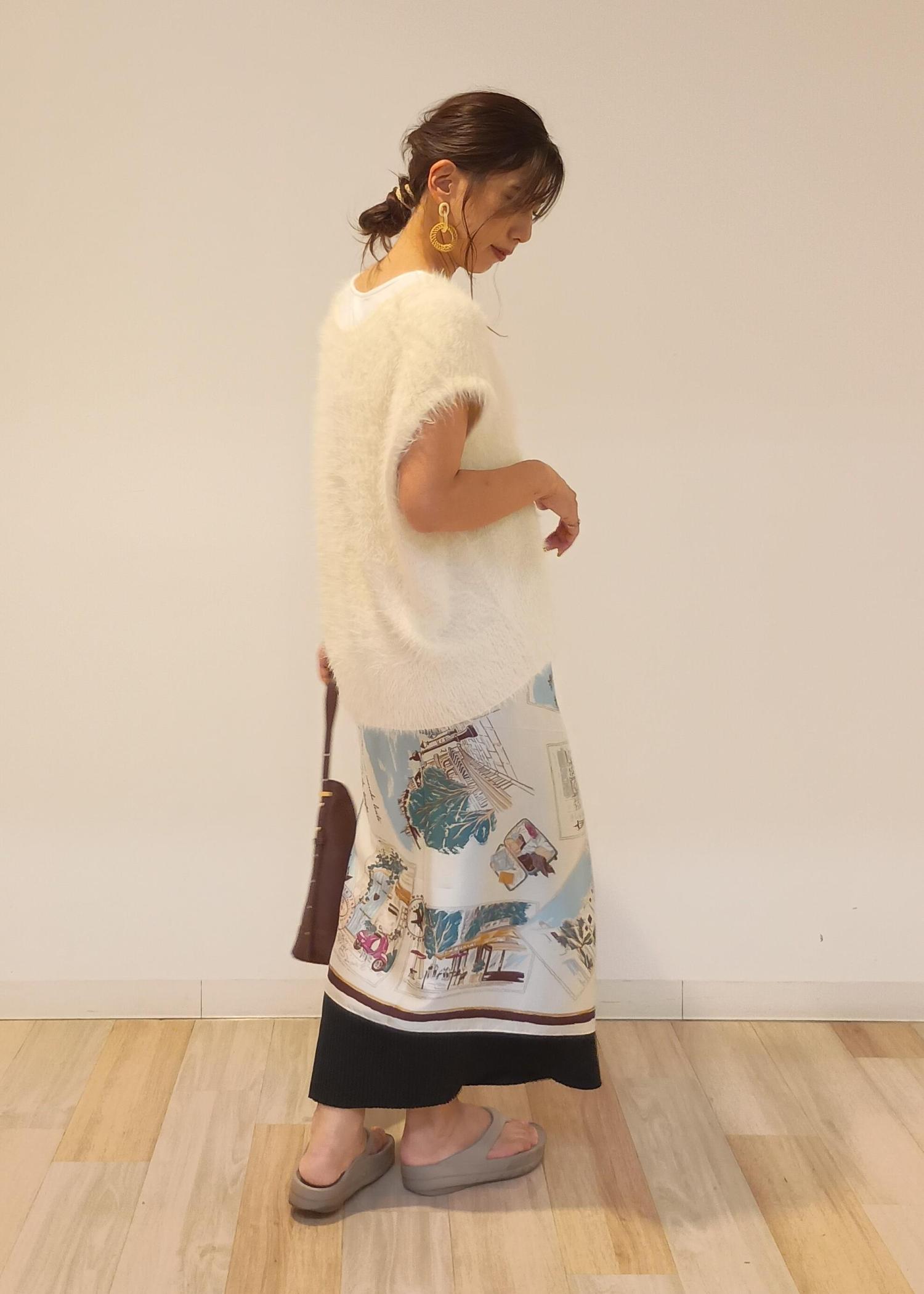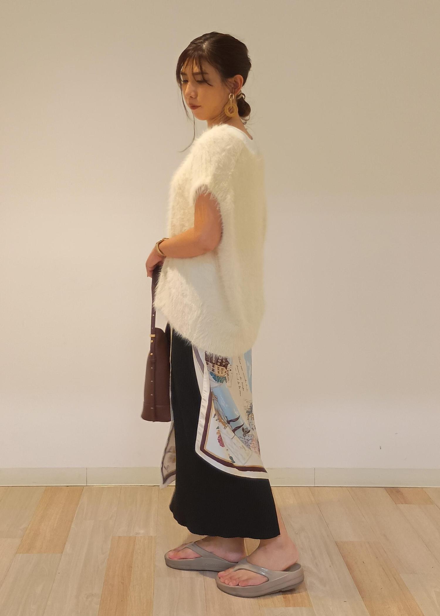 トレンドのスカーフを取り入れた大人っぽさのある秋コーデ。柔らかく肌触りの良いフェザーニットのベストと、ハリのあるタイトスカートで素材とカラーにコントラストを、スカーフとバッグでカラーをまとめているのがポイントです。