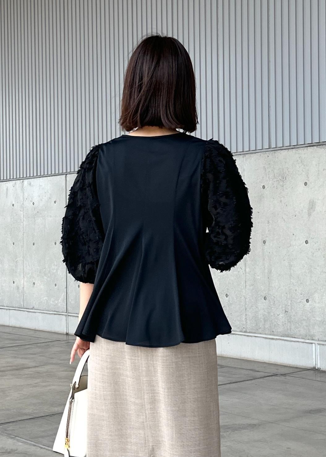 ROPÉジャガードスリーブコンビブラウス/イージーケアブラック / F¥19,800レビュー身長156cm、Fサイズ着用。