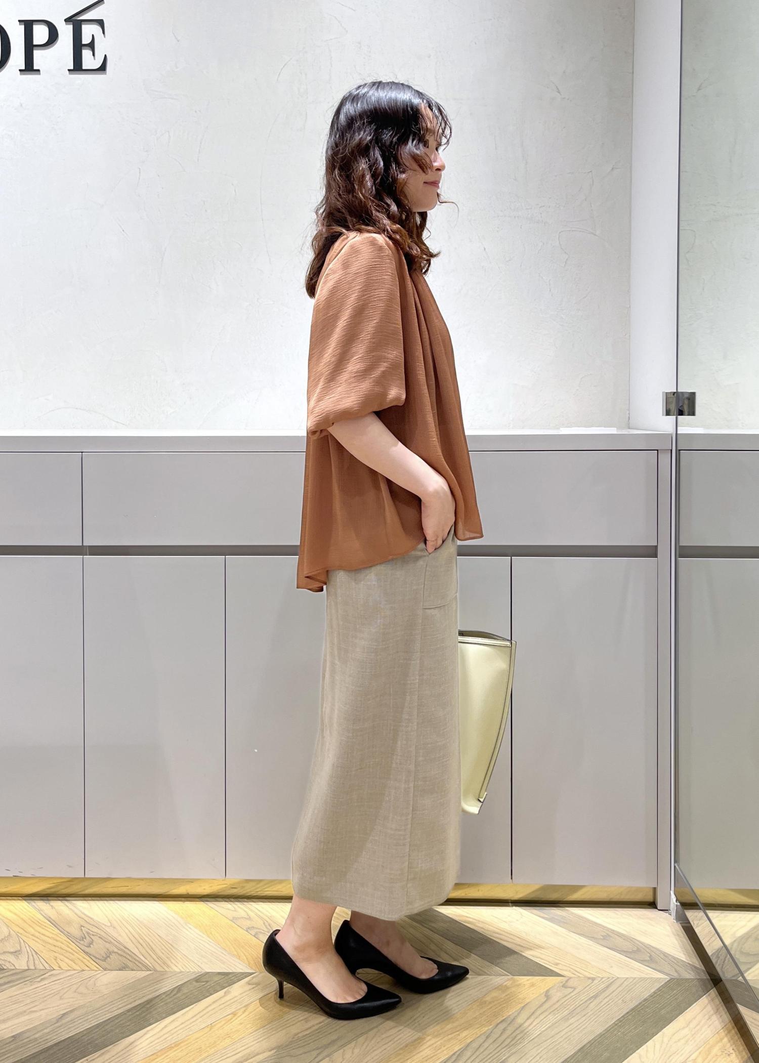 ポリエステル素材ですが、リネンに見える風合いと薄すぎない生地でヒップラインも気になりにくいです◎ -