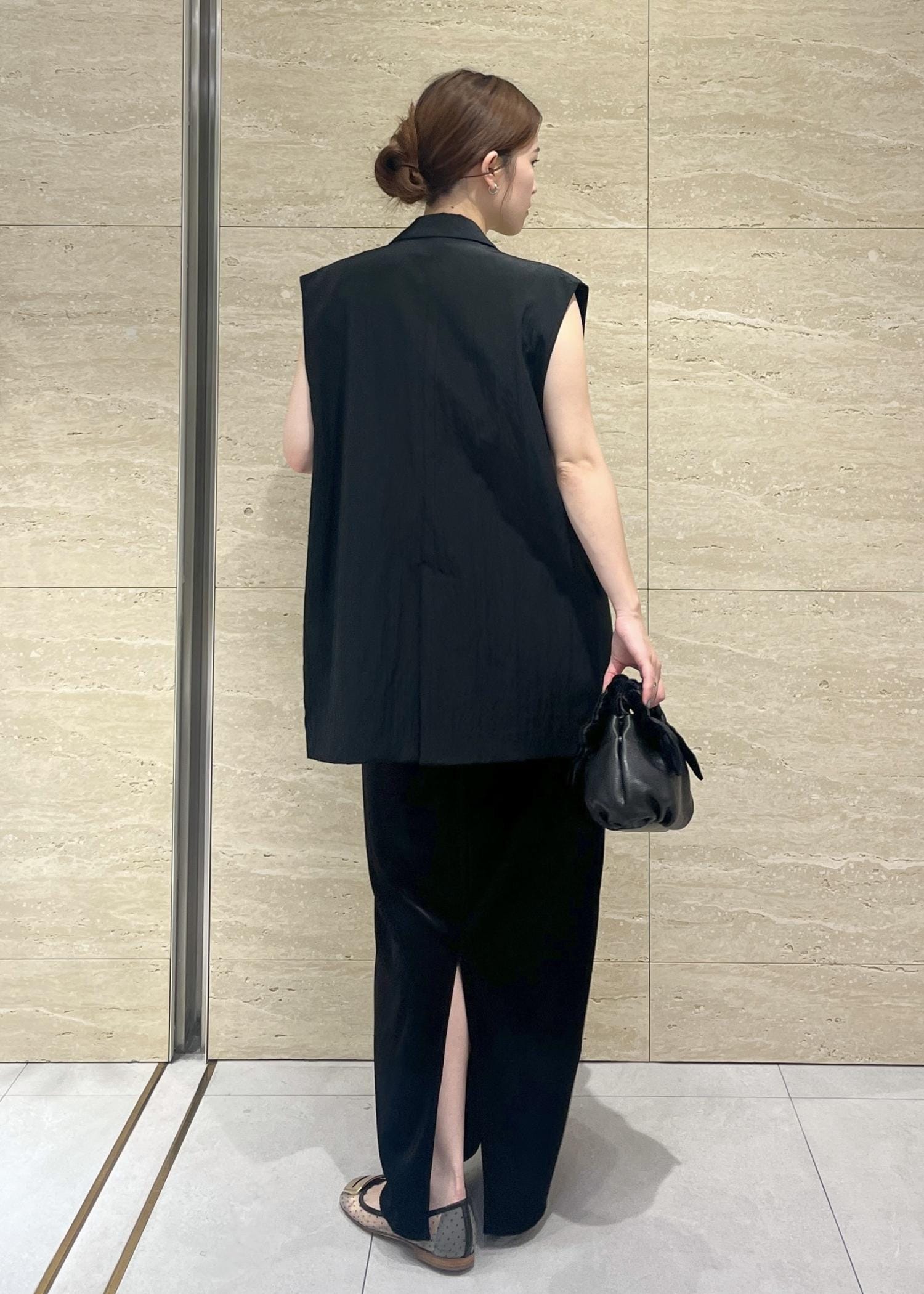 ゆとりのあるサイズ感なので、中に着るトップスを選ばずに合わせていただけると思います。