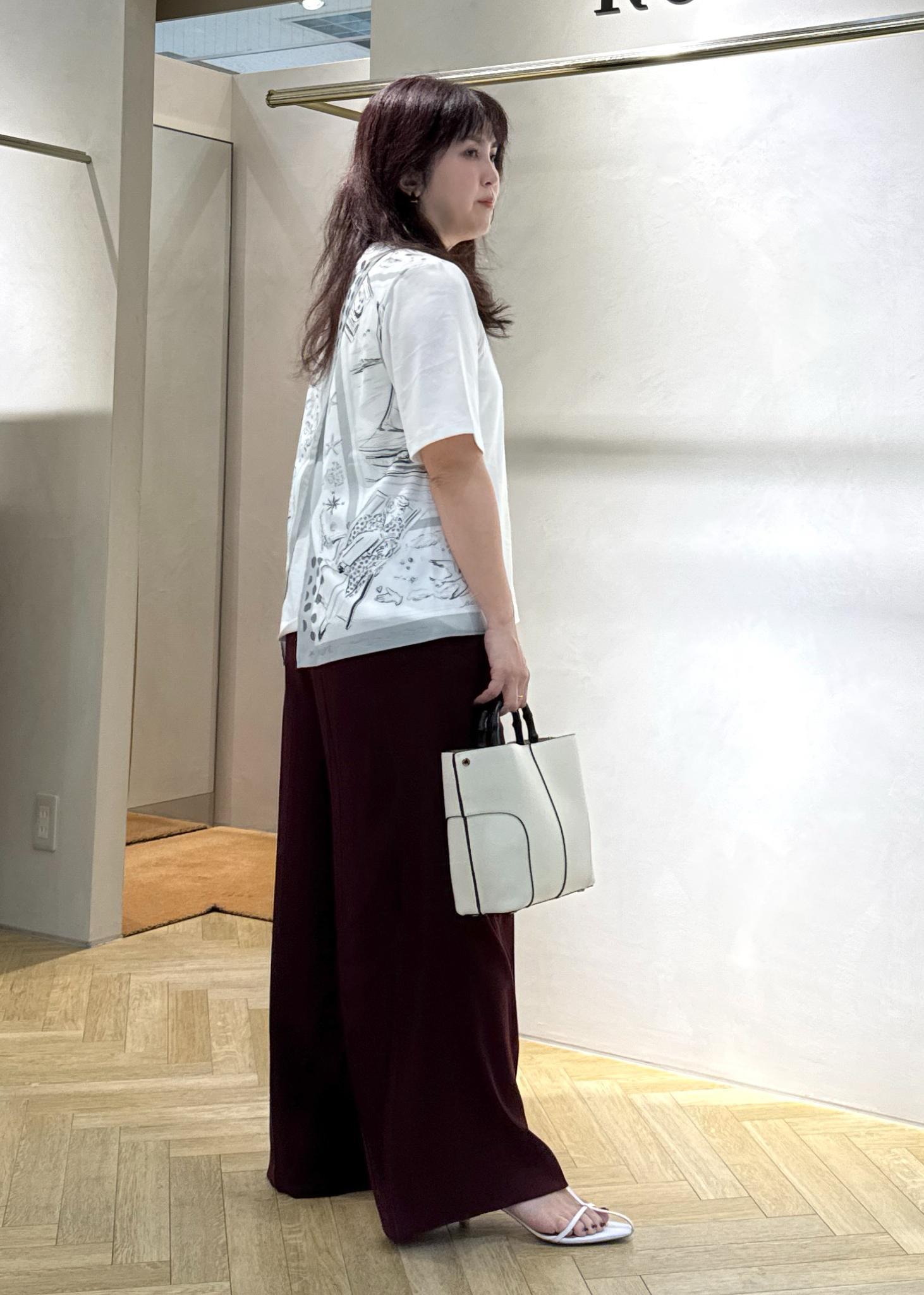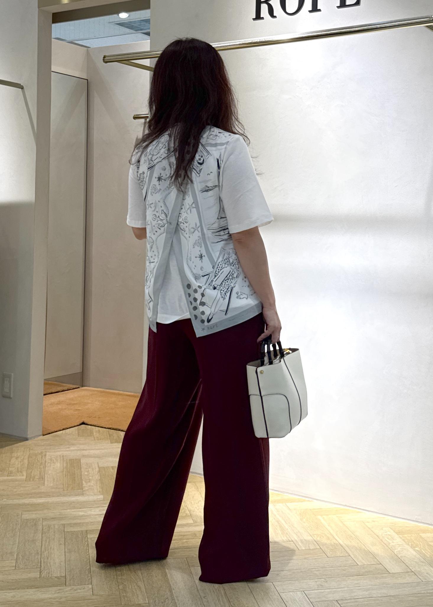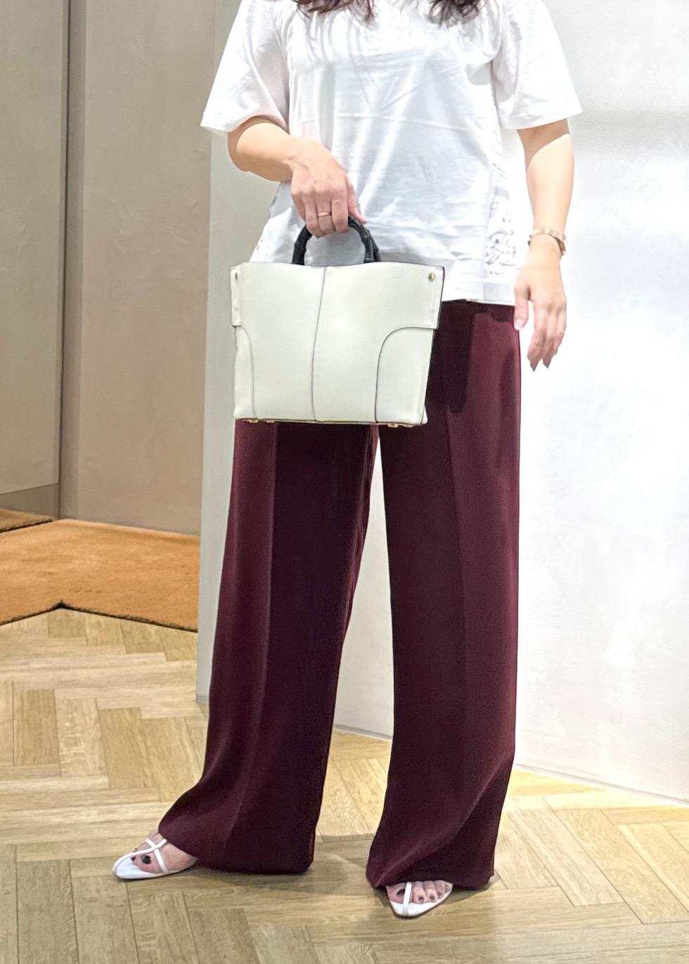 サラッと履ける秋カラーのボトムと合わせて少しの先取り感を楽しみながらジャストで着れるオススメスタイルです。