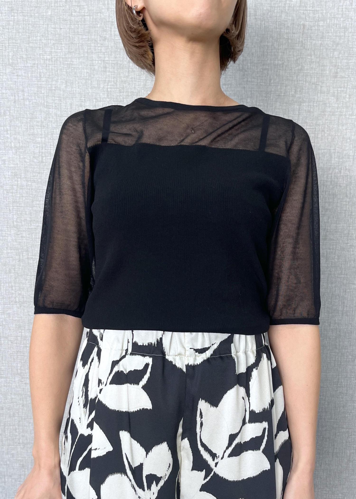 胸上は透け感がしっかりとあり、胸元から下はリブになっており透け感なく安心して着用できます。 -