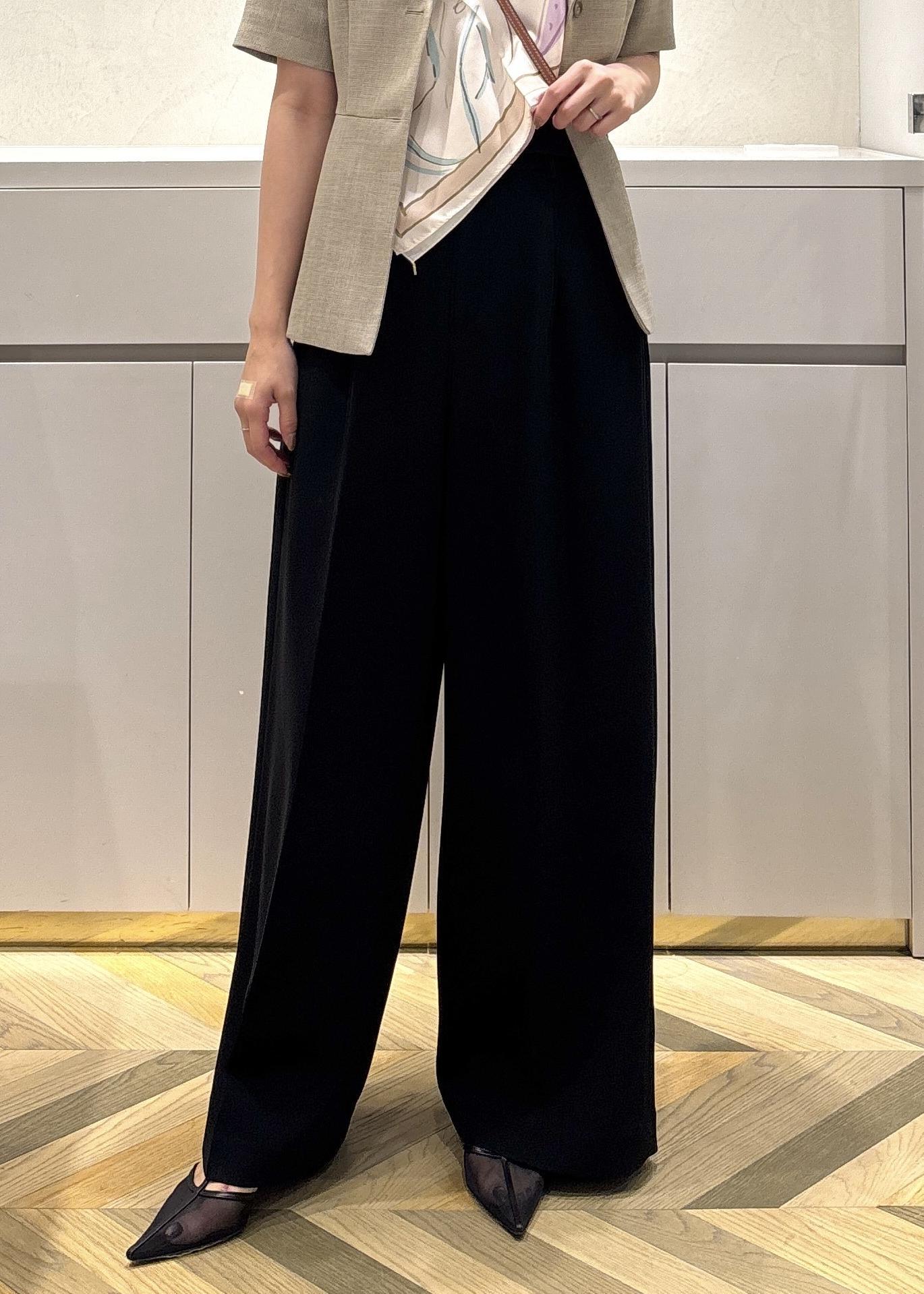 ROPÉ【洗える】ダブルクロスワイドパンツ(美人パンツ)ブラック / 38¥25,300レビュー通年着用可能な素材感で、柔らかさとシワになりにくい点が特徴。ワンタックで裾にかけてゆるやかなワイド、落ち感があり動きやすいです。全体的なサイズ感は少しゆったりに感じました。着丈は私の身長でぎりぎりフラットシューズが履ける長さ。