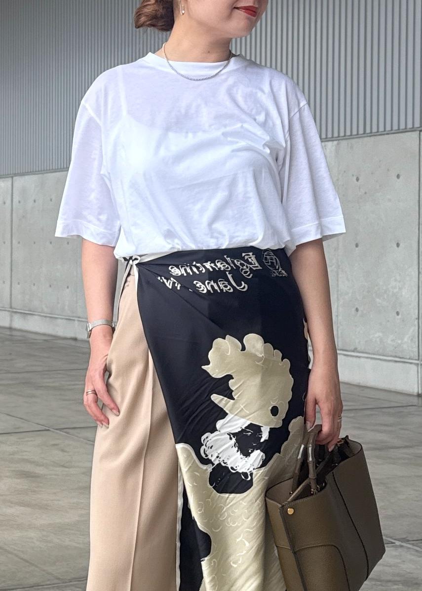 着丈は長めで、身幅もゆったりとリラックス感のあるサイズ感なので、体のラインを拾わずノンストレスで暑い夏に快適なTシャツです。 -