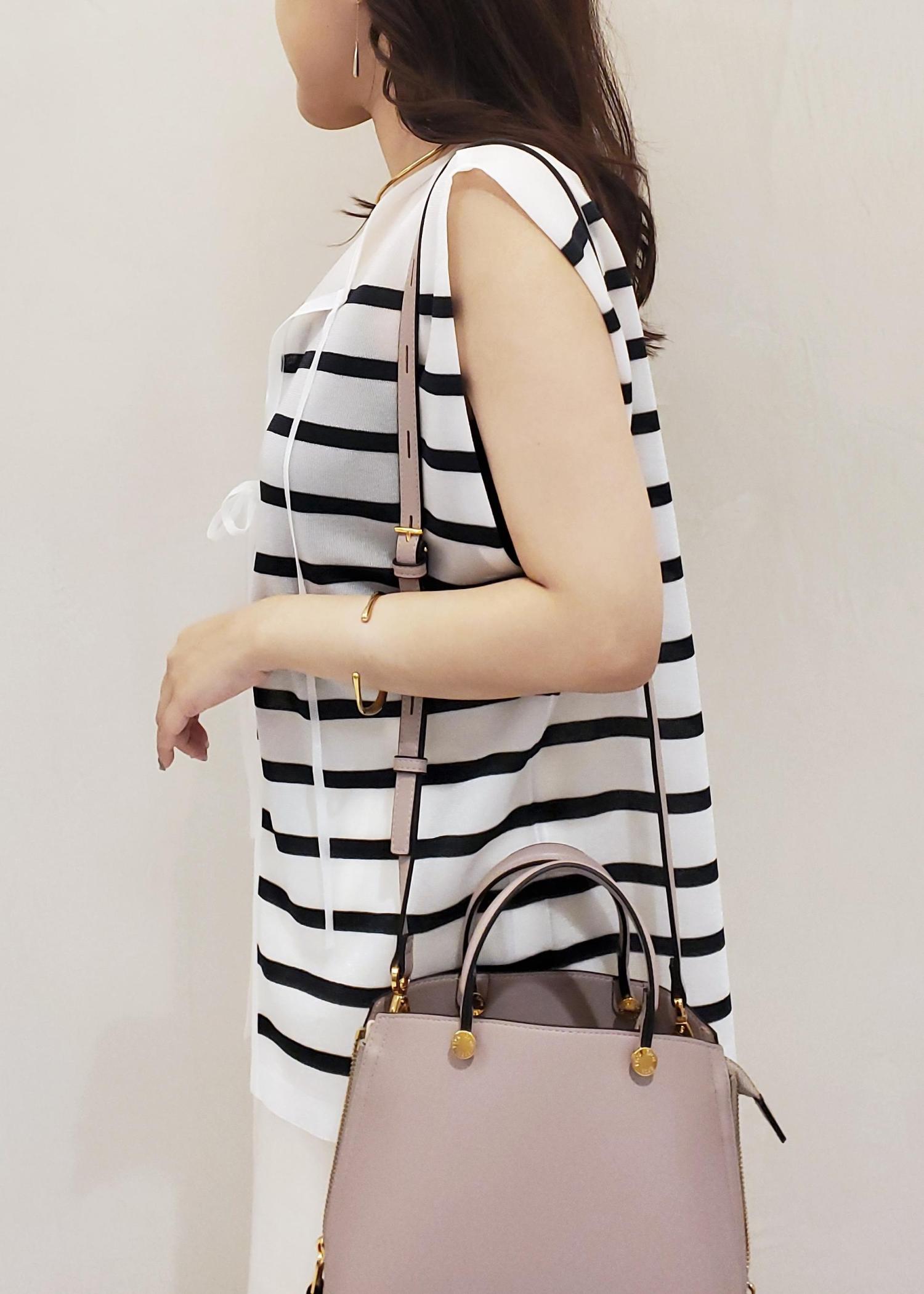 アウトレットROPÉシャイニー2WAYリボンブラウス/洗えるネイビー / F¥8,800レビューシアー感のあるニット素材。さらっとしていてしわになりにくく、ハリ感のある生地なのでボディラインを拾いにくいです。