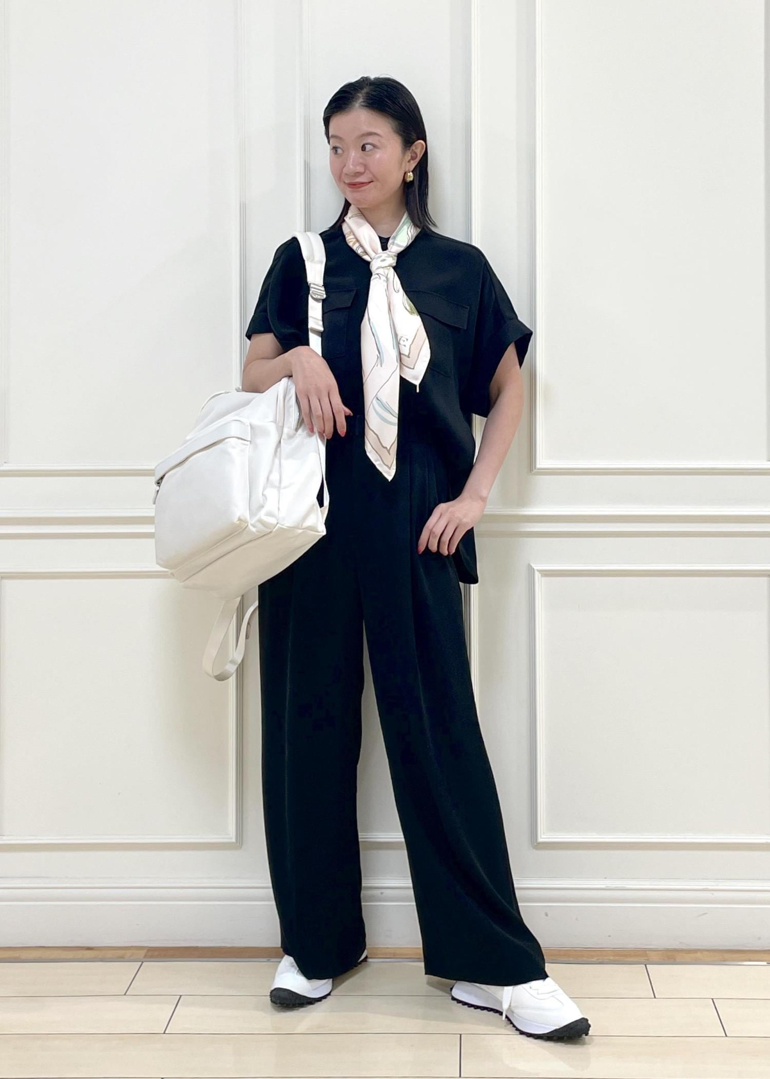 【YUKO SAEKI for ROPE'・コラボ】スカーフのみ柄アイテムを取り入れ、シンプルなコーディネートのポイントとしたスタイリングです。