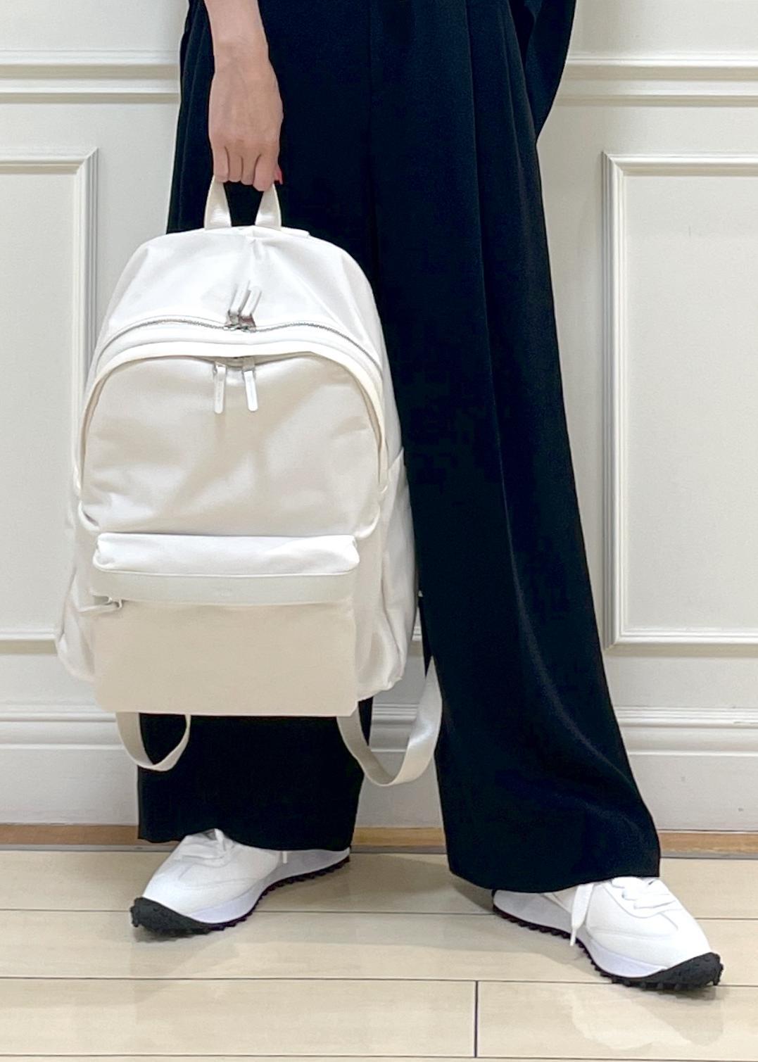 リュックに、スニーカーでスポーティーな小物を合わせましたが、アイテムのカラーはホワイトで統一し、綺麗目+清潔感を意識してみました♫