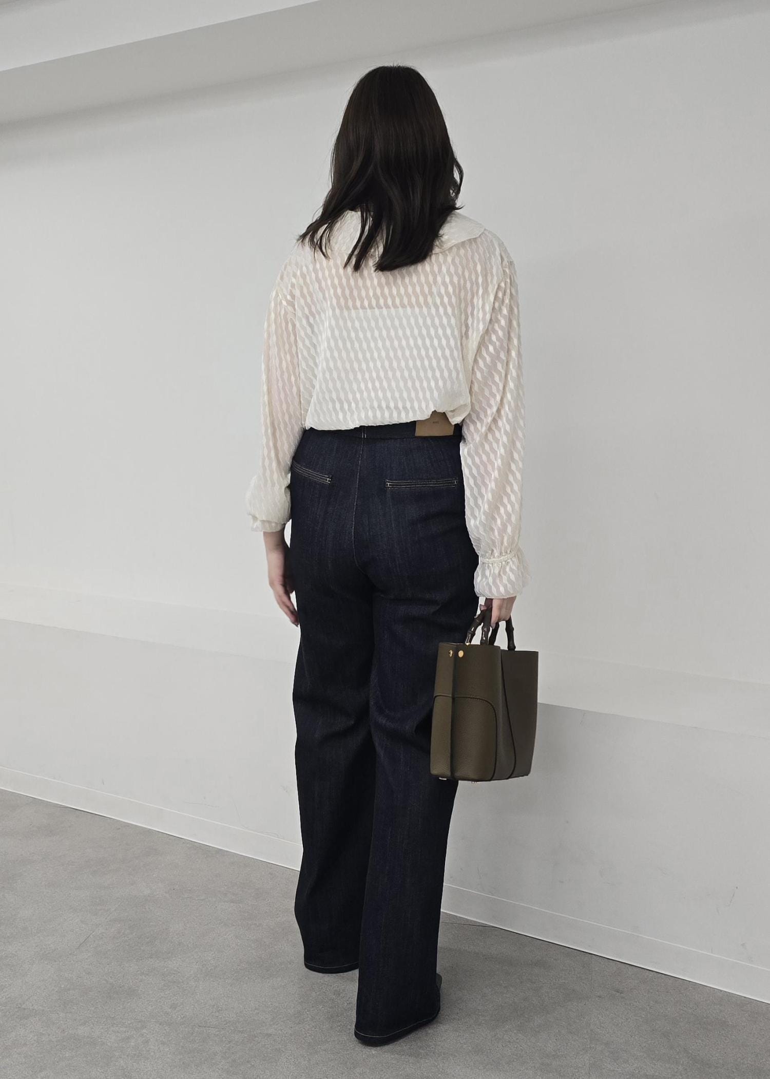 ROPÉストレッチデニム セーラーパンツ/イージーケアネイビー系 / 38¥30,800レビュー38サイズ着用で、ヒール有りのブーツを履くと地面につかない丈感でした。