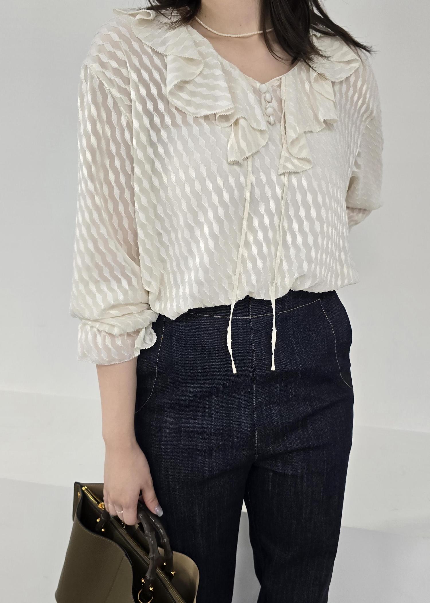 ROPÉ【洗える】ラッフルVネックブラウス(ジャガード/リーフプリント)【WEB・一部店舗限定】オフホワイト / F¥19,800レビュー袖丈長めで落ち感が素敵なブラウス。