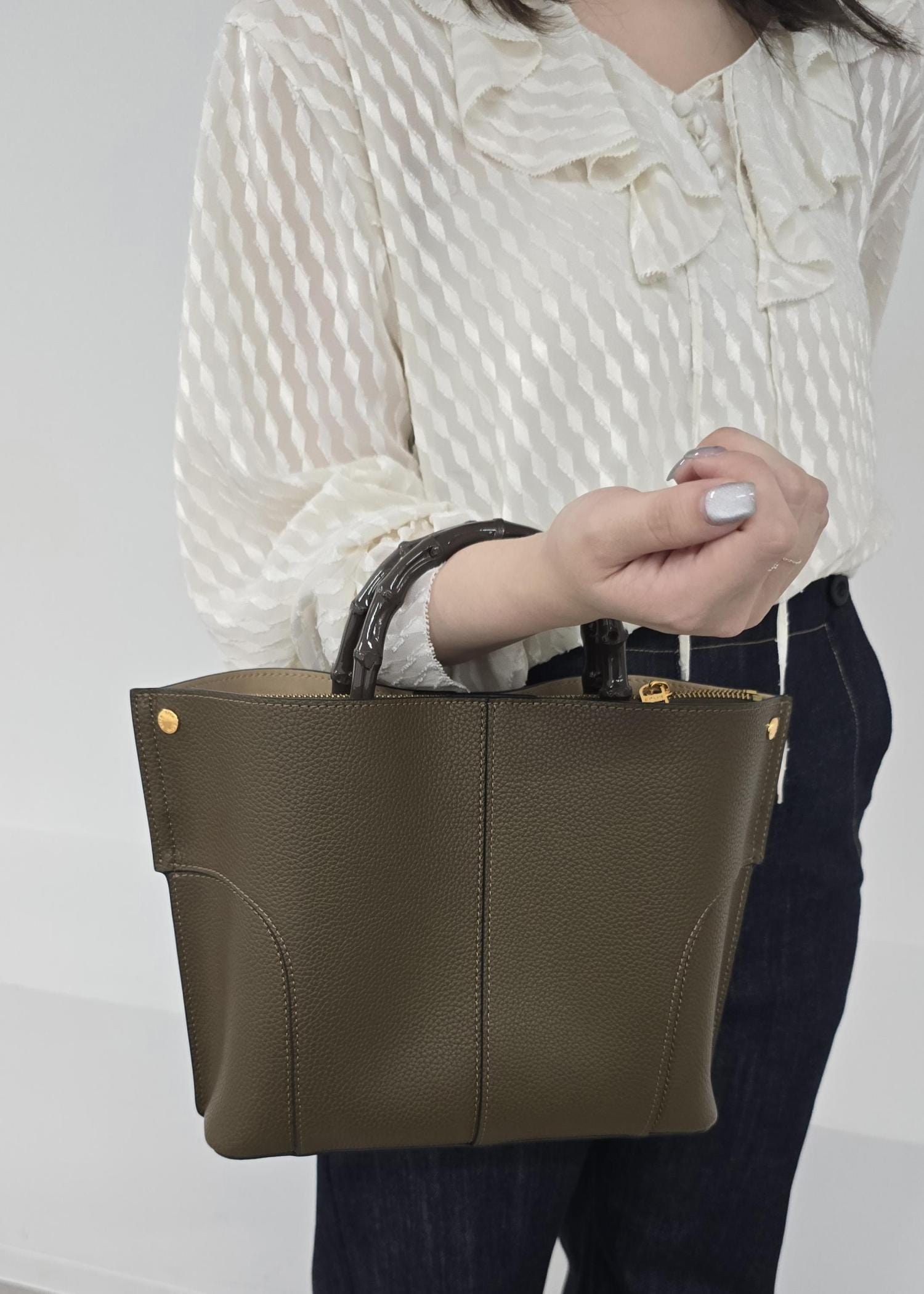 ROPÉ【E'POR】BAMBOO BAG Medium【超軽量】【25AW】カーキ / F¥18,700レビュー普段のお手荷物(ミニ財布、ハンカチ、スマホ、カギ、リップ等)に加えて小さめの折り畳み傘や500ミリのペットボトルも入るサイズ感です。