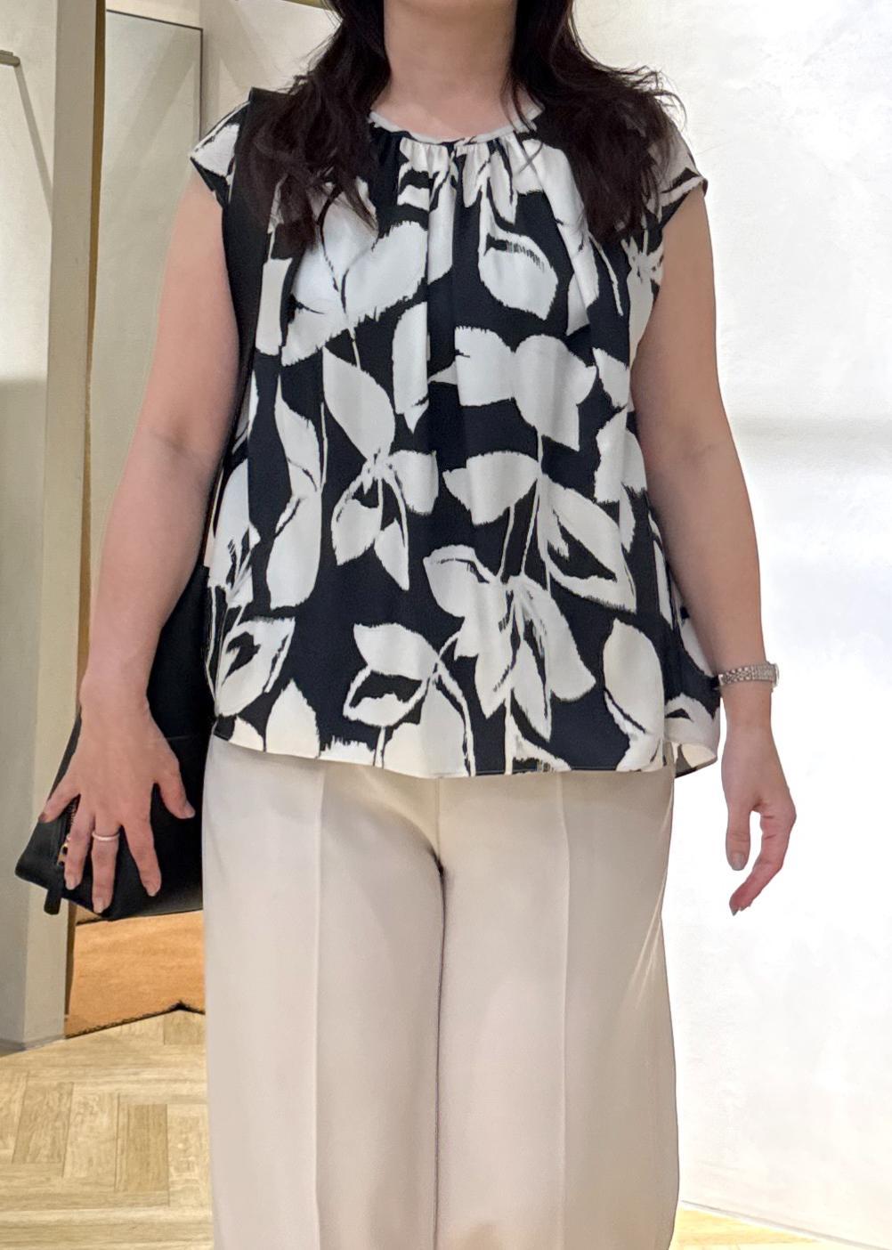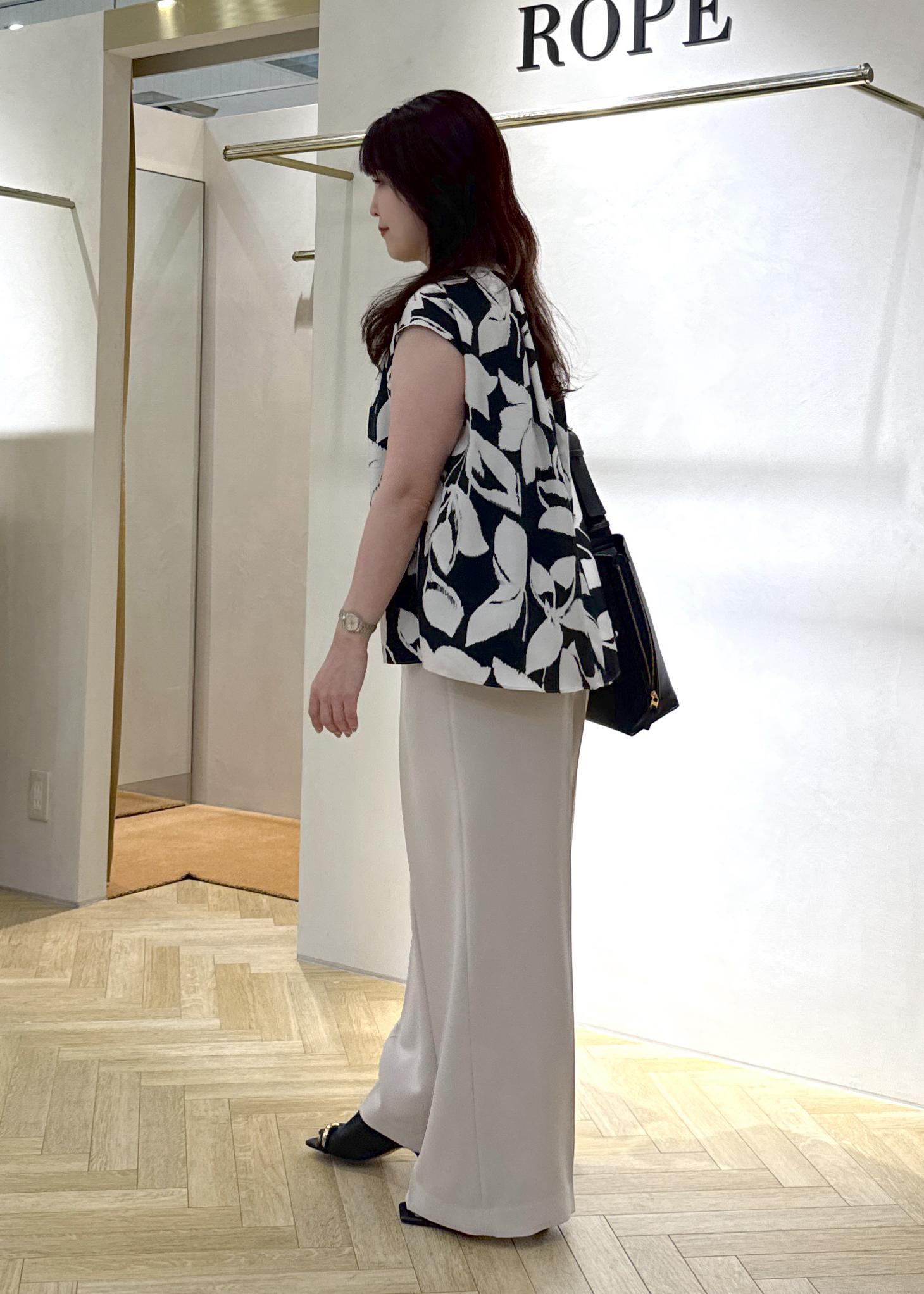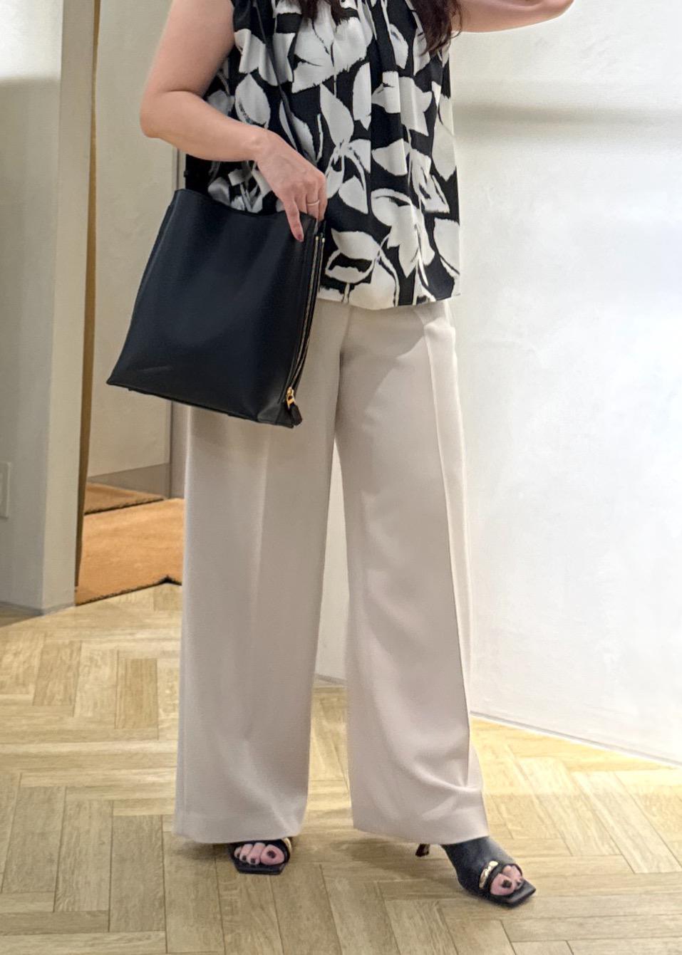 華やかな柄ブラウスに柔らかいベージュのワイドパンツを合わせ上品な印象のスタイルにしました。