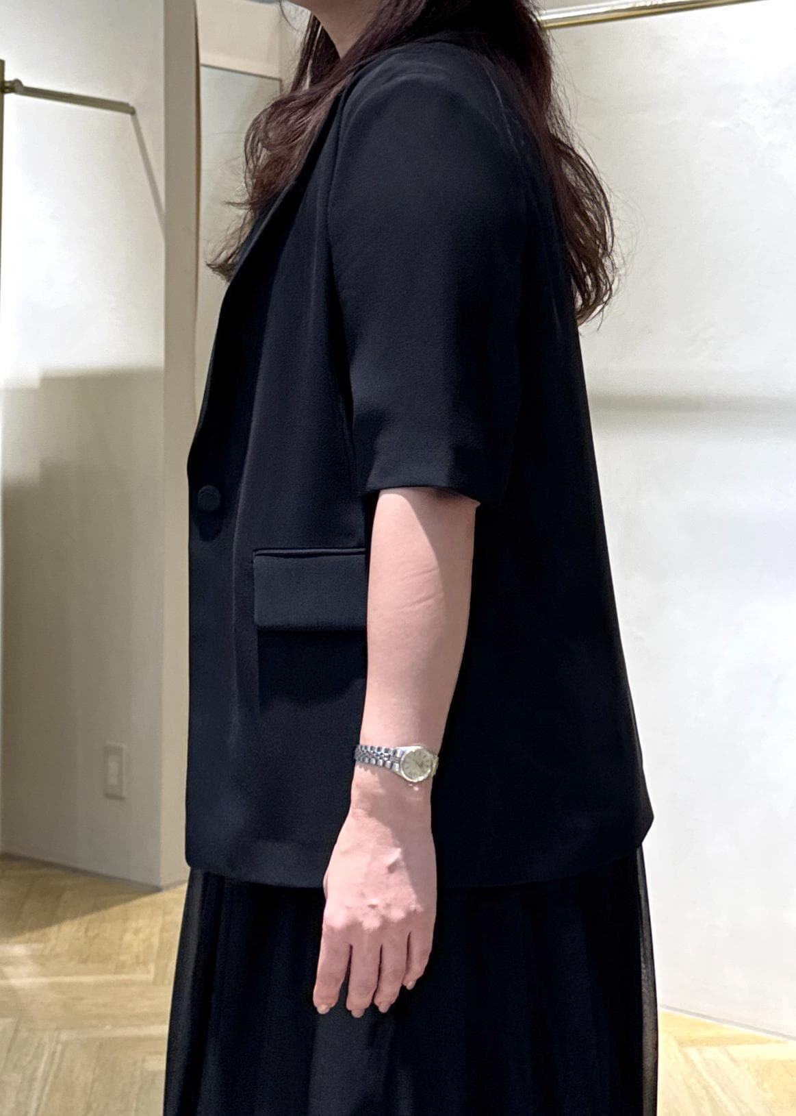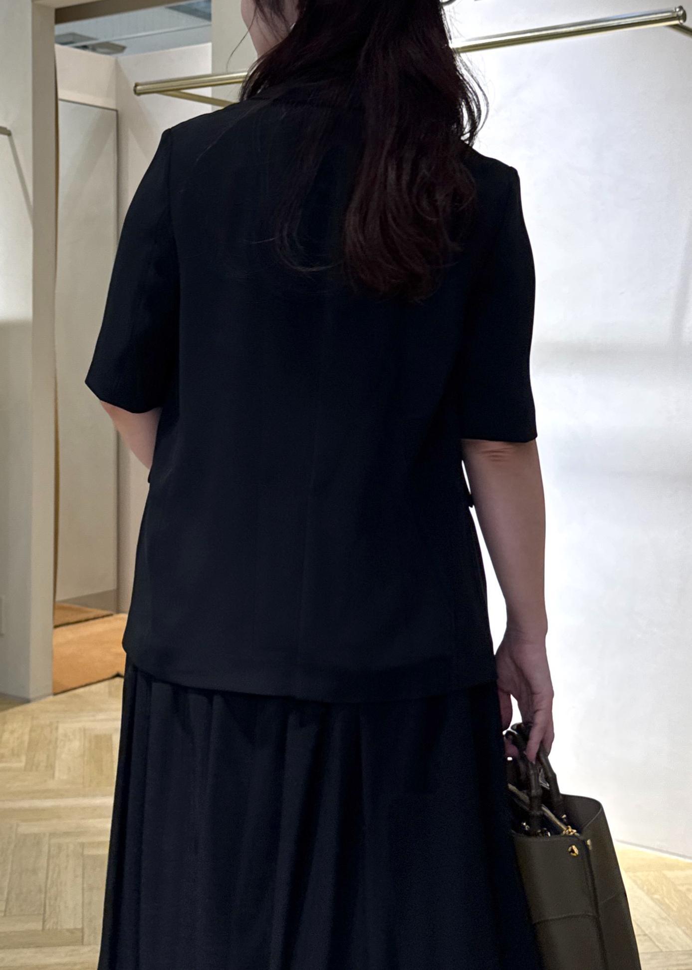 ROPÉ【洗える・カセット服・新色追加】トリアセバックサテン ハーフスリーブジャケット/セットアップ対応ブラック /¥31,900レビュー38サイズを着用しています。
