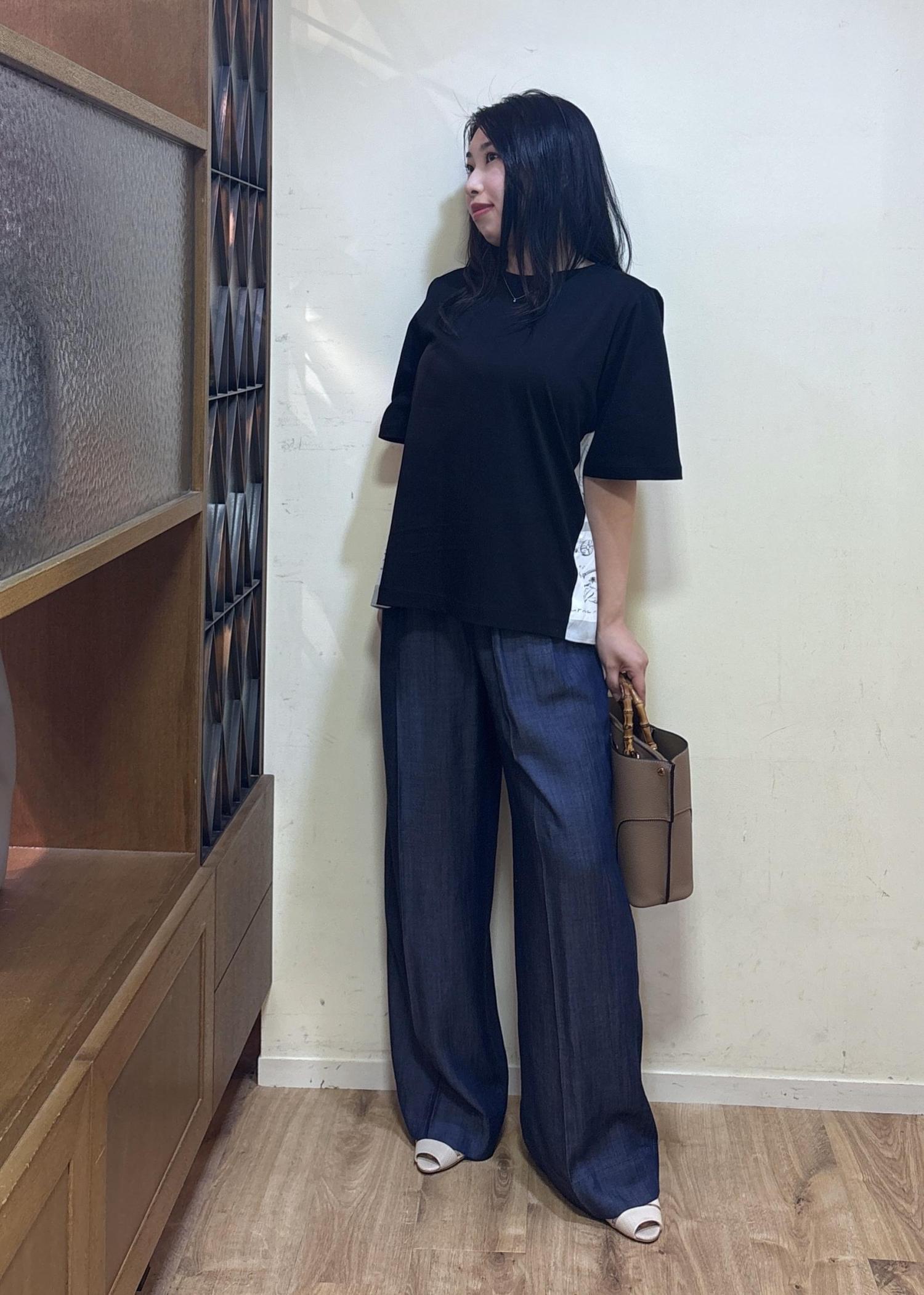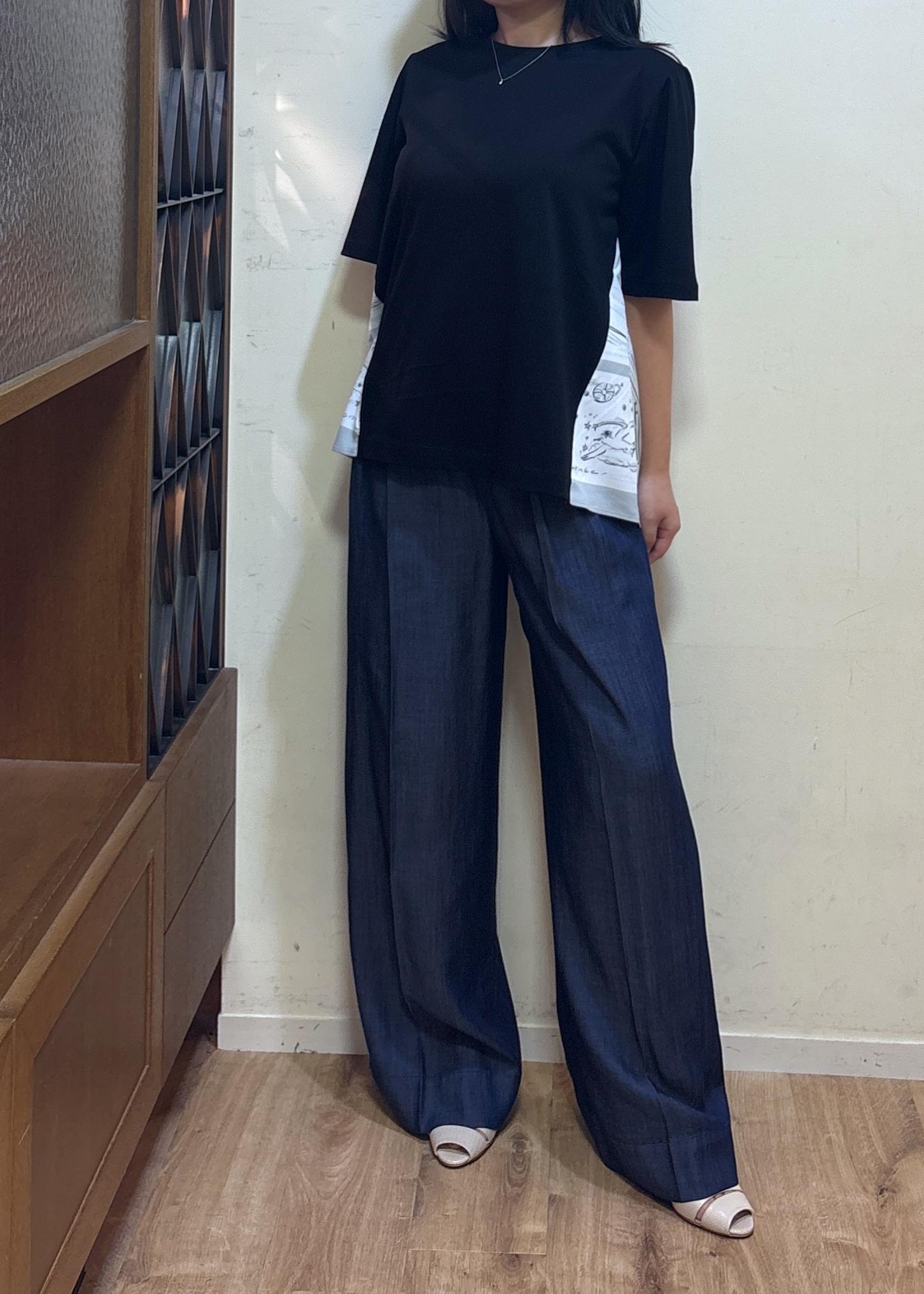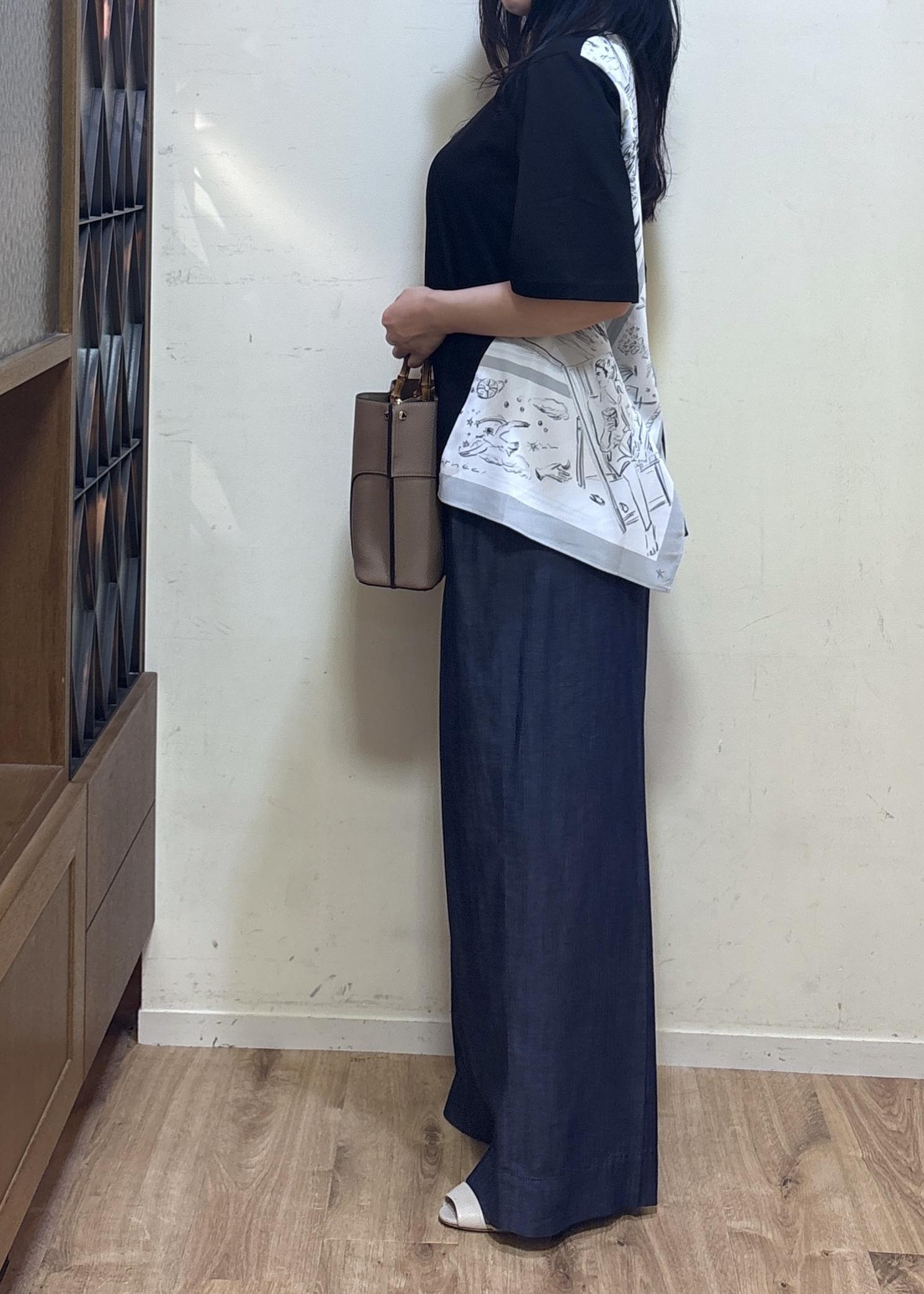 着丈は高めのヒールを合わせて履いていますので、合わせる靴によっては丈のお直しを見ていただけたらと思います。