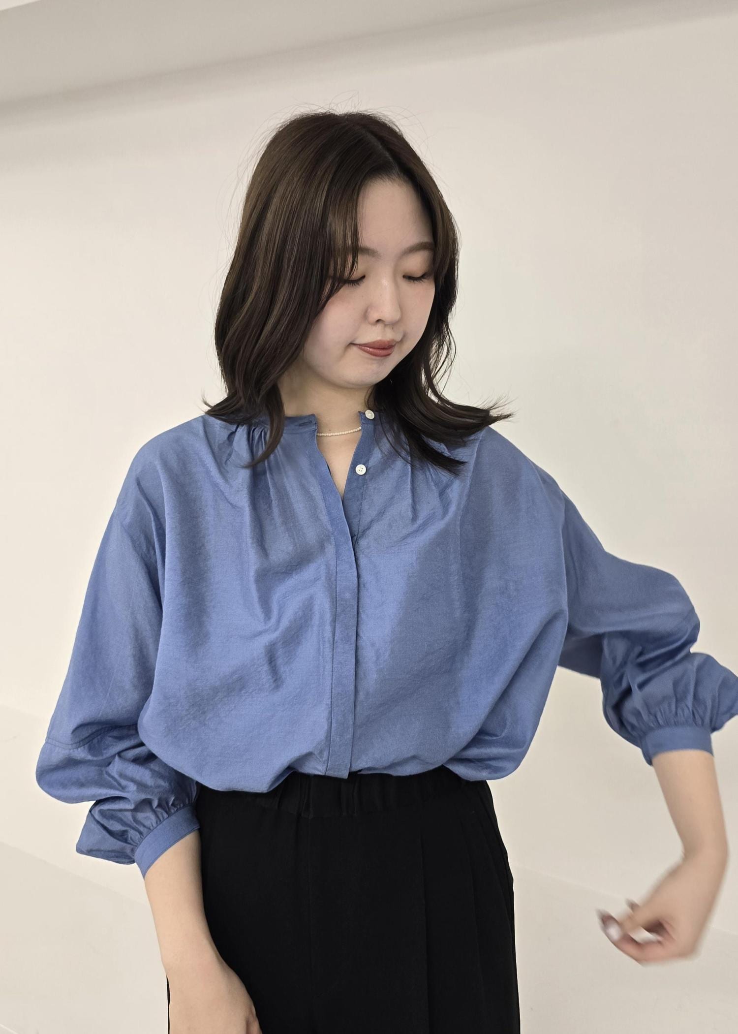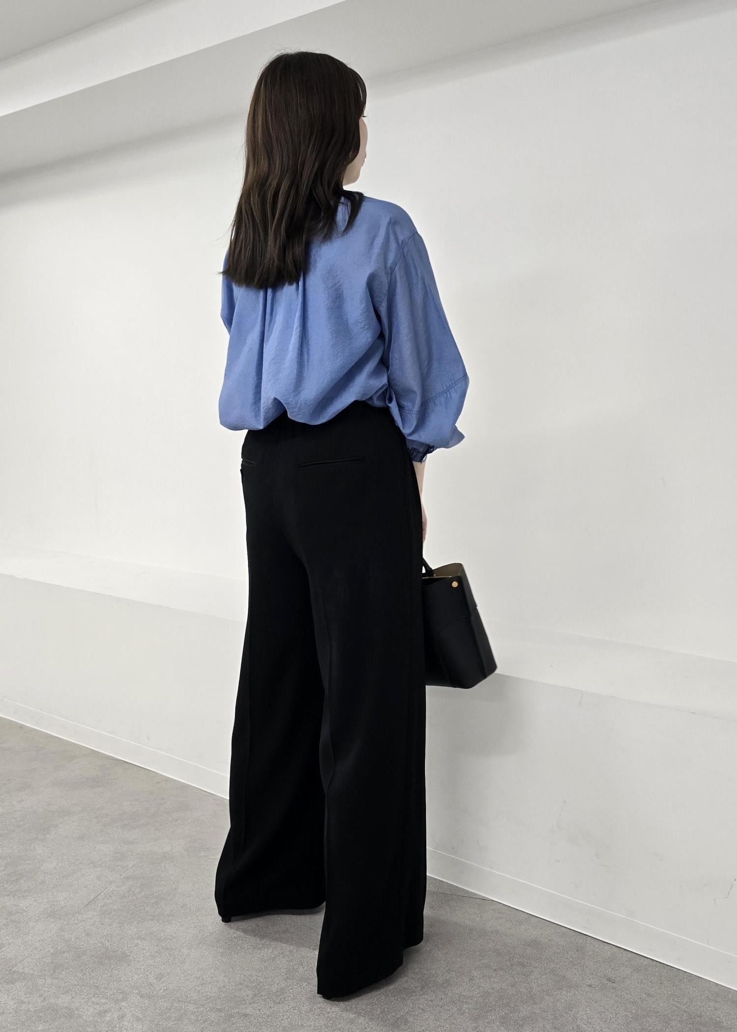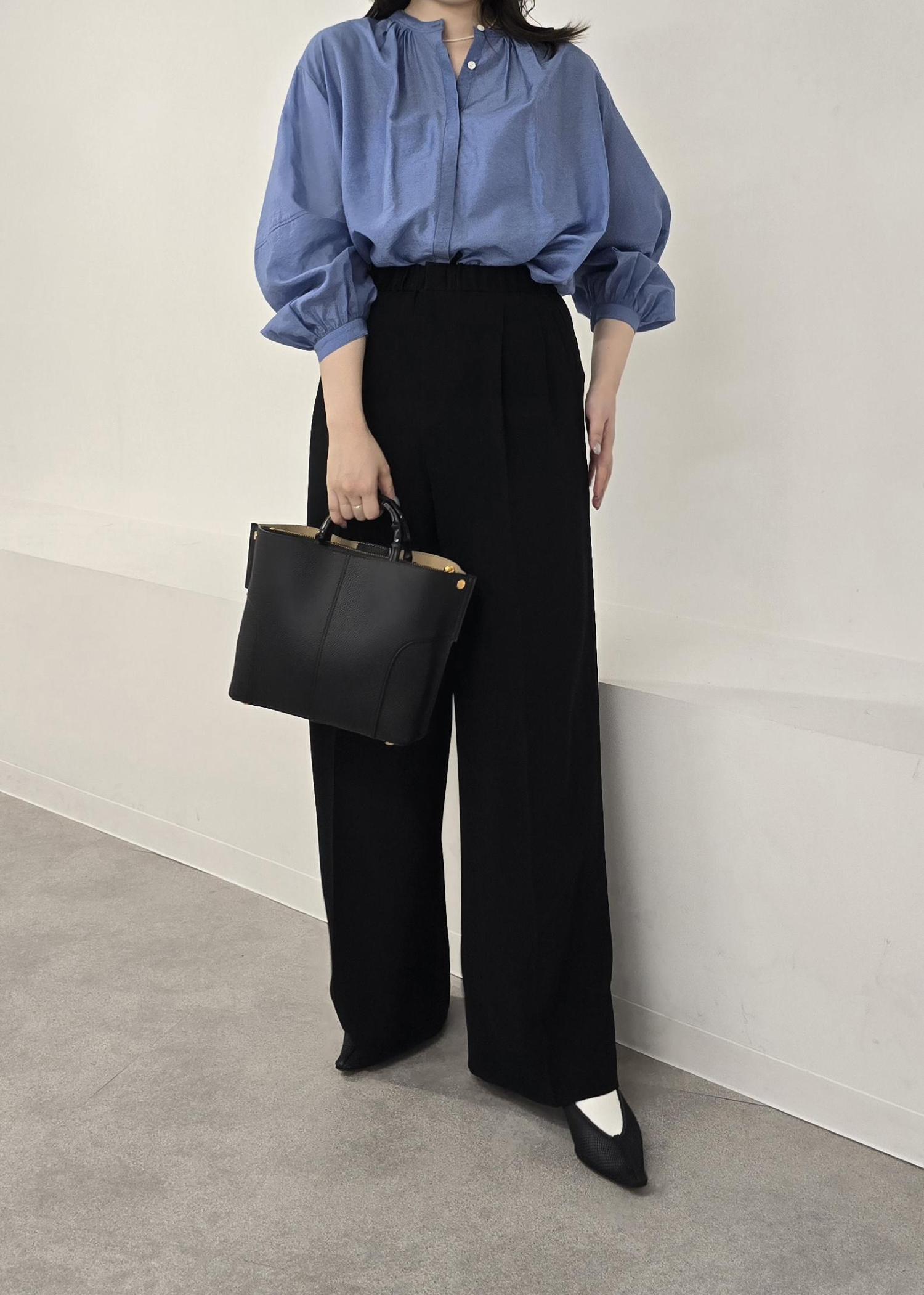 ROPÉキュプラシルクボリュームスリーブブラウス/イージーケアブルー系 / F¥19,800レビュー着丈はヒップ隠れる丈感で、パンツにもスカートにも合わせやすいシルエットです◌