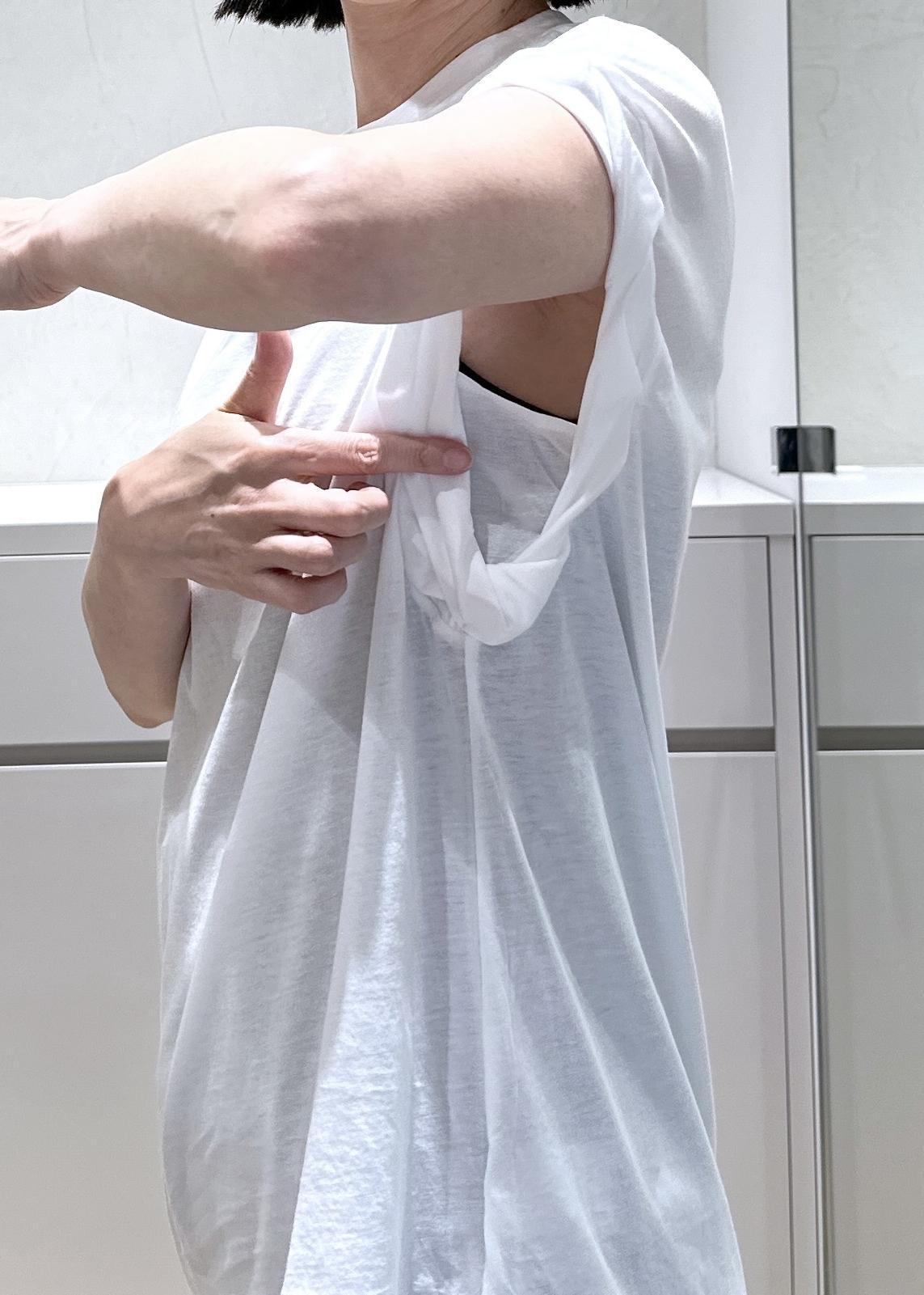 ゆったりしたアームホールには、布が着いているので、インナーが見えにくくなっています。 -