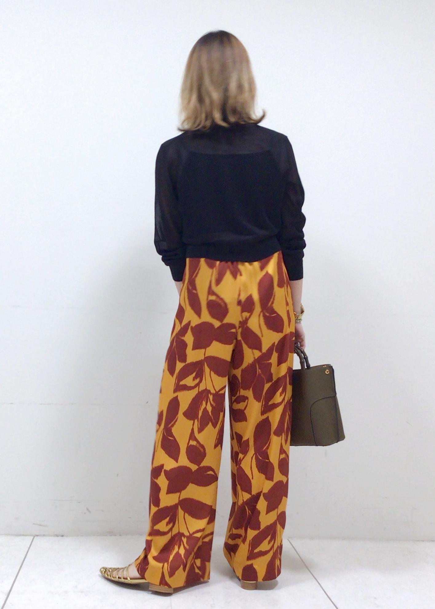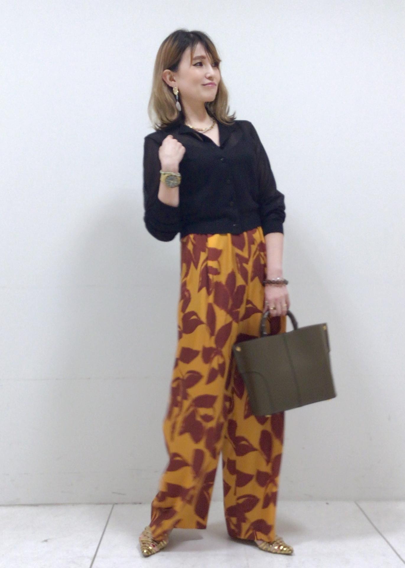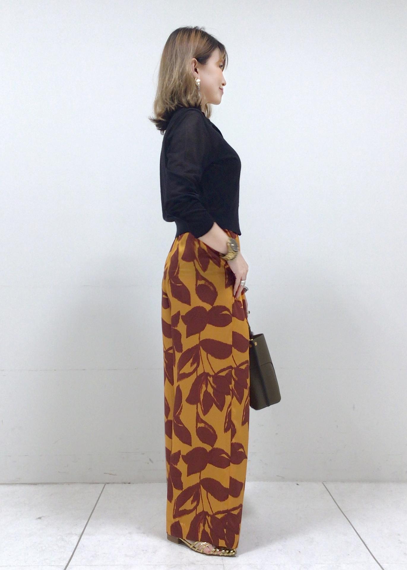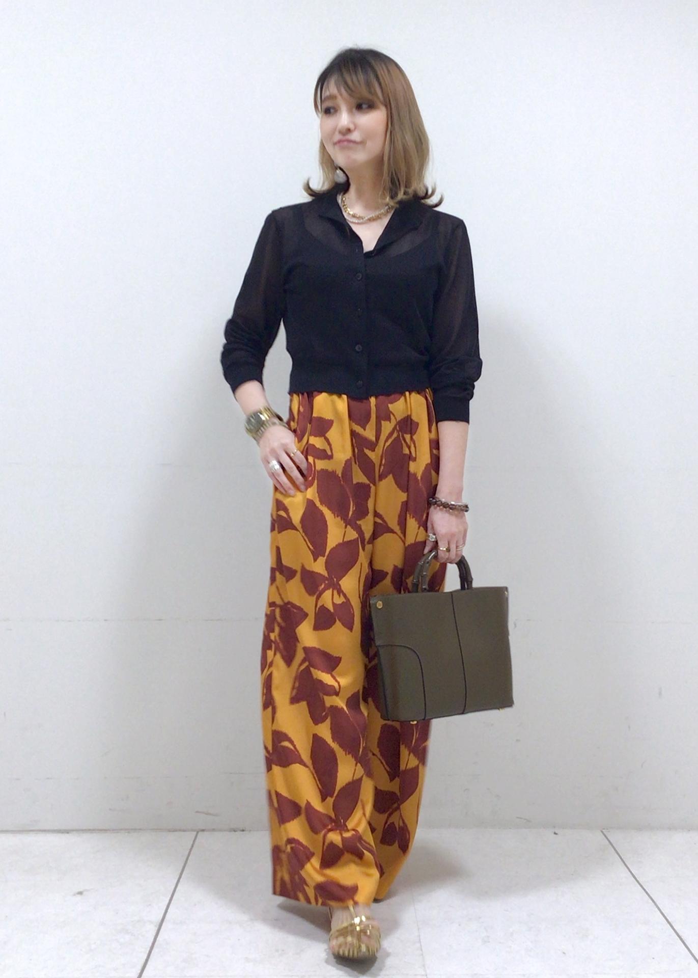 トップスはあえてシンプルなショート丈のカーディガンで合わせ、ボトムの印象を引き立てました☆