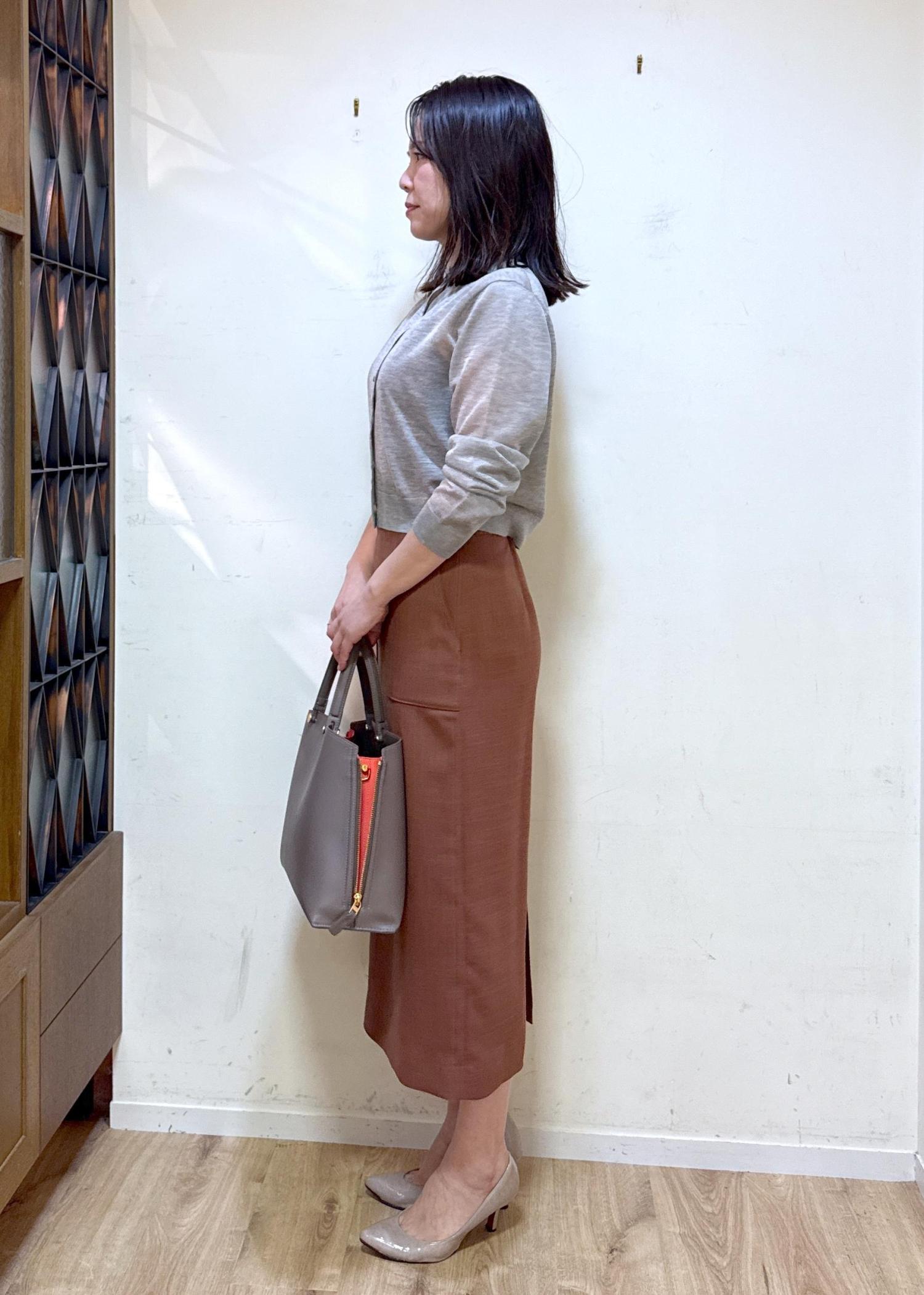 ロペで定番のポケット付きタイトスカートをシアーカーディガンで通勤スタイルにまとめました。
