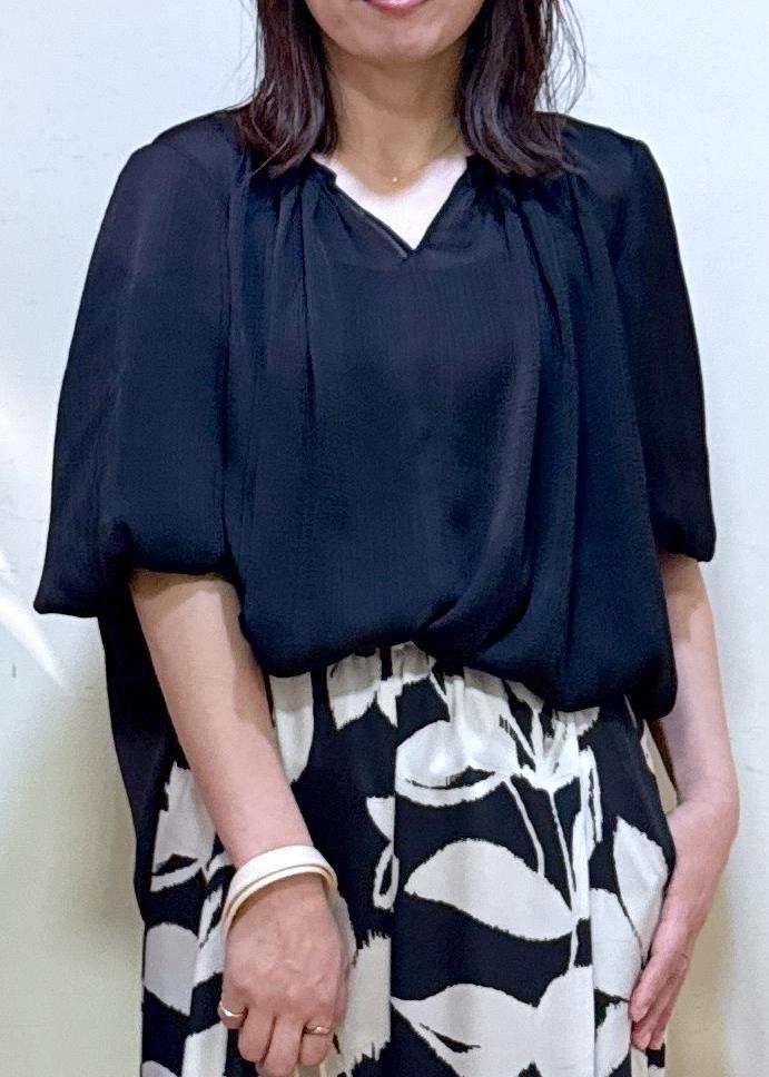 アウトレットROPÉ楊柳スキッパーブラウス/イージーケアブラック / F¥10,450レビュー163センチ Fサイズ着用