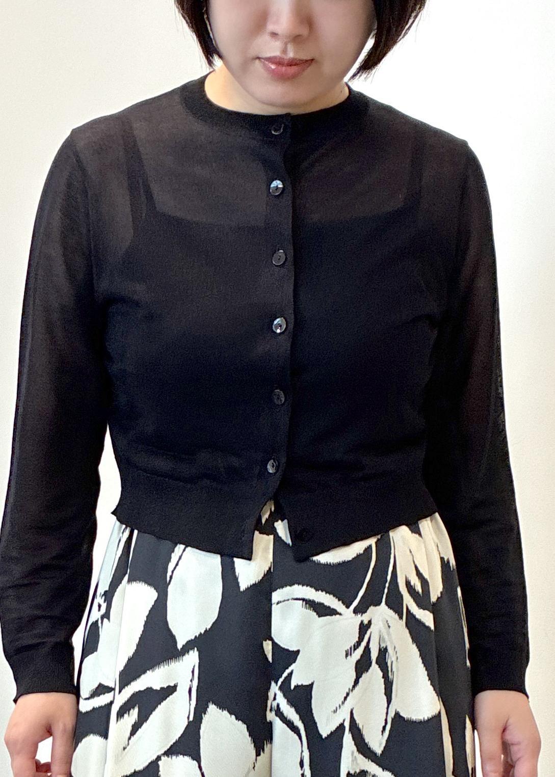 ほんのり光沢のある糸で仕立てた、シアー感のある上品なカーディガンです。