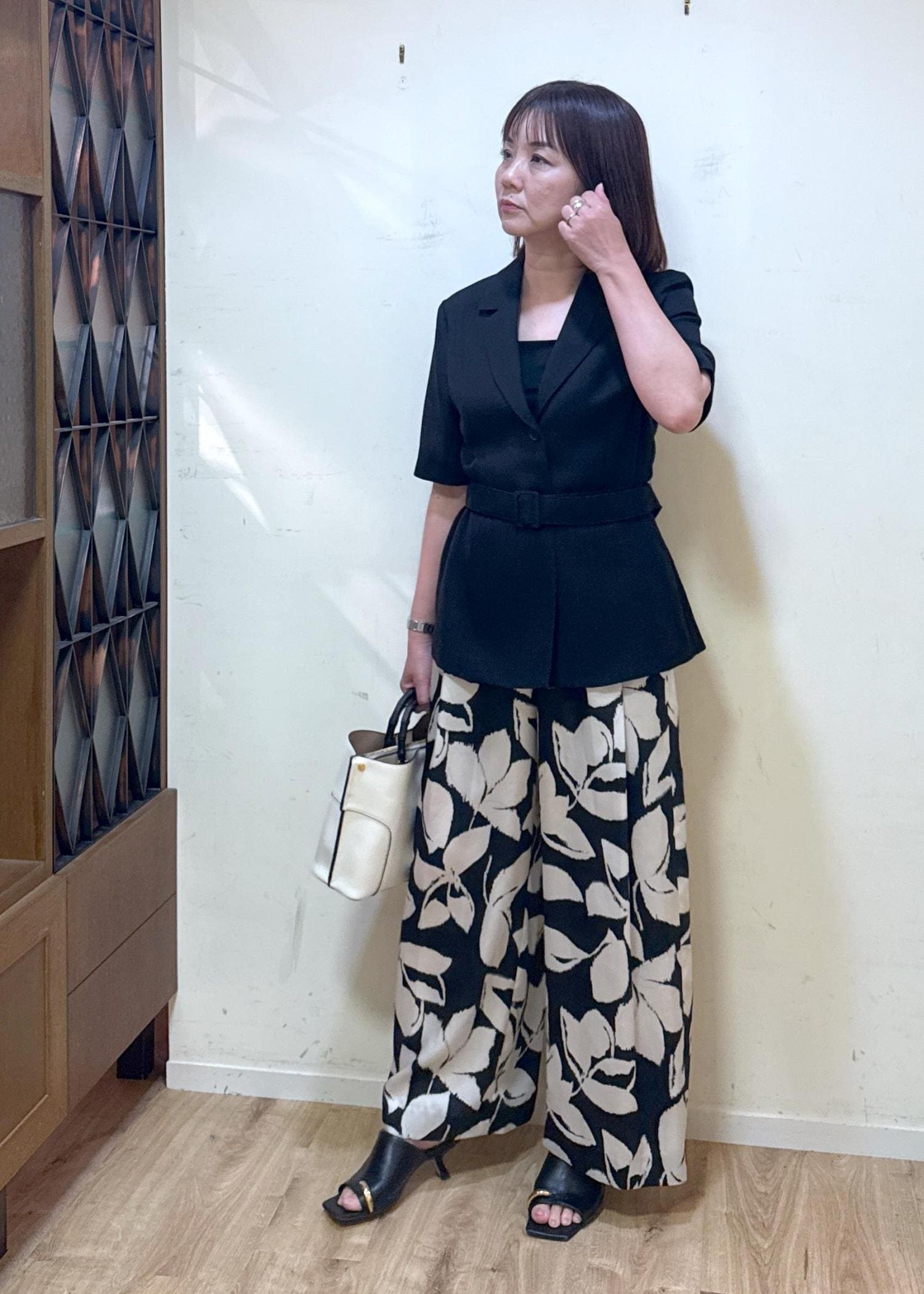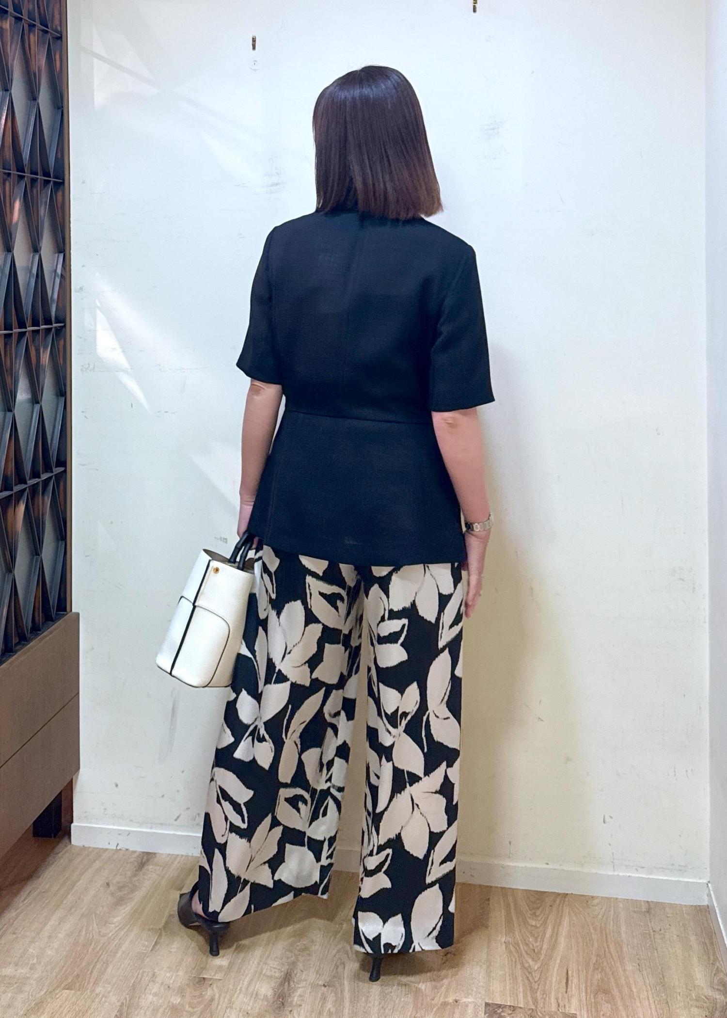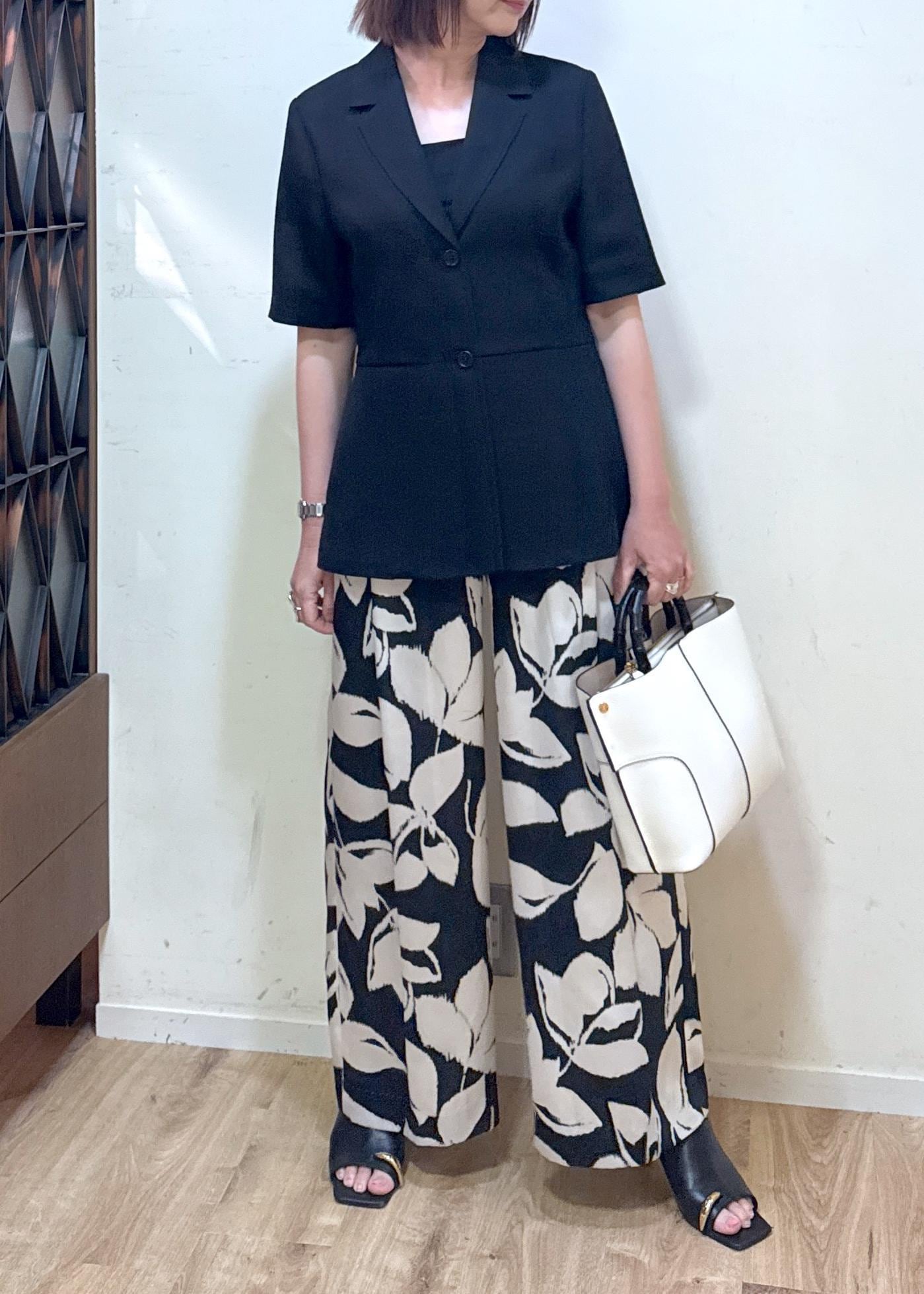モノトーンの大柄フラワーパンツにウエストマークできる半袖ジャケットで今から秋まで使えるスタイリング。