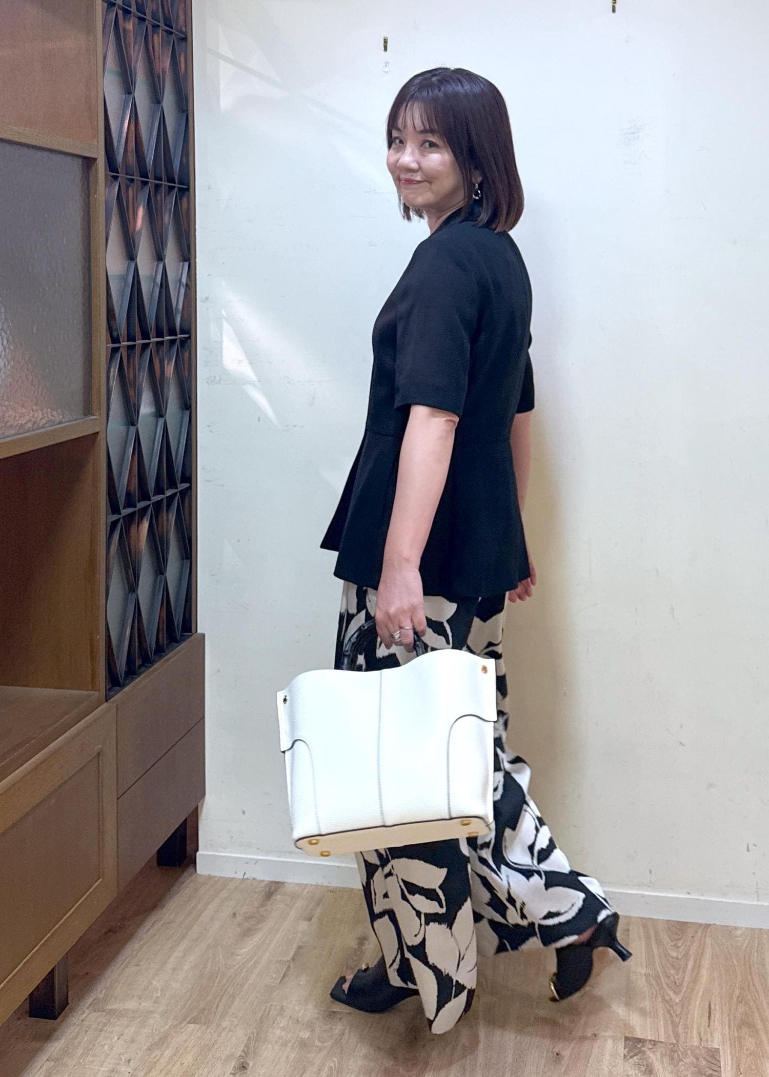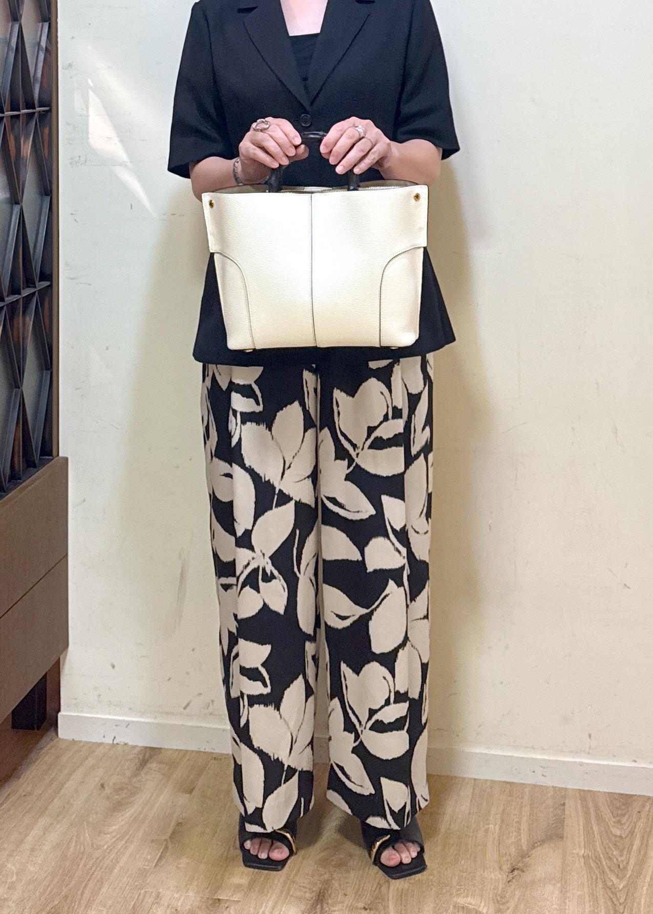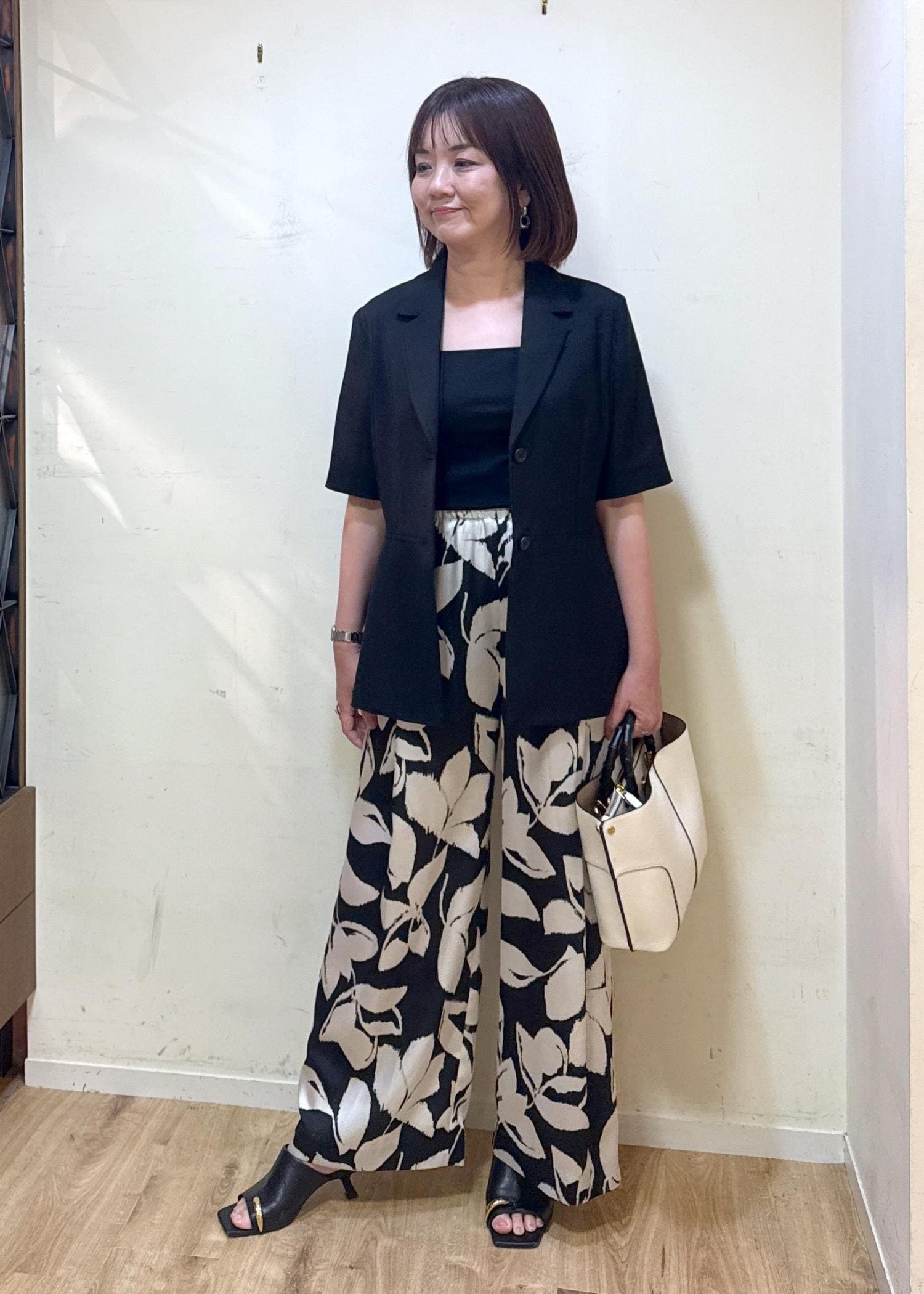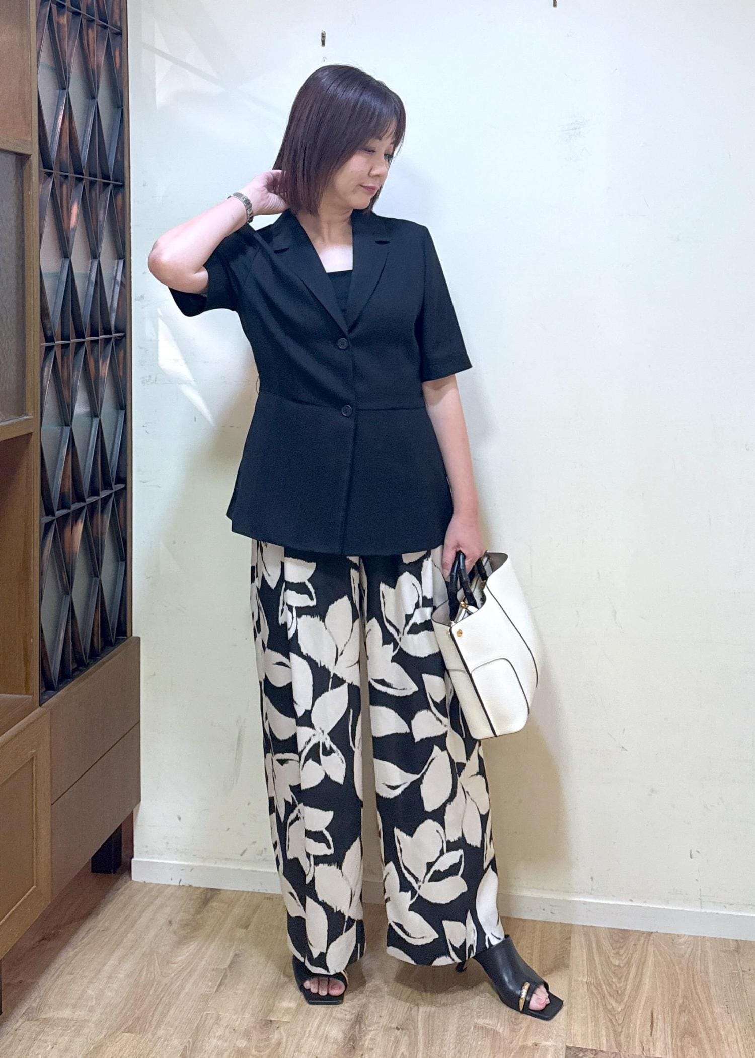 モノトーンの大柄フラワーパンツにウエストマークできる半袖ジャケットで今から秋まで使えるスタイリング。