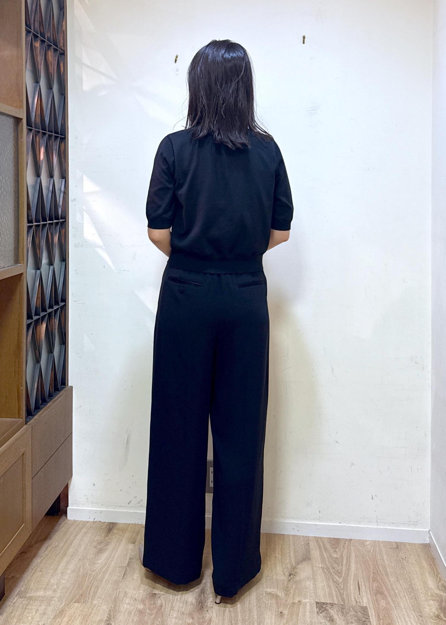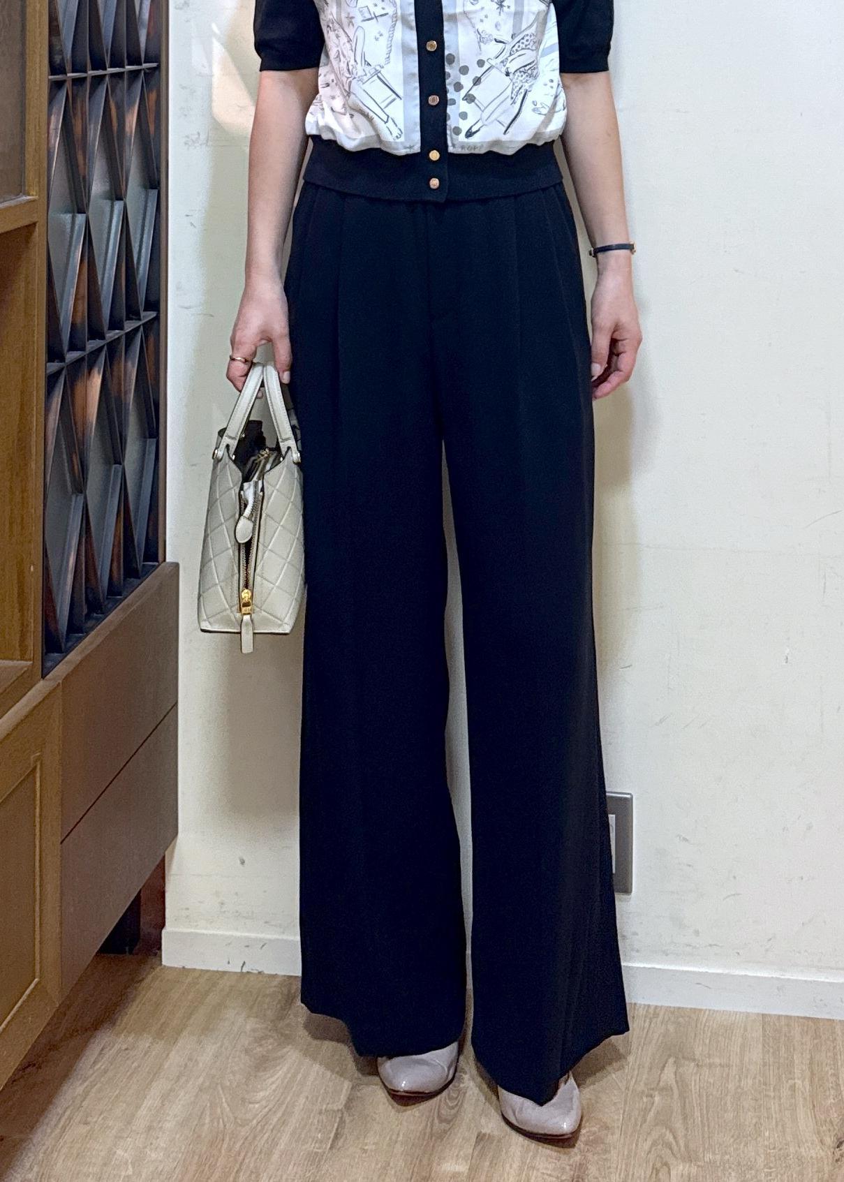ワイドパンツですが、生地も柔らかくシルエットも広がりすぎていないのでスッキリと履いていただけるパンツとなっております。