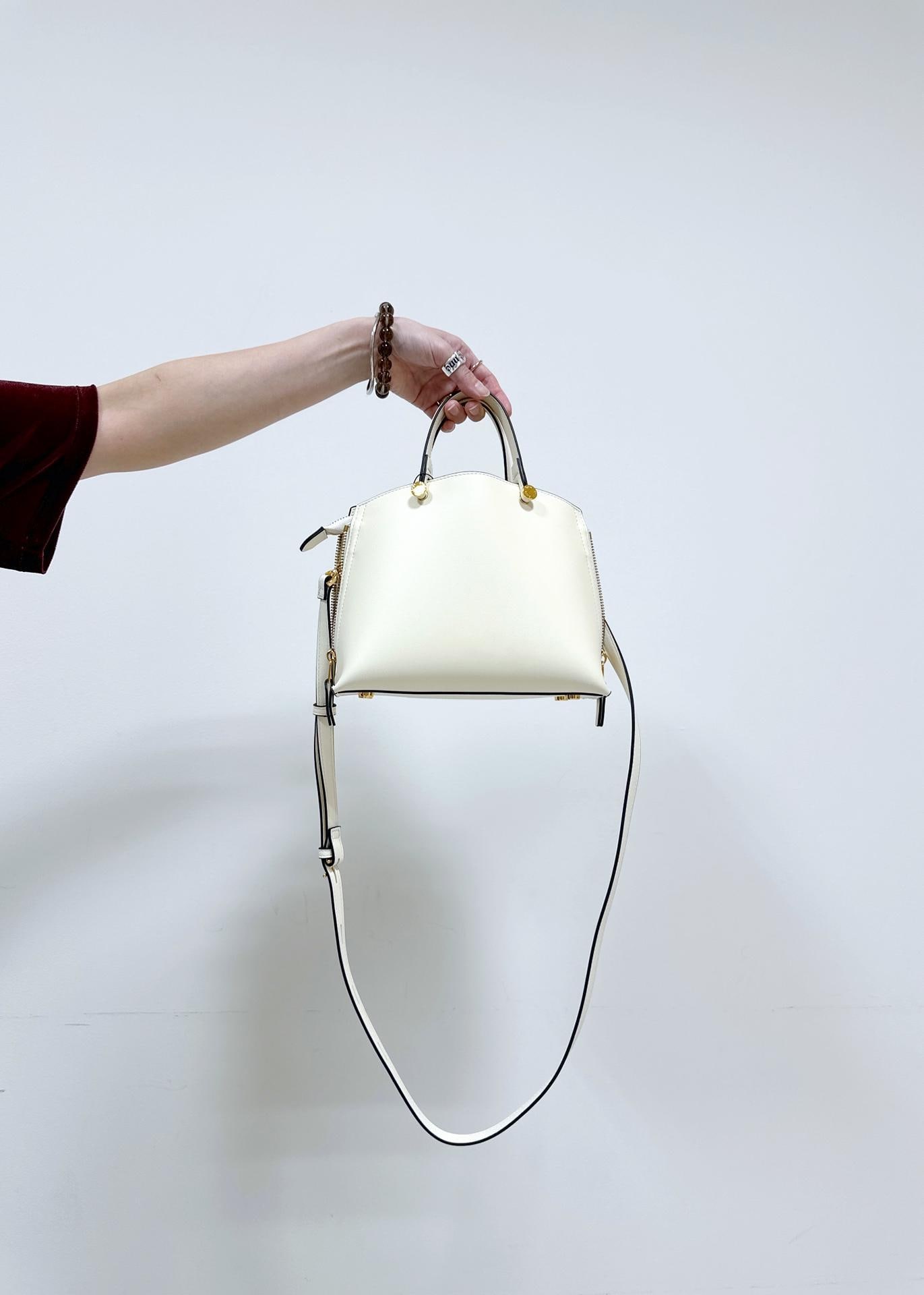 合皮素材で軽く、淡い色味でも汚れ等も軽く拭いてお手入れが出来、底面には鋲もついているので、ちょっと置きも気にならずに出来ちゃう優秀バッグです。