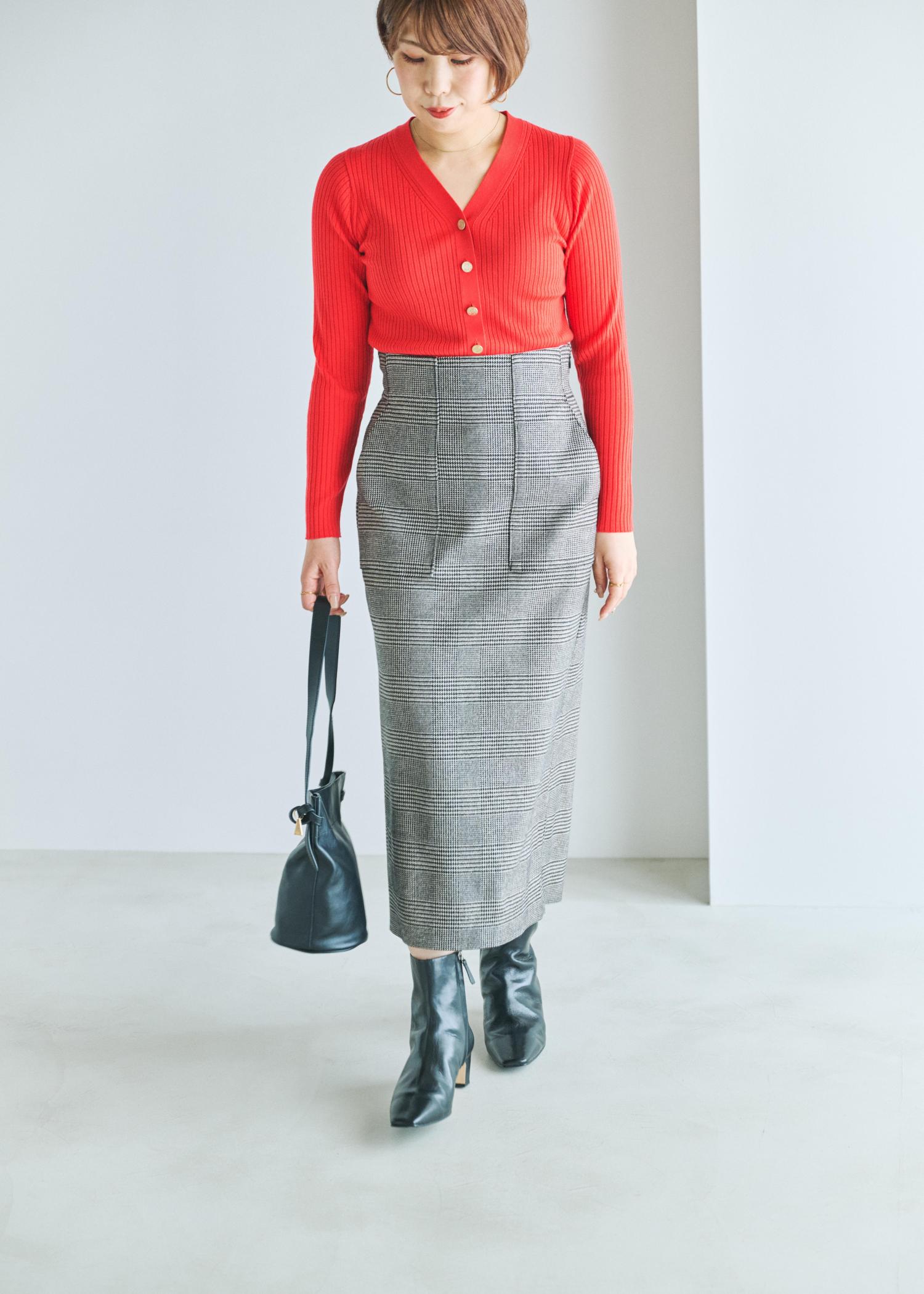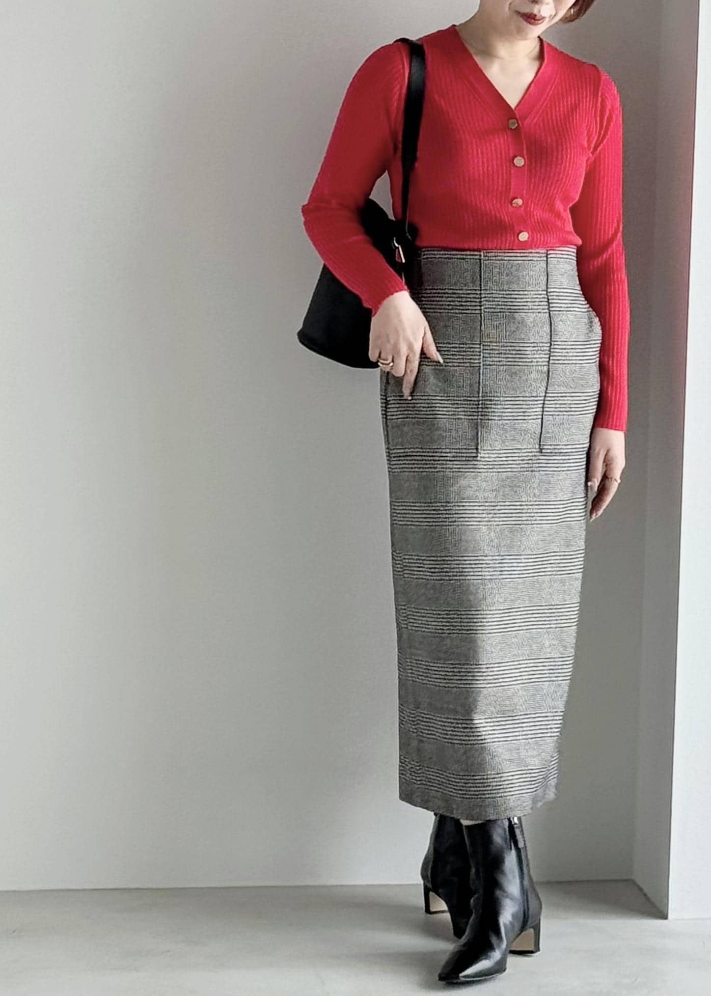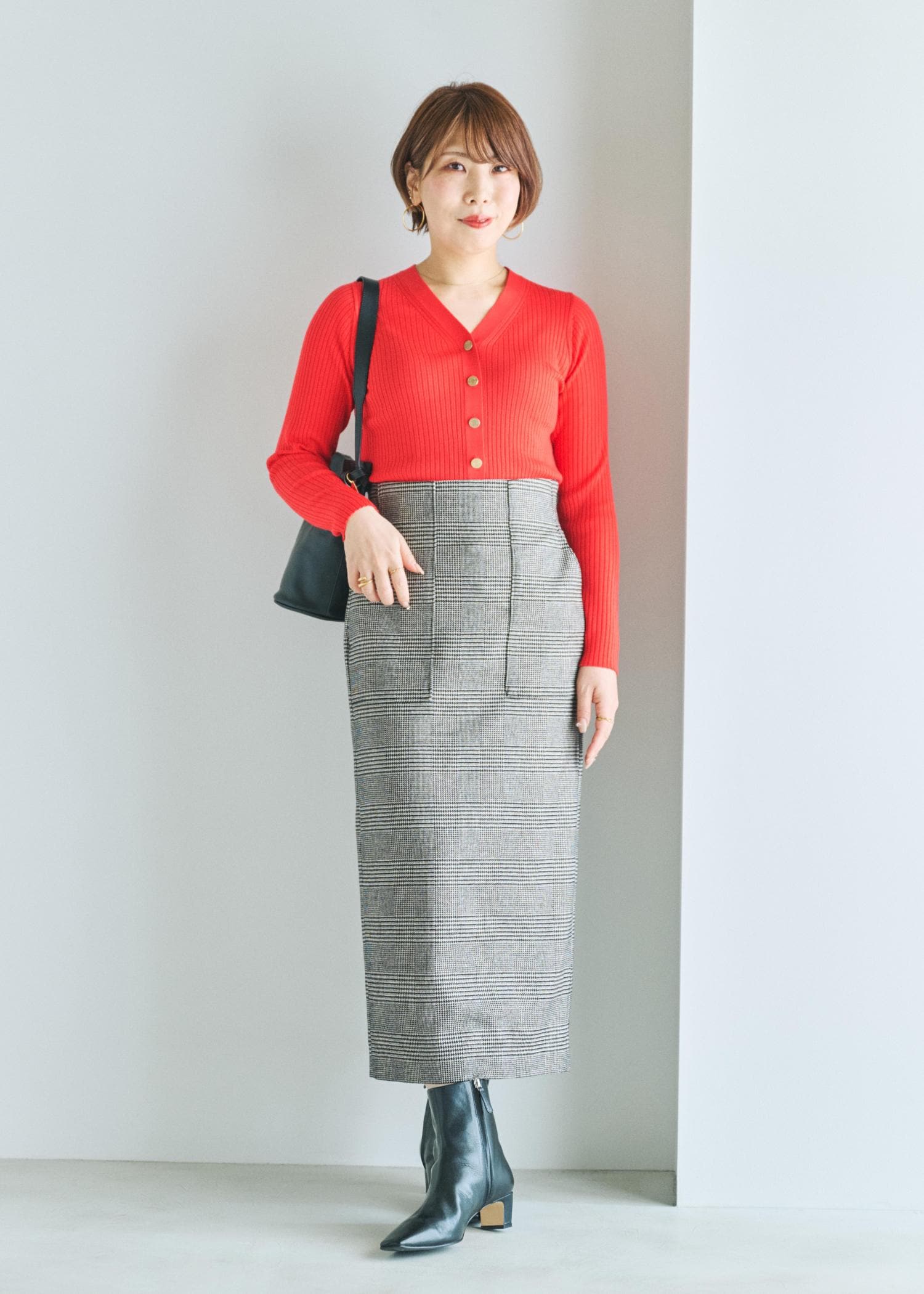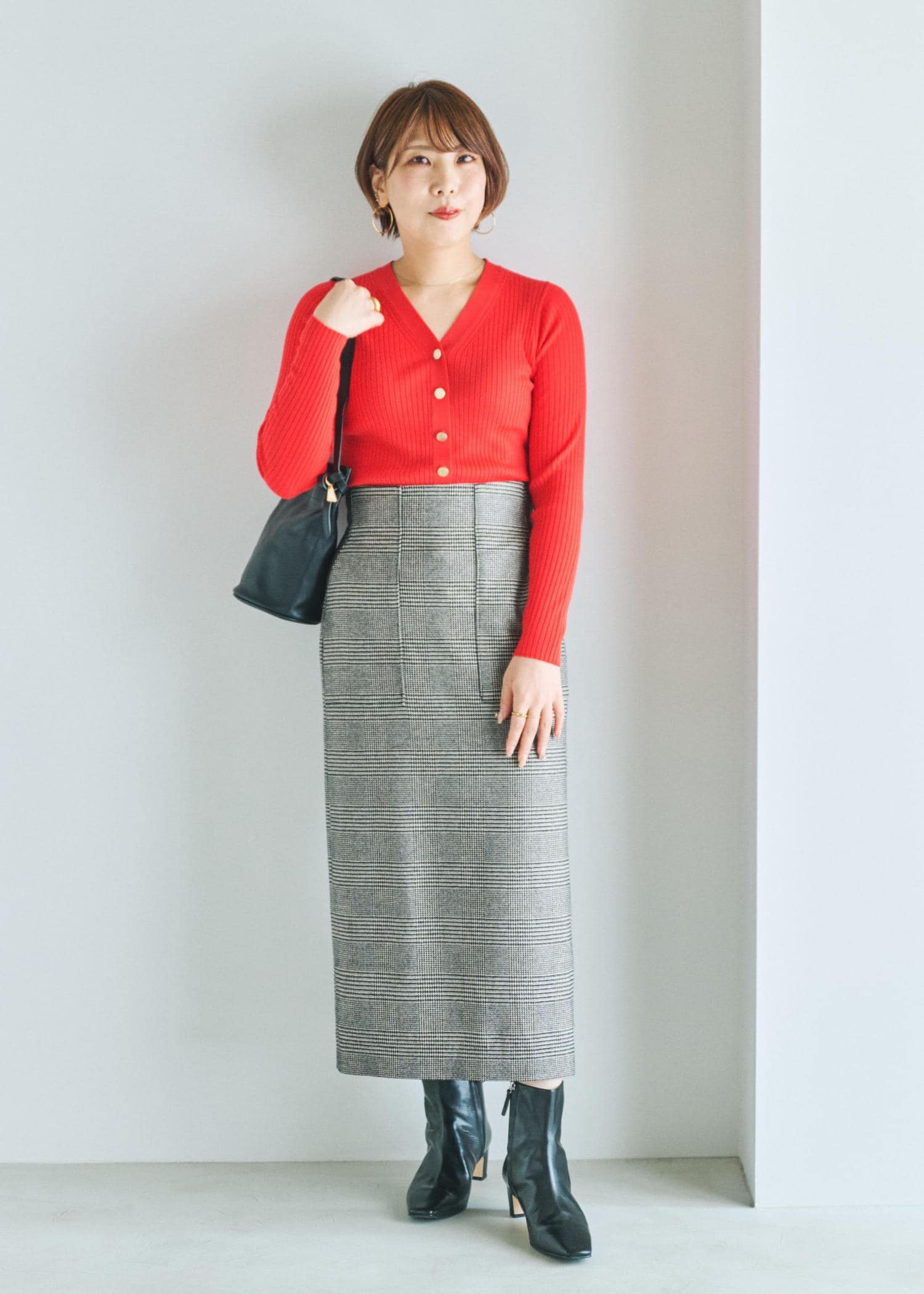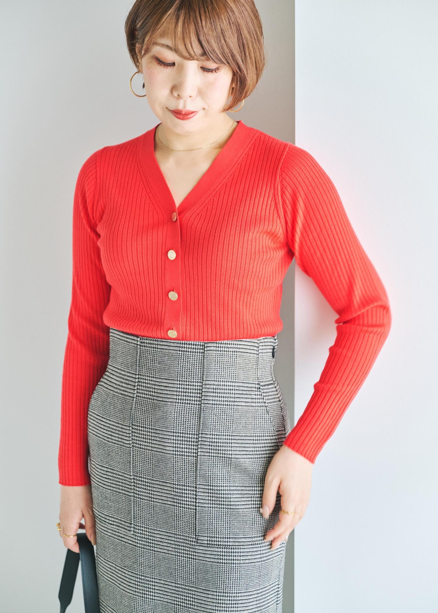 華やかなレッドカラーのカーディガンでパッと目を引く