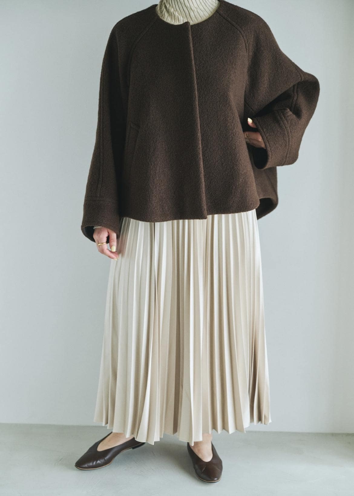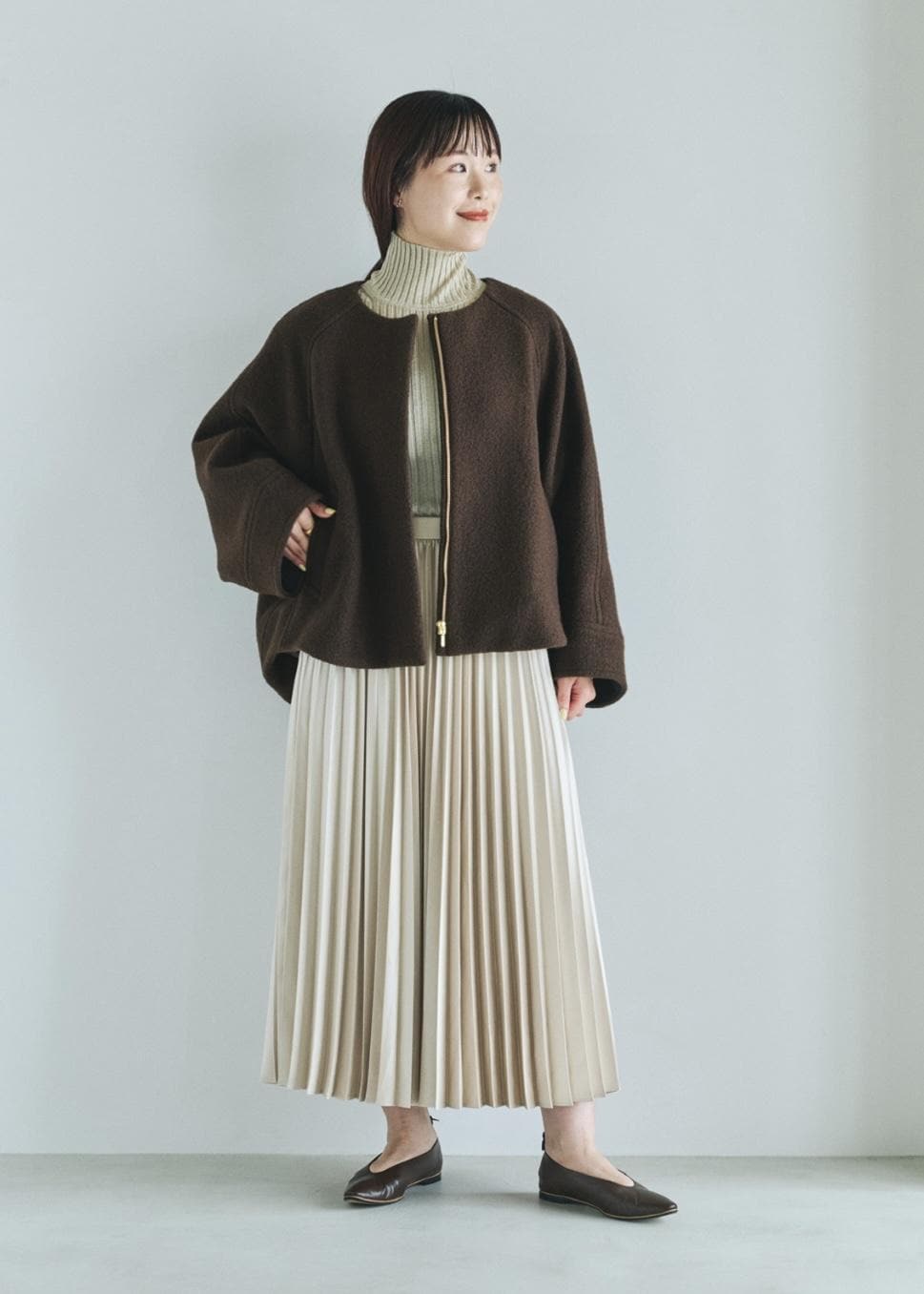 ボトムは上品な光沢が女性らしいプリーツスカート。