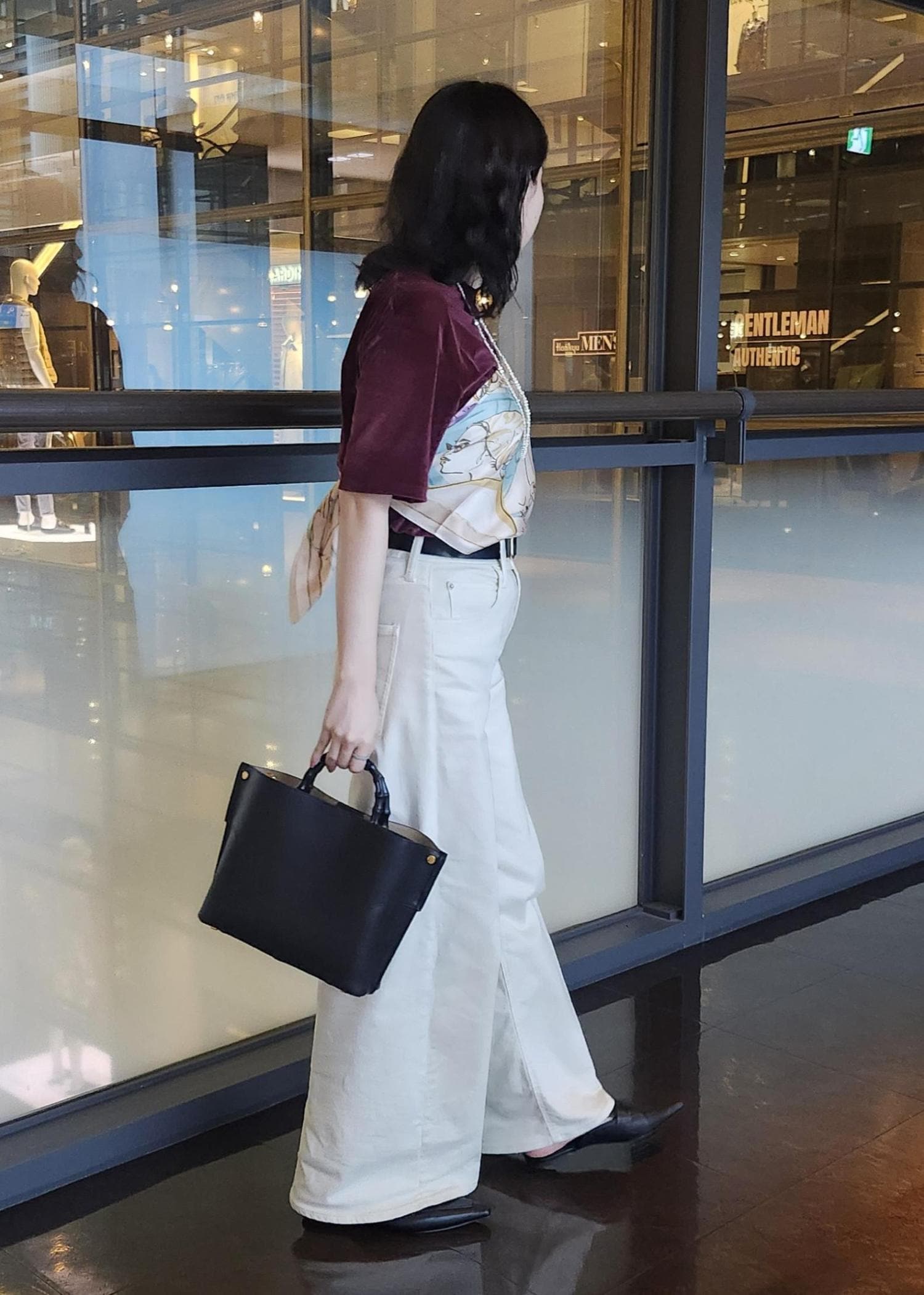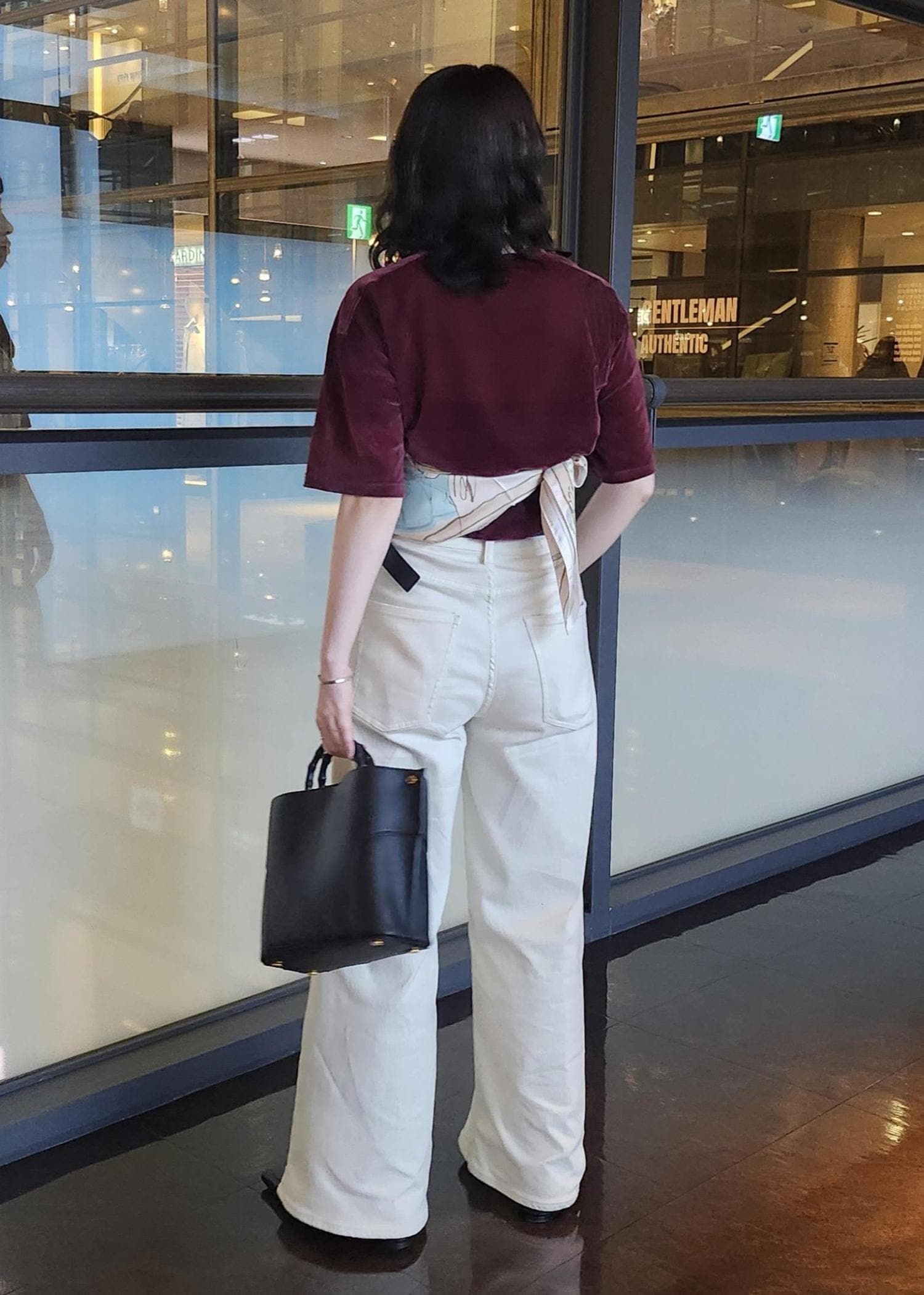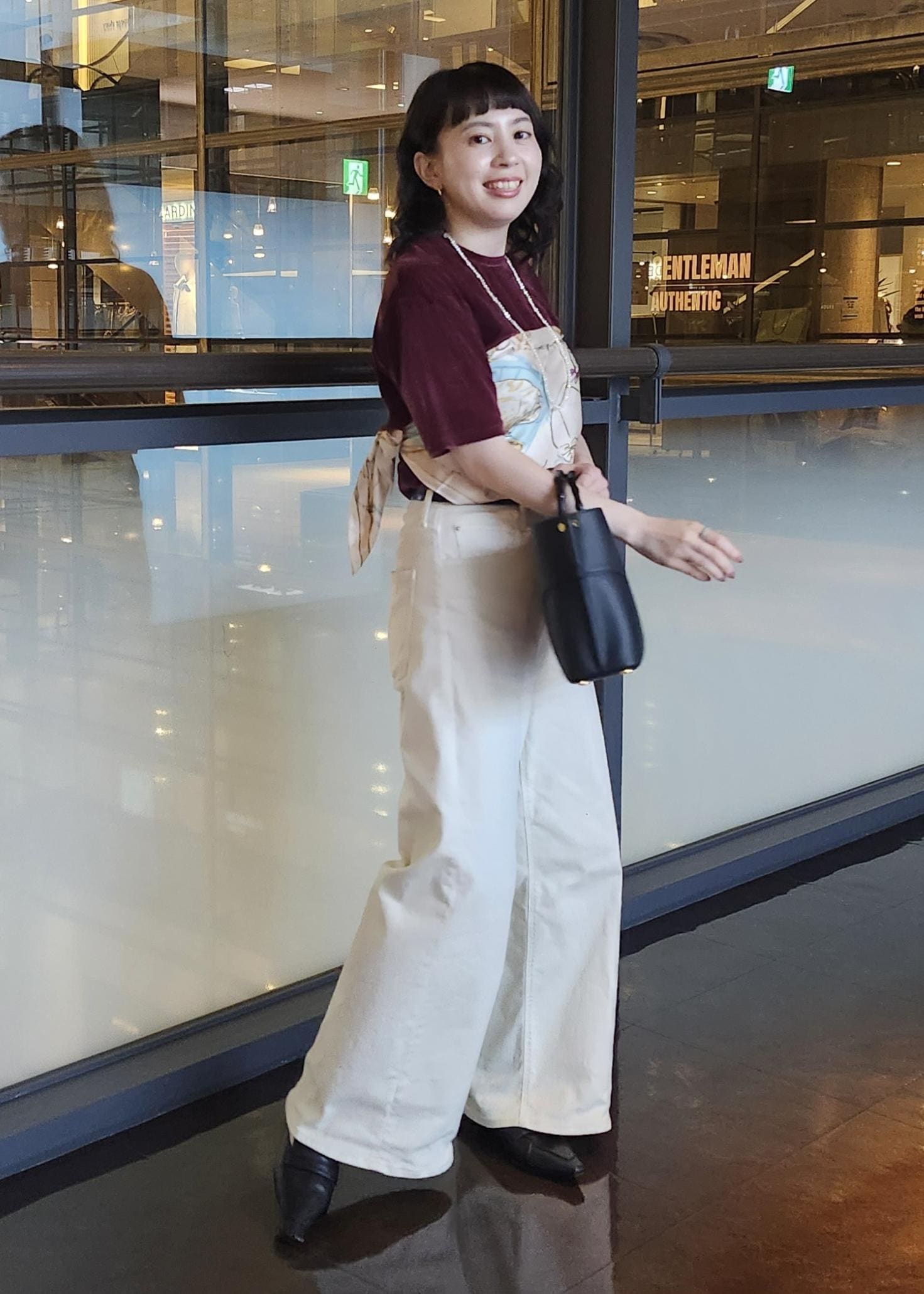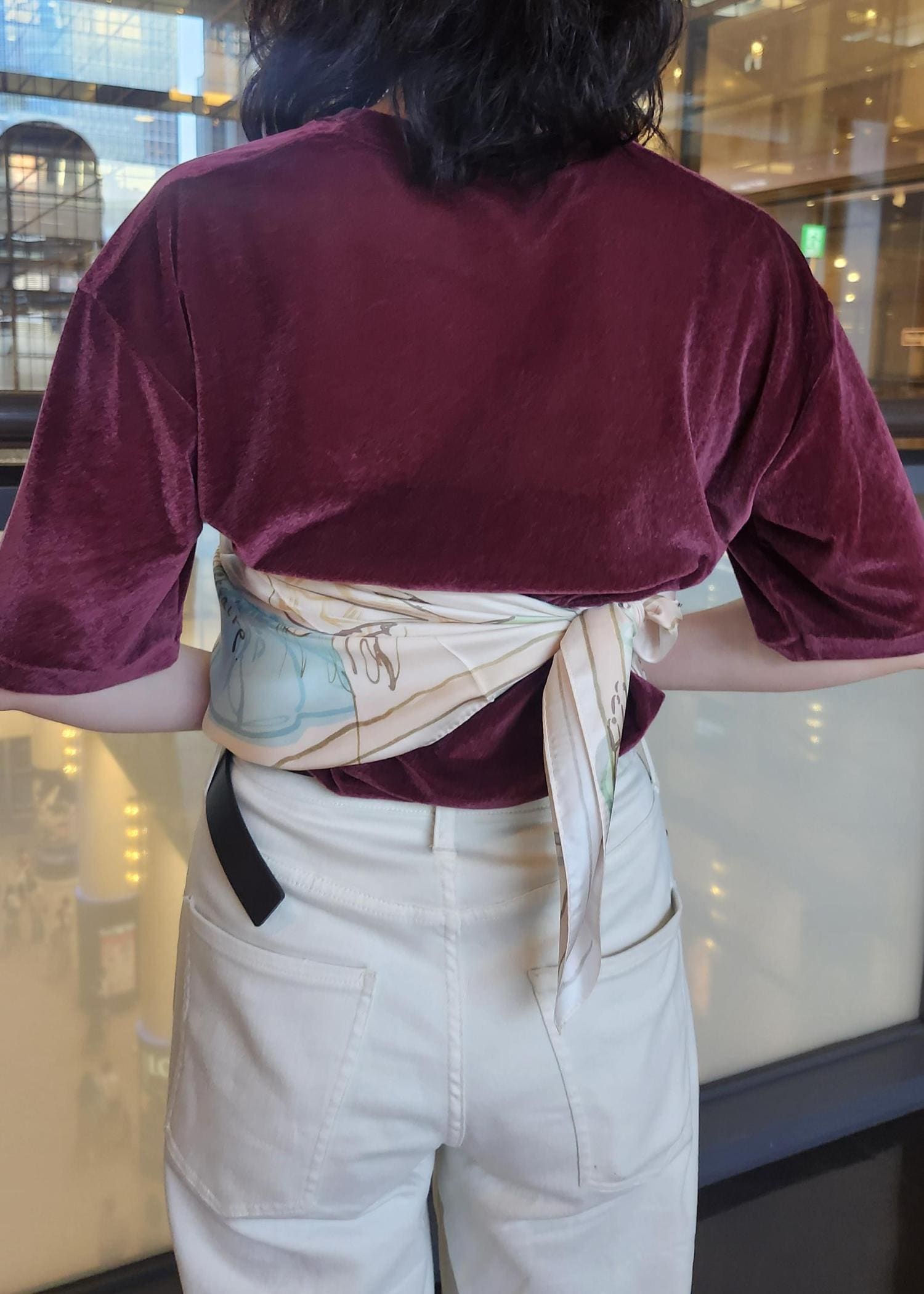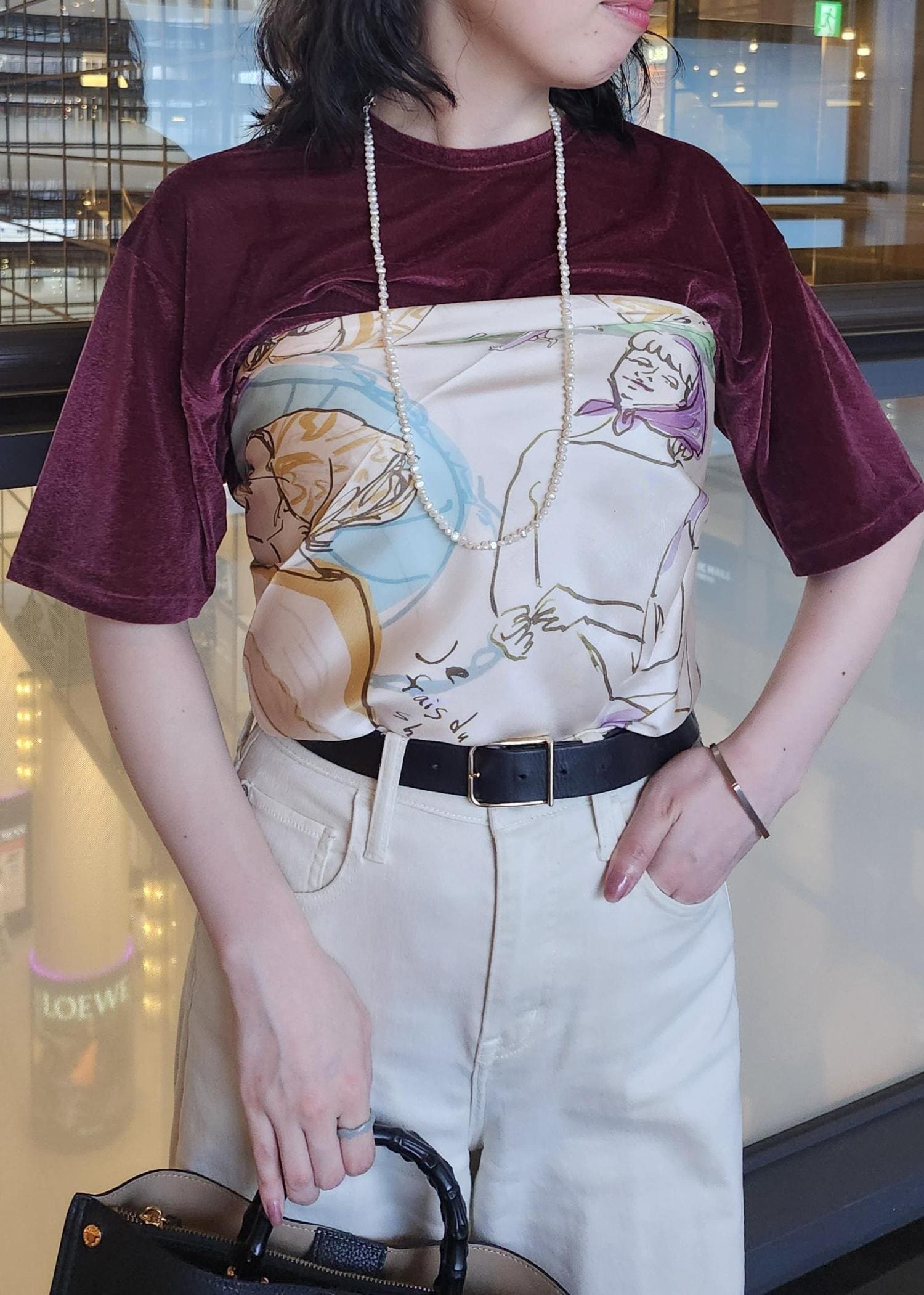 ボルドーのベロア生地のトップスにホワイトパンツを合わせて軽やかな組み合わせにしました◎