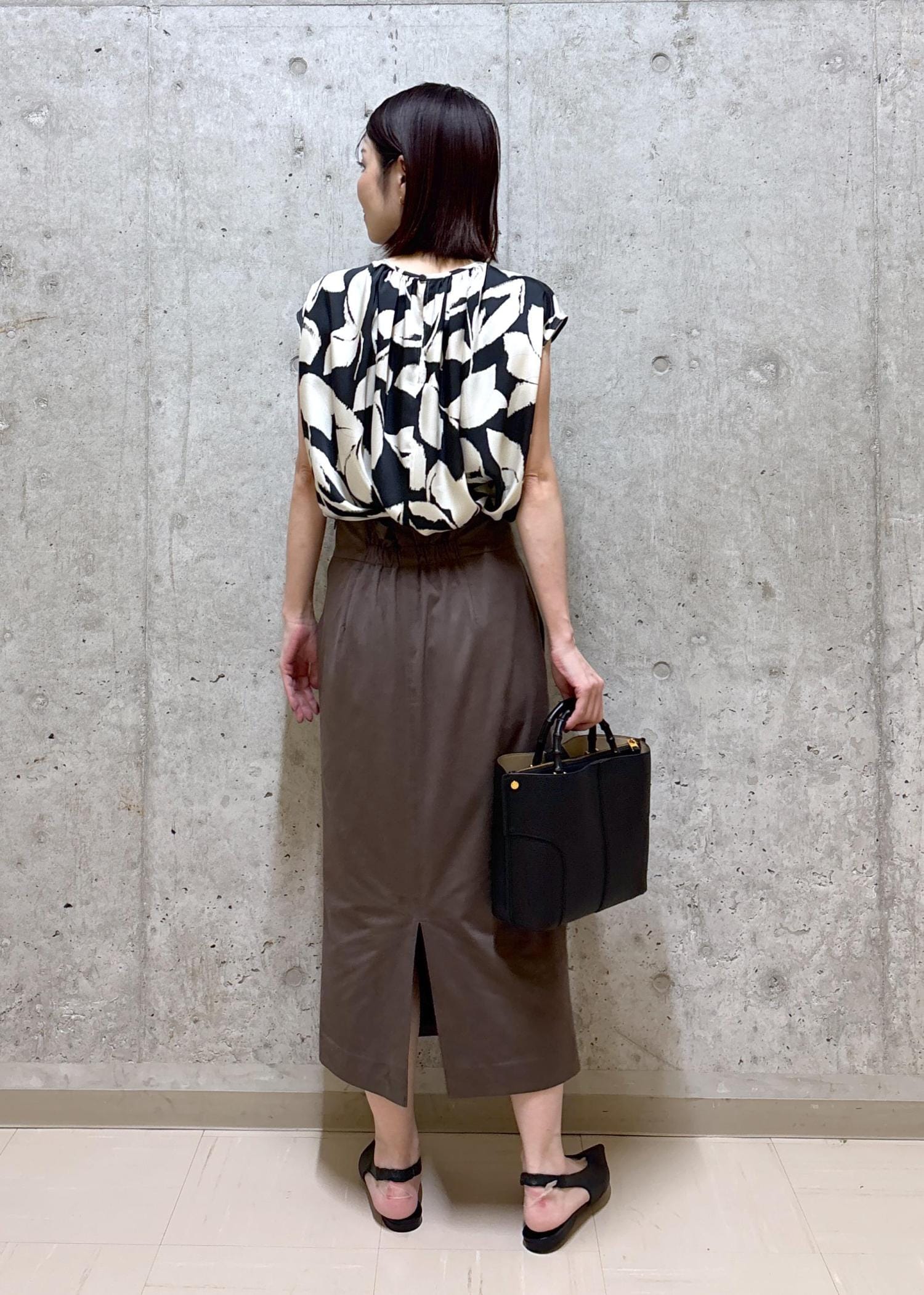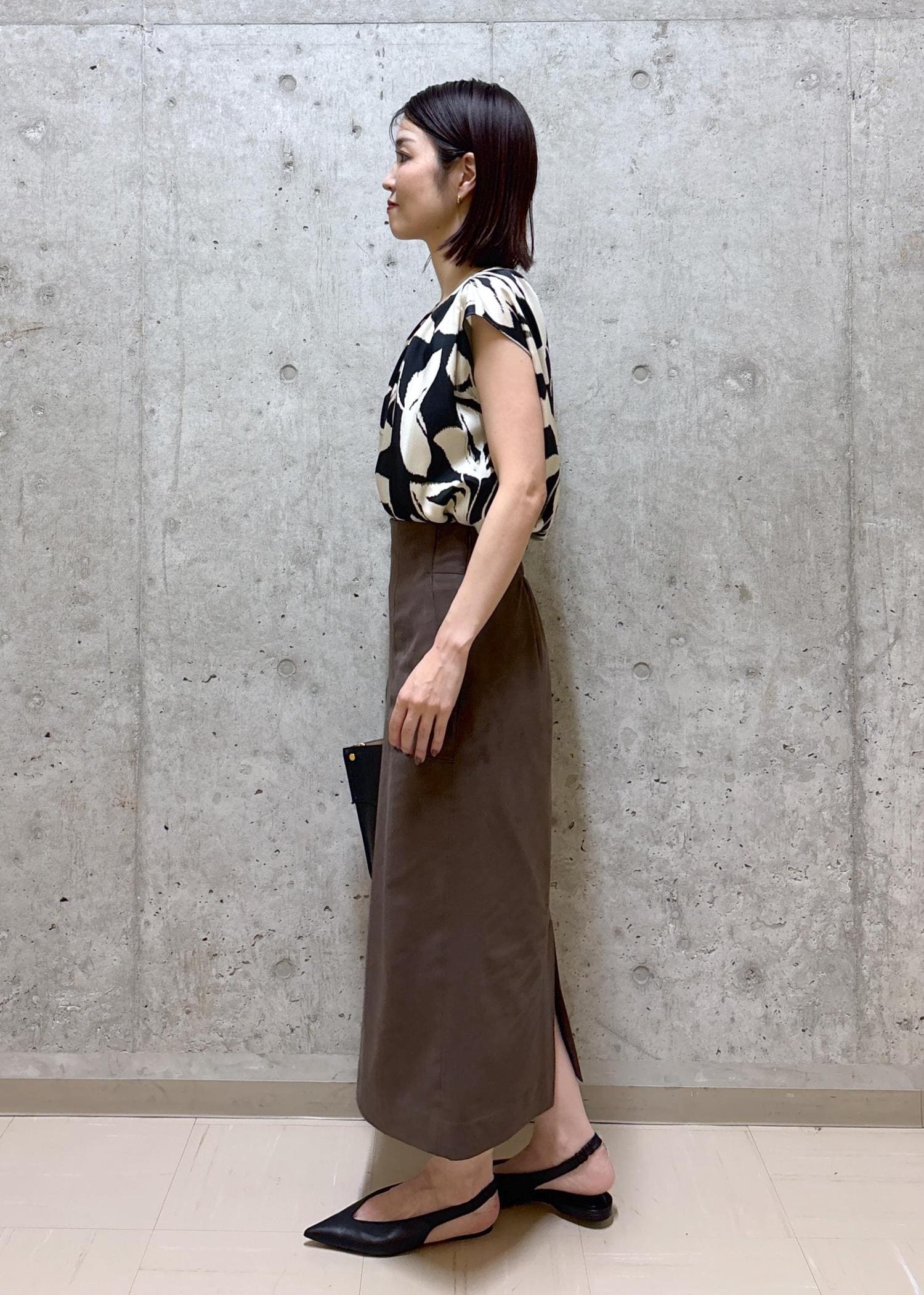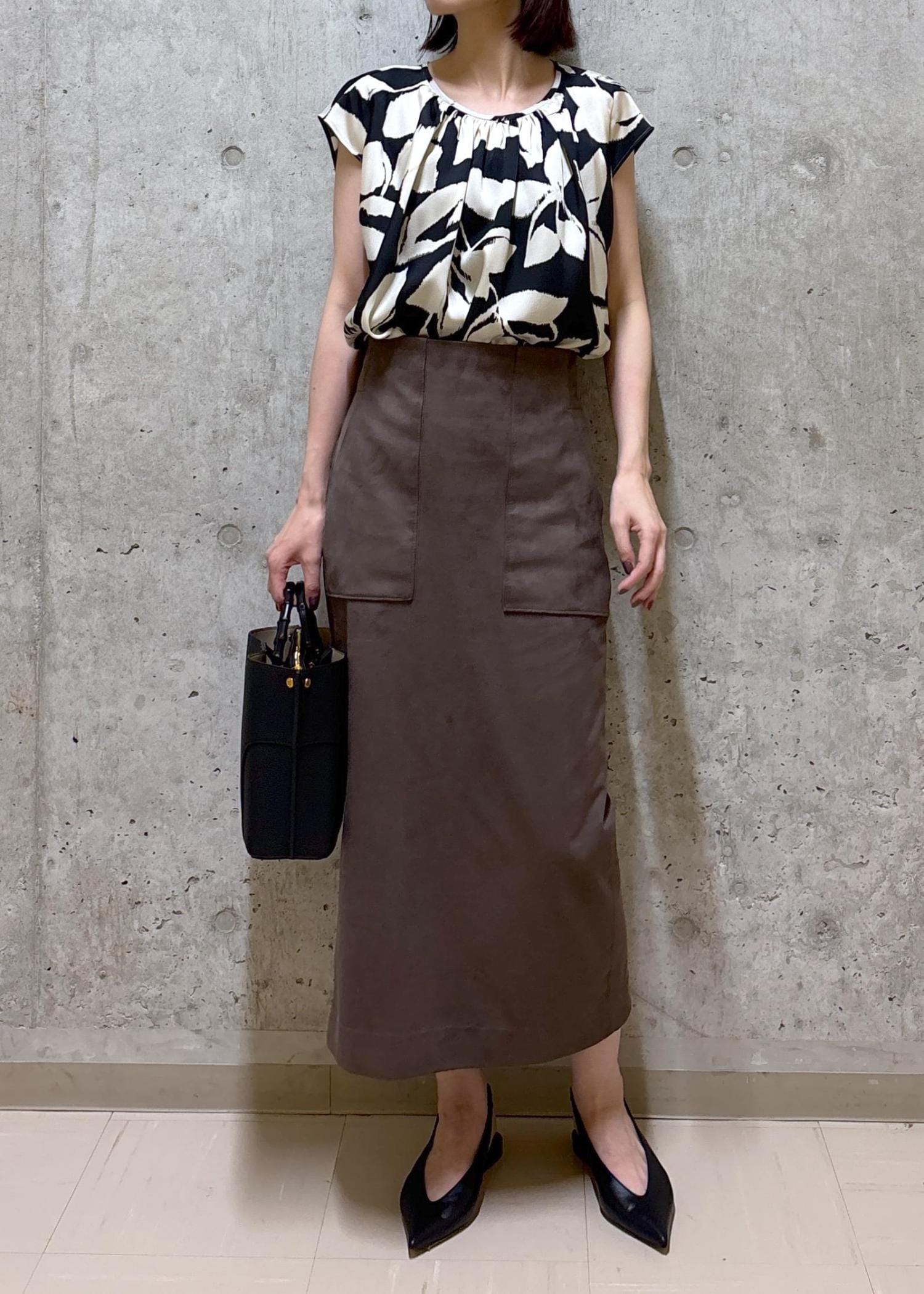 プリント柄のブラウスにスエードタイトスカートを合わせて、