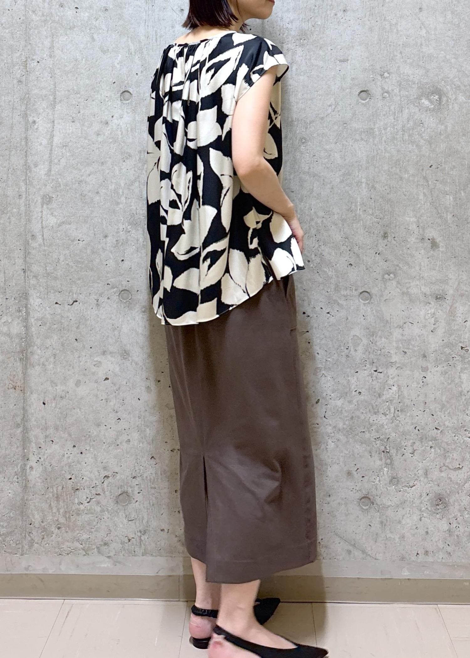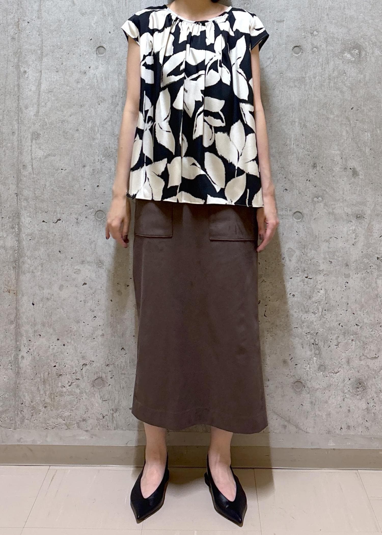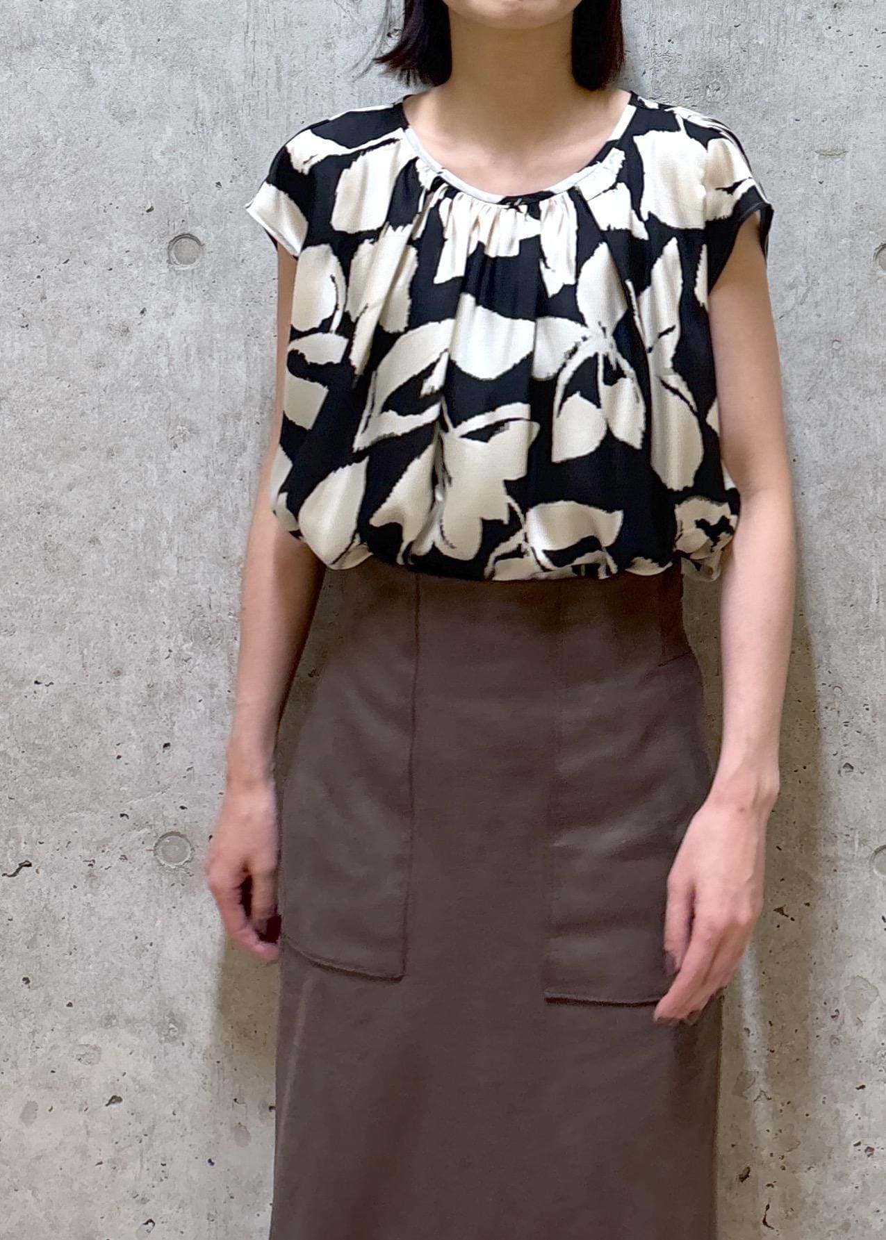 プリント柄のブラウスにスエードタイトスカートを合わせて、