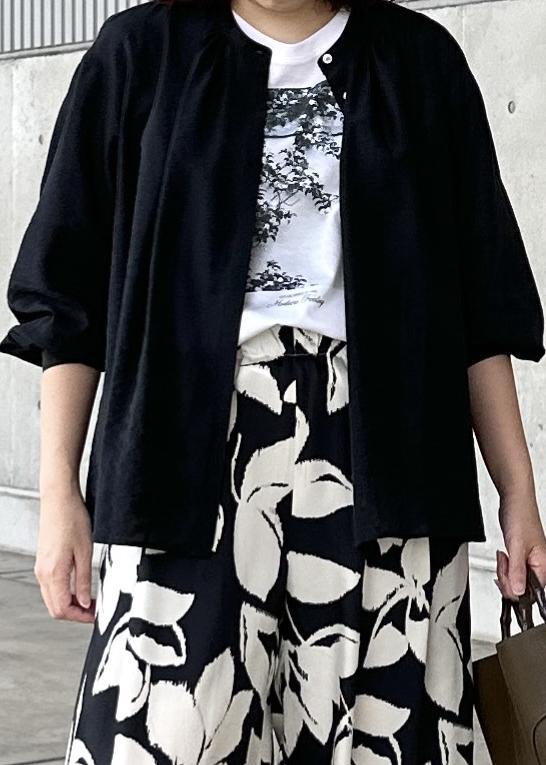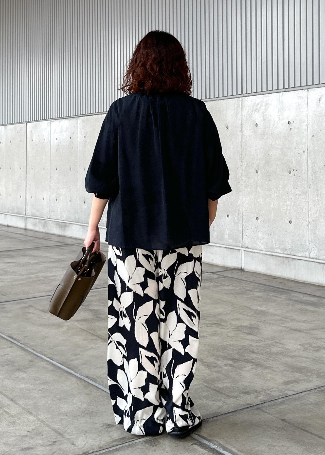 スタンドカラーで袖にボリュームがあり、インでもアウトでも決まるデザインなので、ボリュームがありながらもボトムを選ばない1枚あると便利なブラウスです。 -
