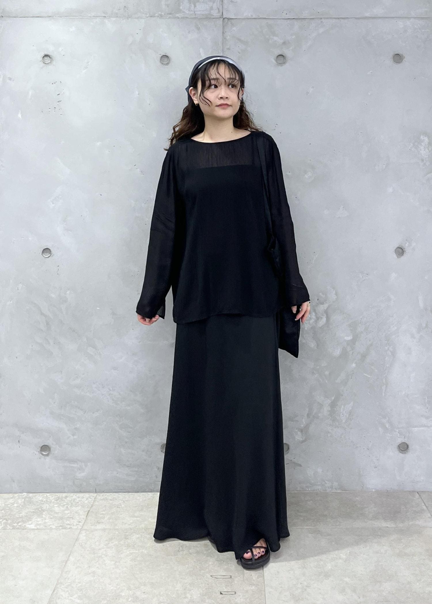黒ですが軽やかな印象のアイテムを合わせました。