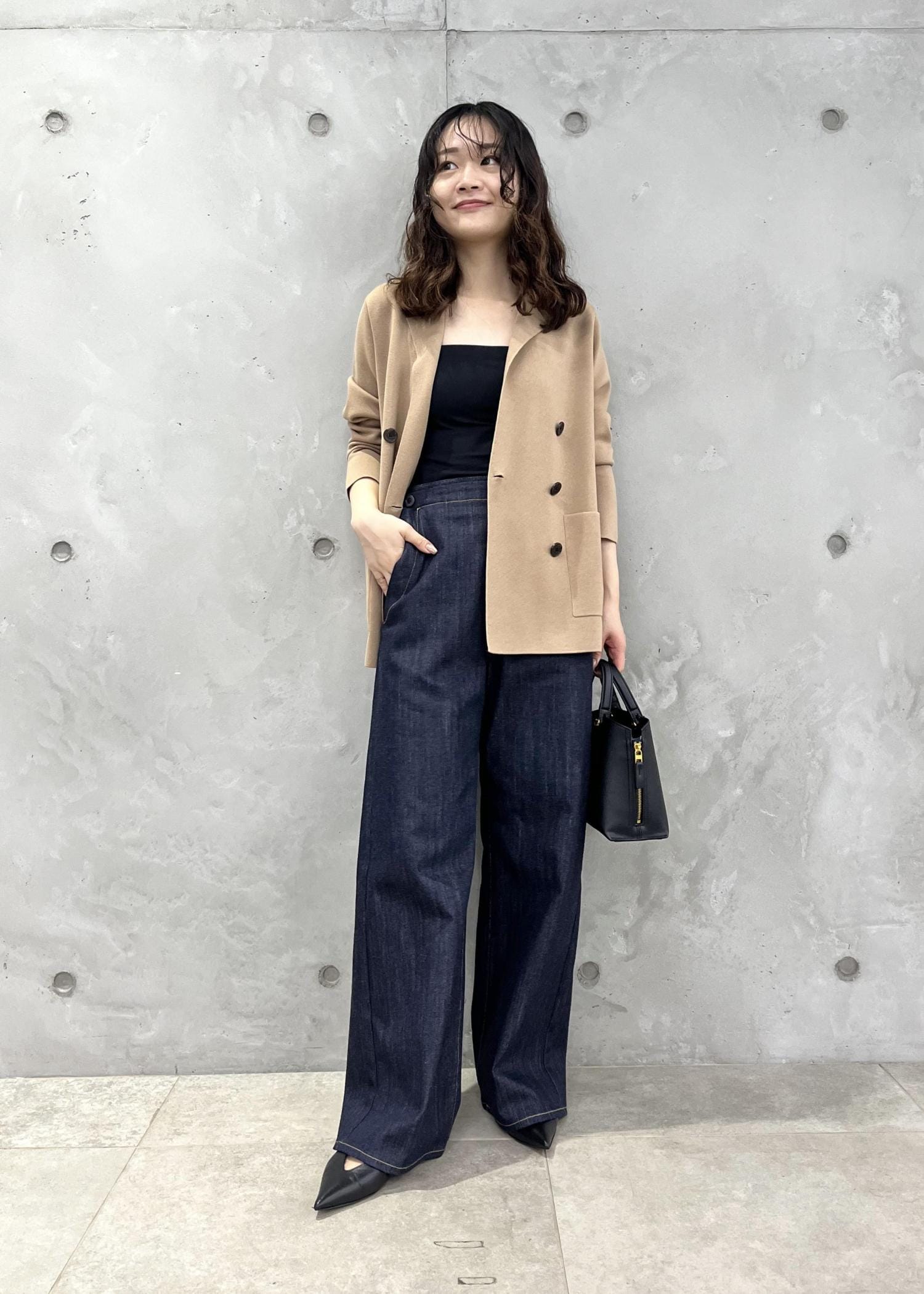 キャメルカラーと濃いブルーデニムが