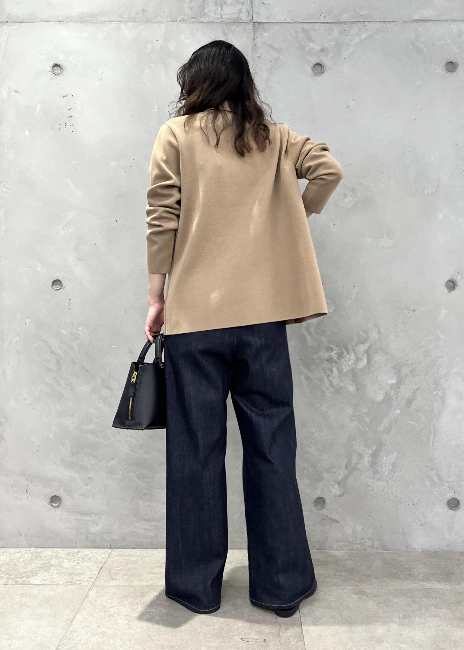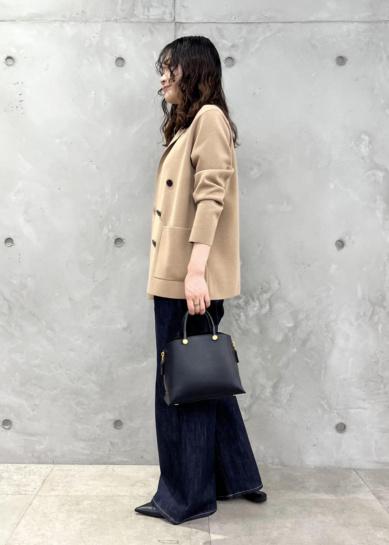 ジャケットはカーディガン感覚で羽織れるニット素材で、