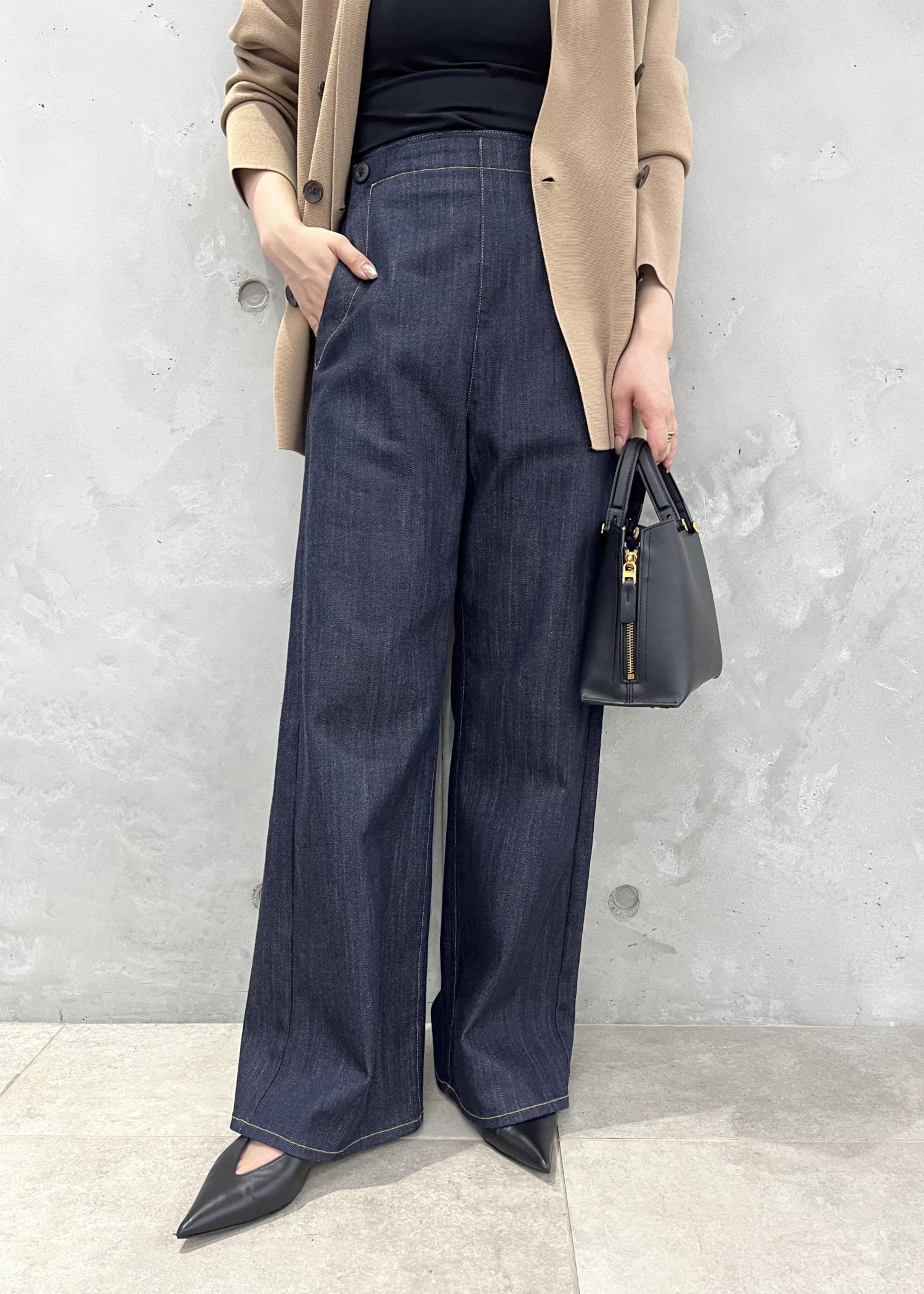 腰回りがすっきり見えるセーラーパンツデザインで、綺麗めな印象で履けるデニムです♪