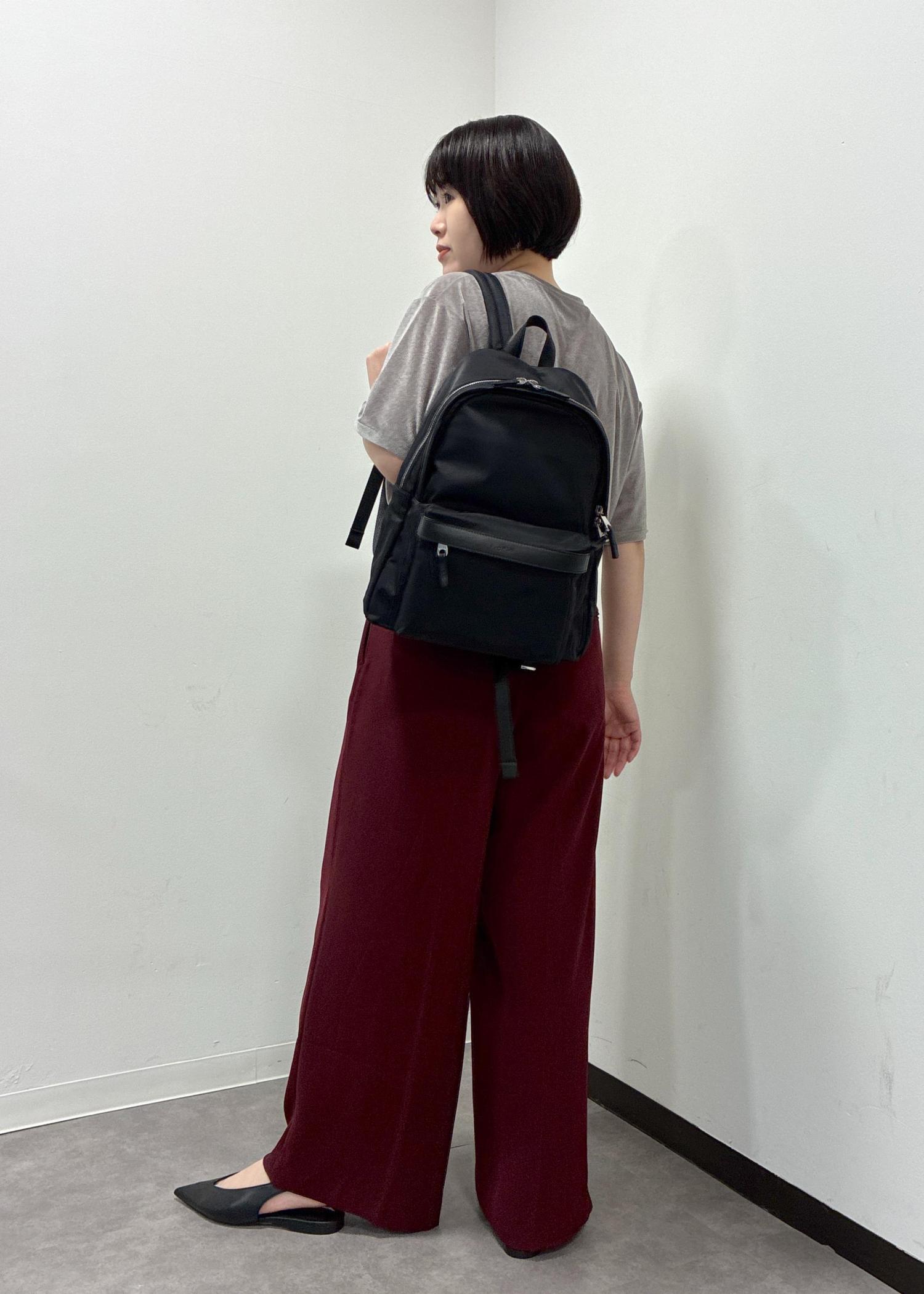 落ち感のある素材ですので、ワイドパンツもすっきり見えするシルエットです。