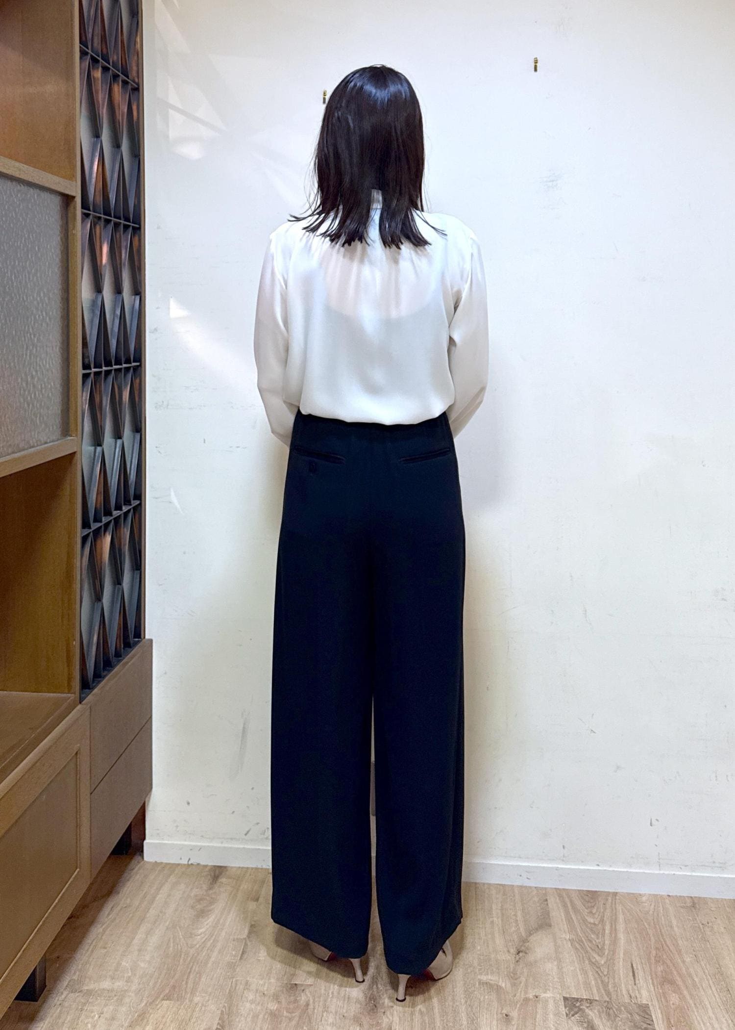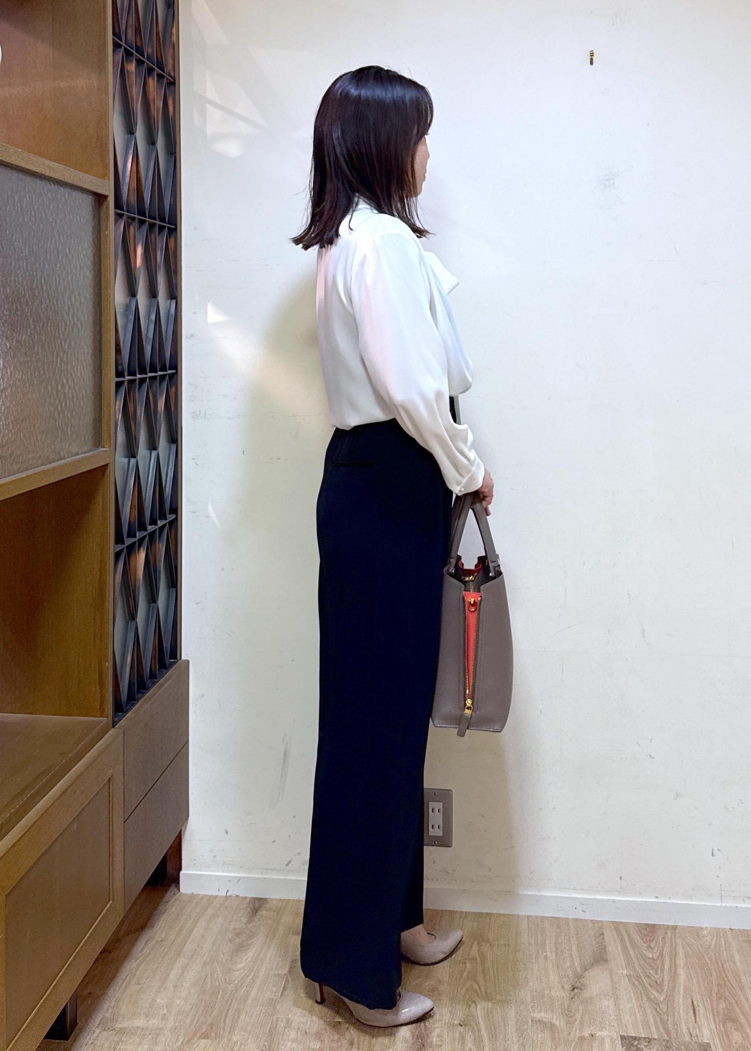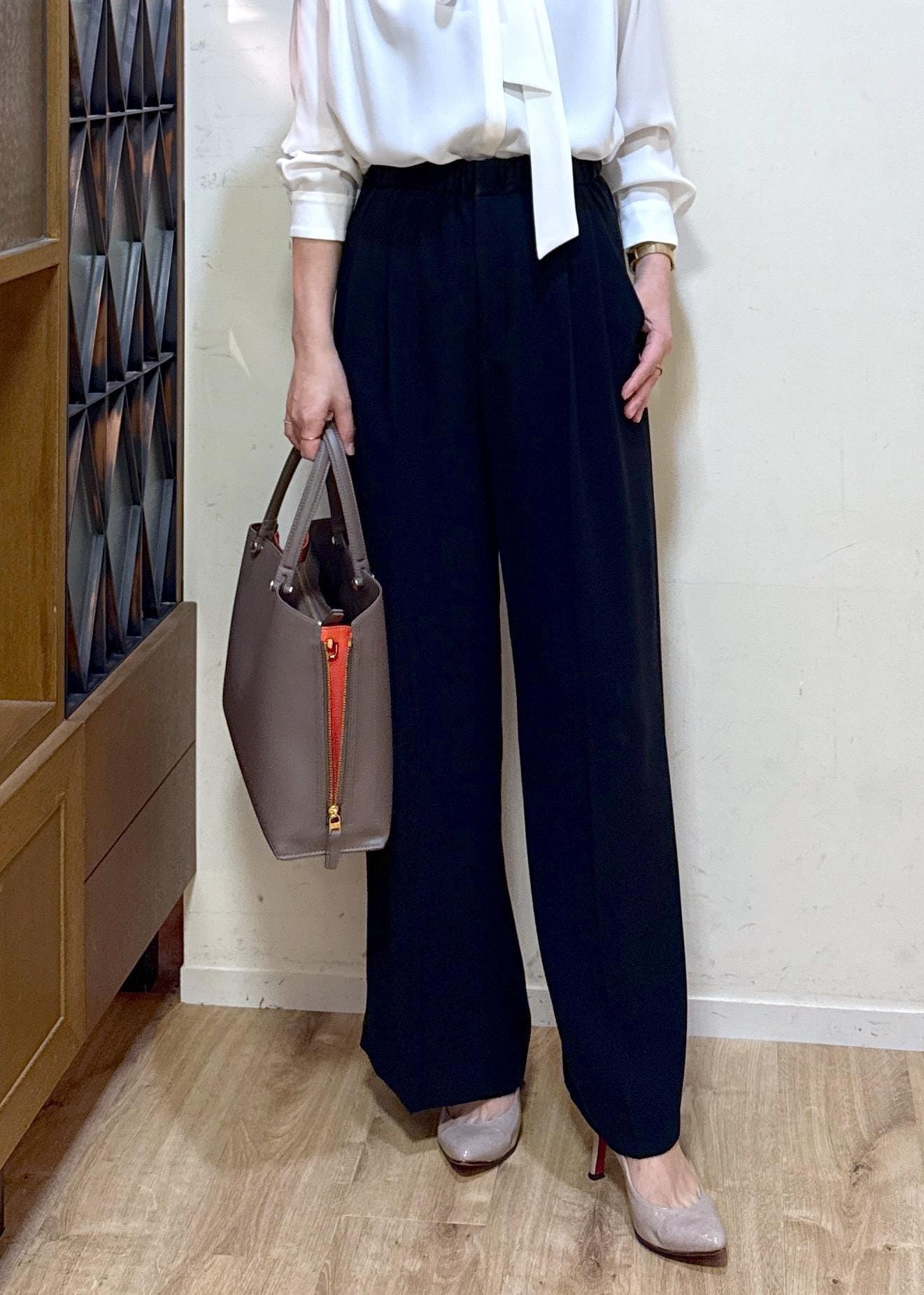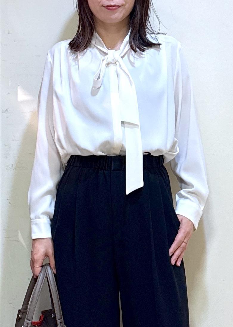 パール釦がポイントのボウタイブラウスをイージーパンツとコーディネート♡