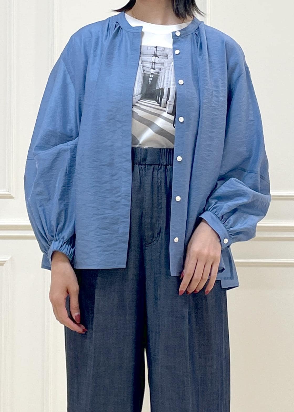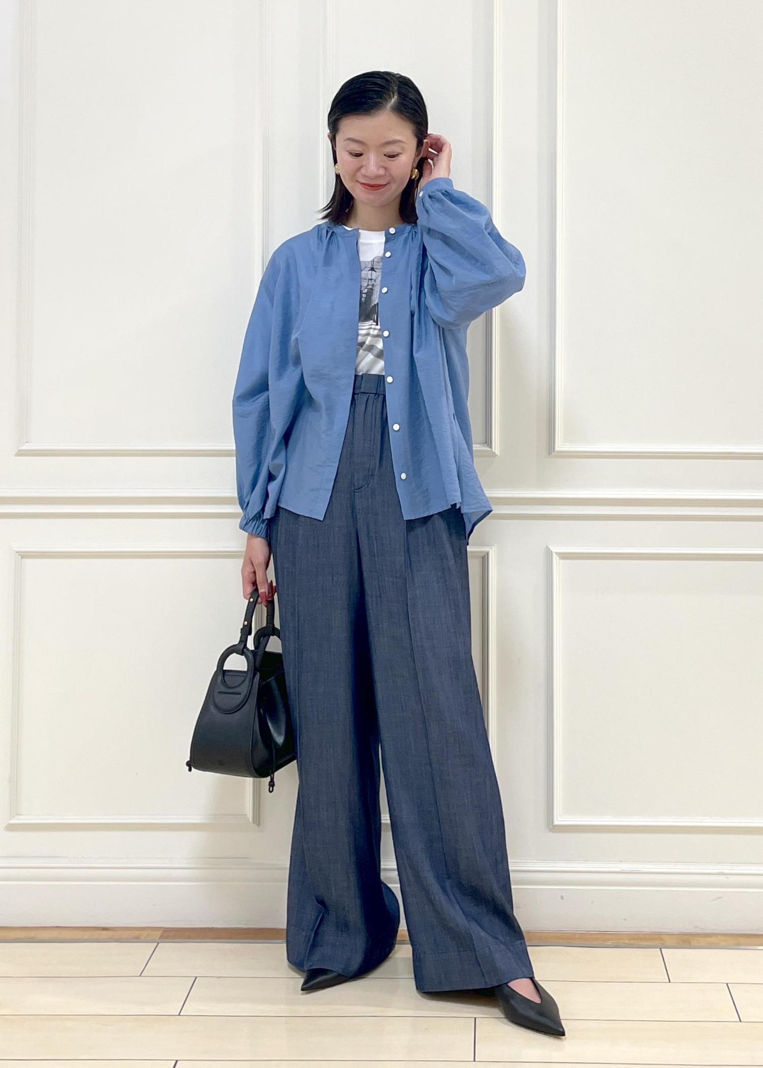 ブルーのカラーが目を引く、ボリューム袖が印象的なブラウスを羽織りとしてアレンジした、大人の綺麗目カジュアルコーデ。