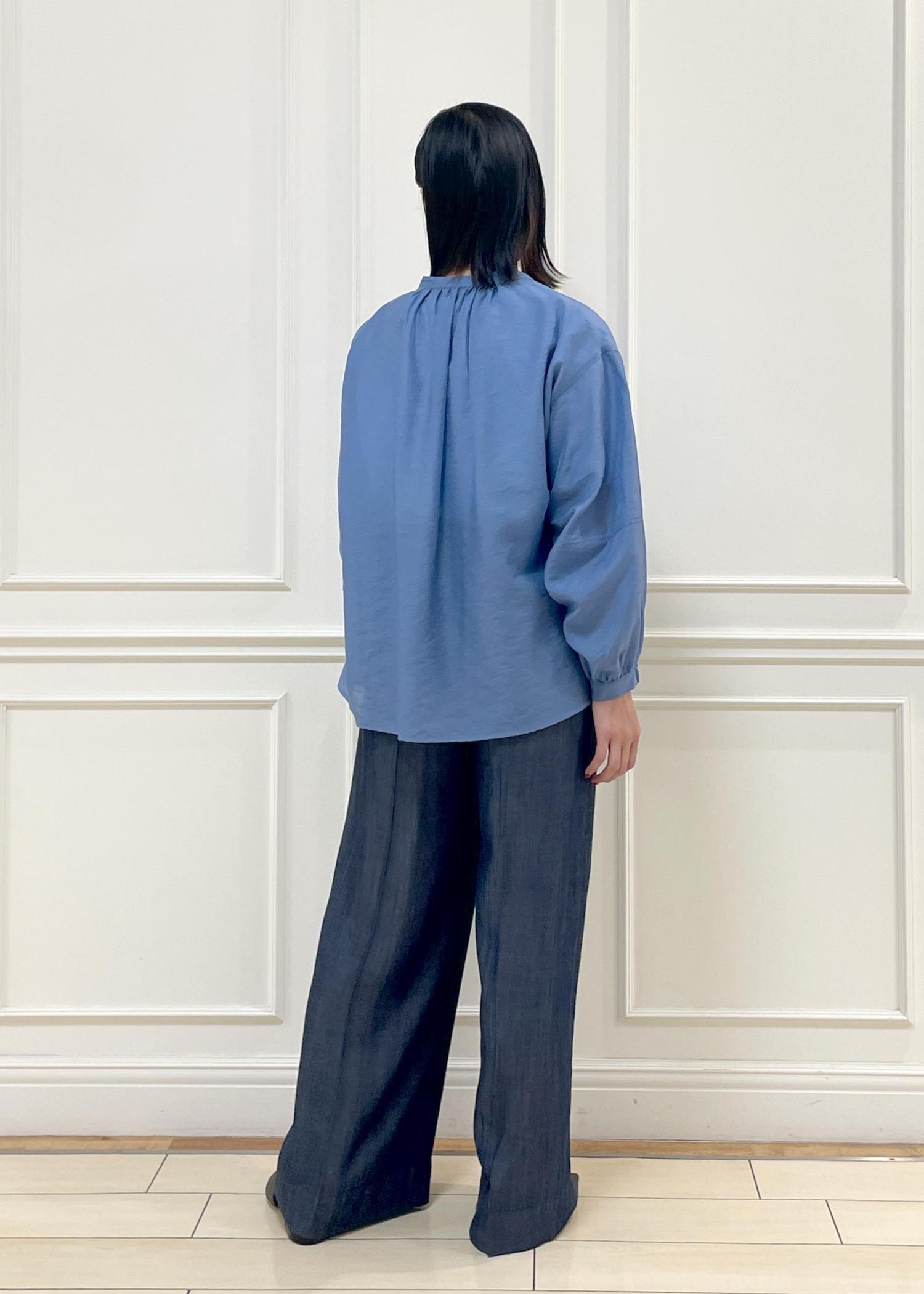 ROPÉキュプラシルクボリュームスリーブブラウス/イージーケアブルー系 / F¥19,800レビュー体のラインを拾いにくい、ゆったりめのシルエットで着やすさバツグン。袖口にはゴムが入っているので、サッとたくし上げられて便利です。