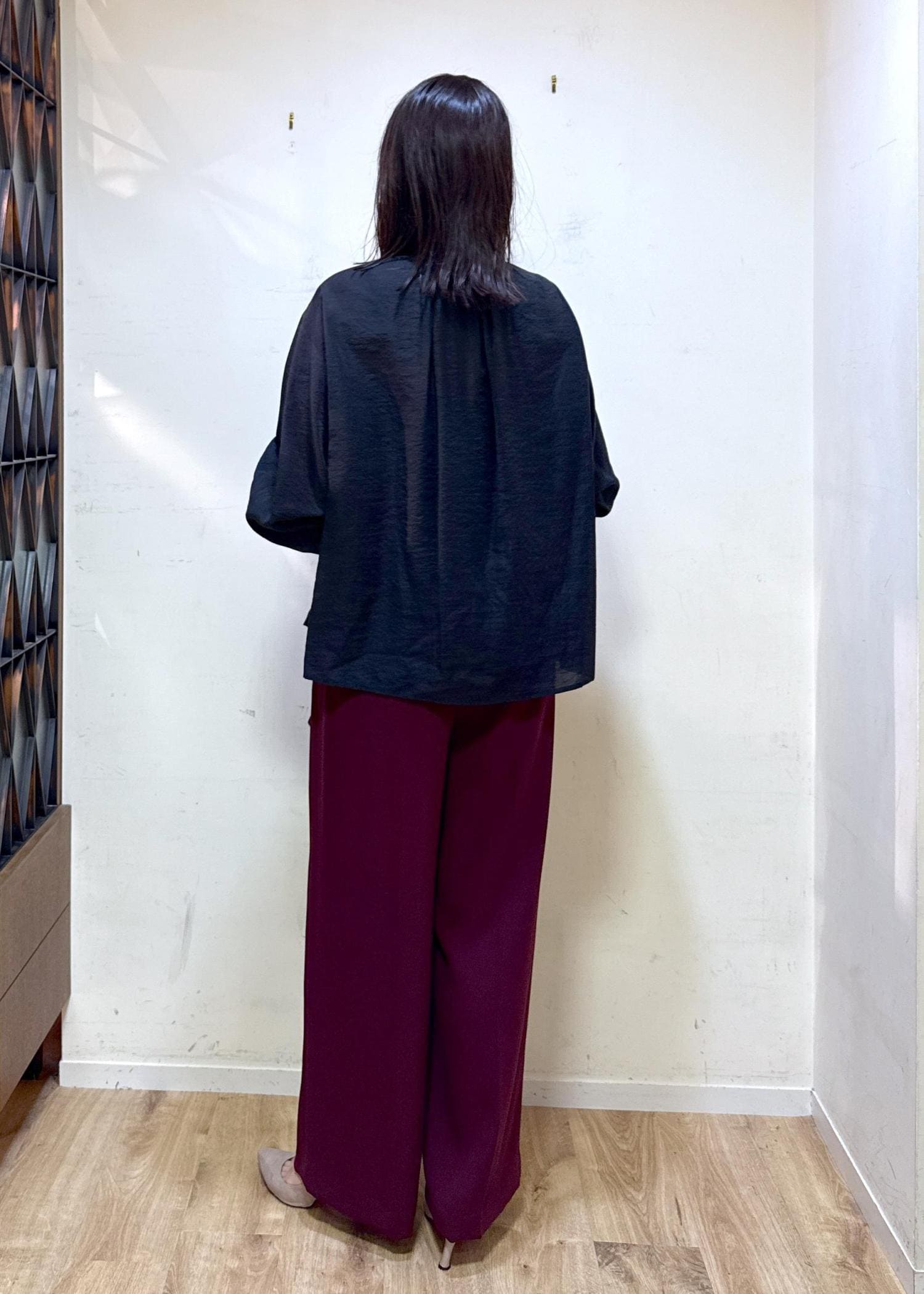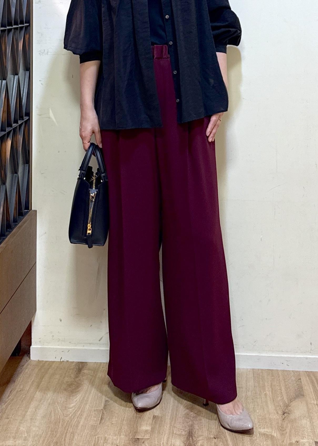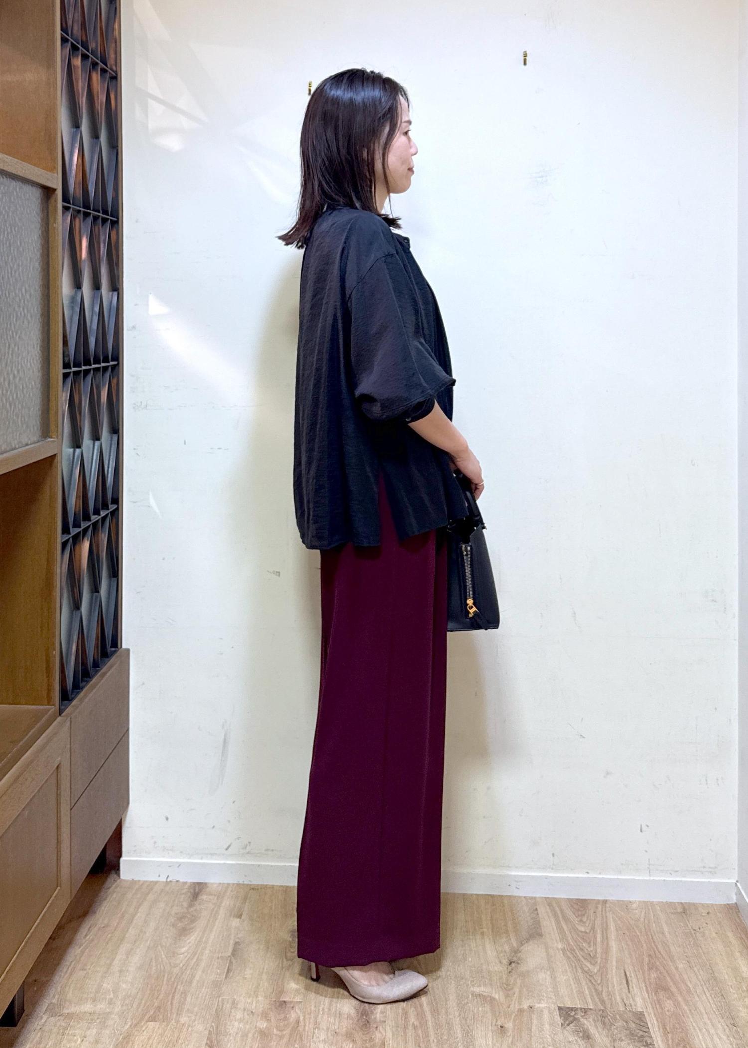 ワイドパンツですが、生地も柔らかくシルエットも広がりすぎていないのでスッキリと履いていただけるパンツとなっております。