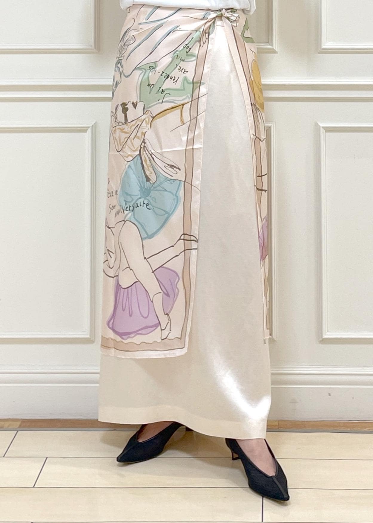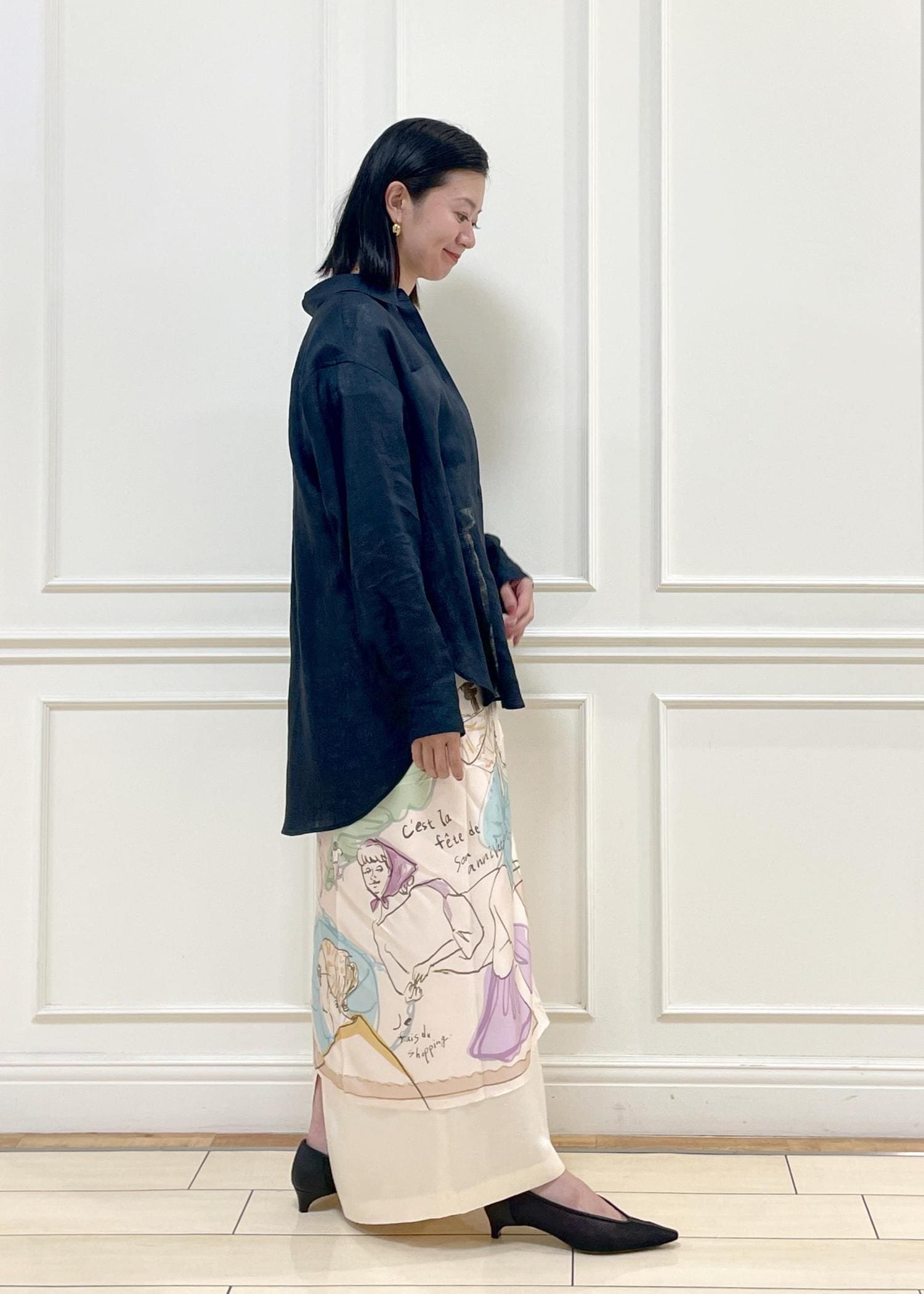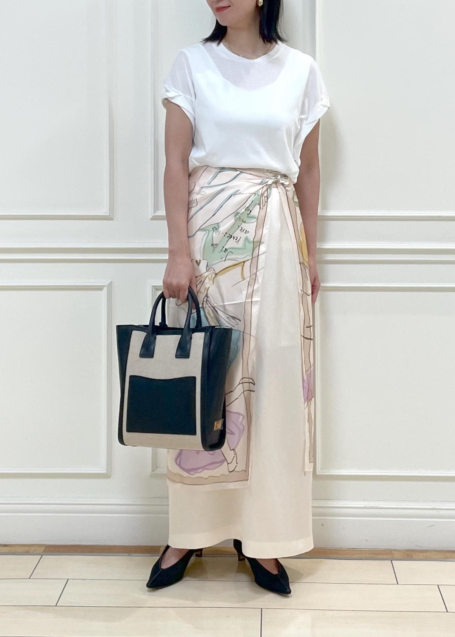 【YUKO SAEKI for ROPÉ・コラボ】スカーフ柄プリント シルクスカーフコーディネート。