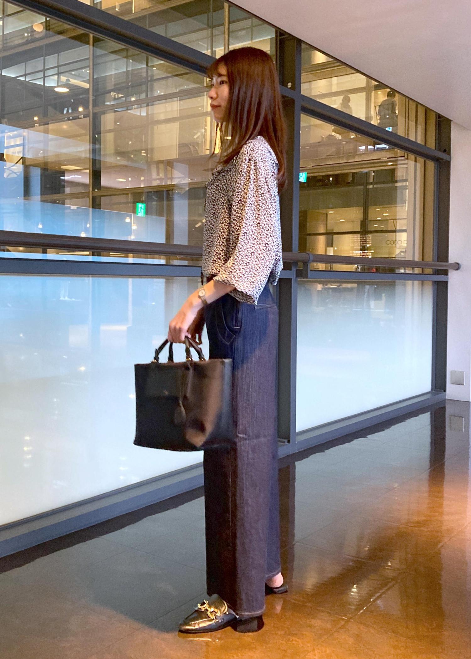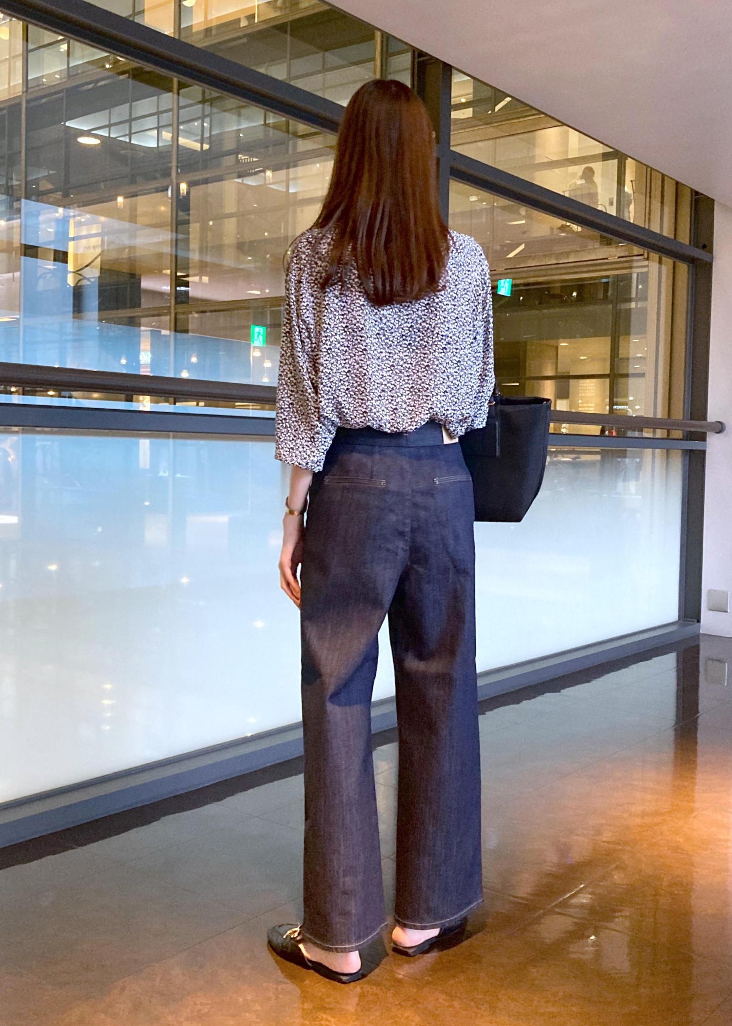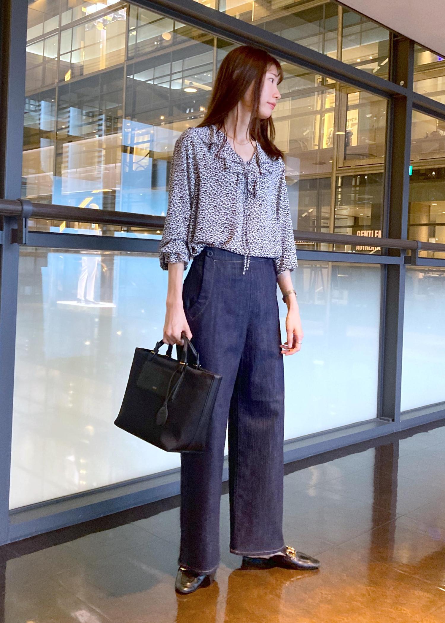 女性らしさのあるラッフル襟ブラウスにデニムパンツを合わせミックスコーデにまとめました!オンオフ兼用で使えるのも◎