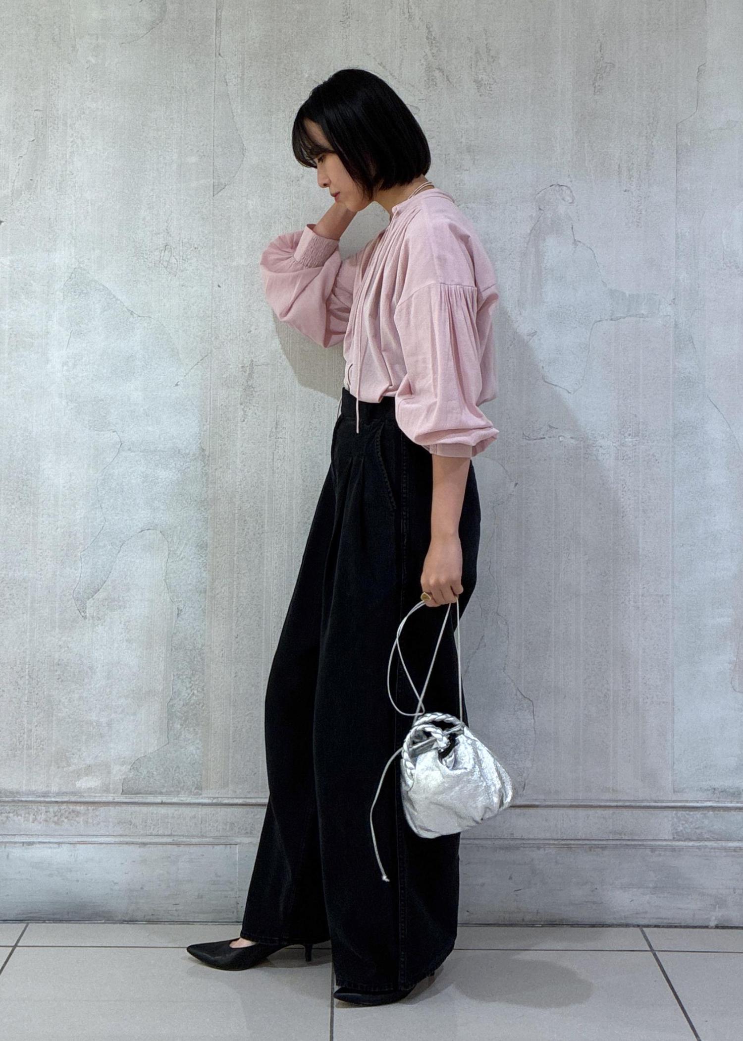 青み寄りのピンクなら、甘くなり過ぎずブラックとの組み合わせで大人カジュアルにまとめてみました。
