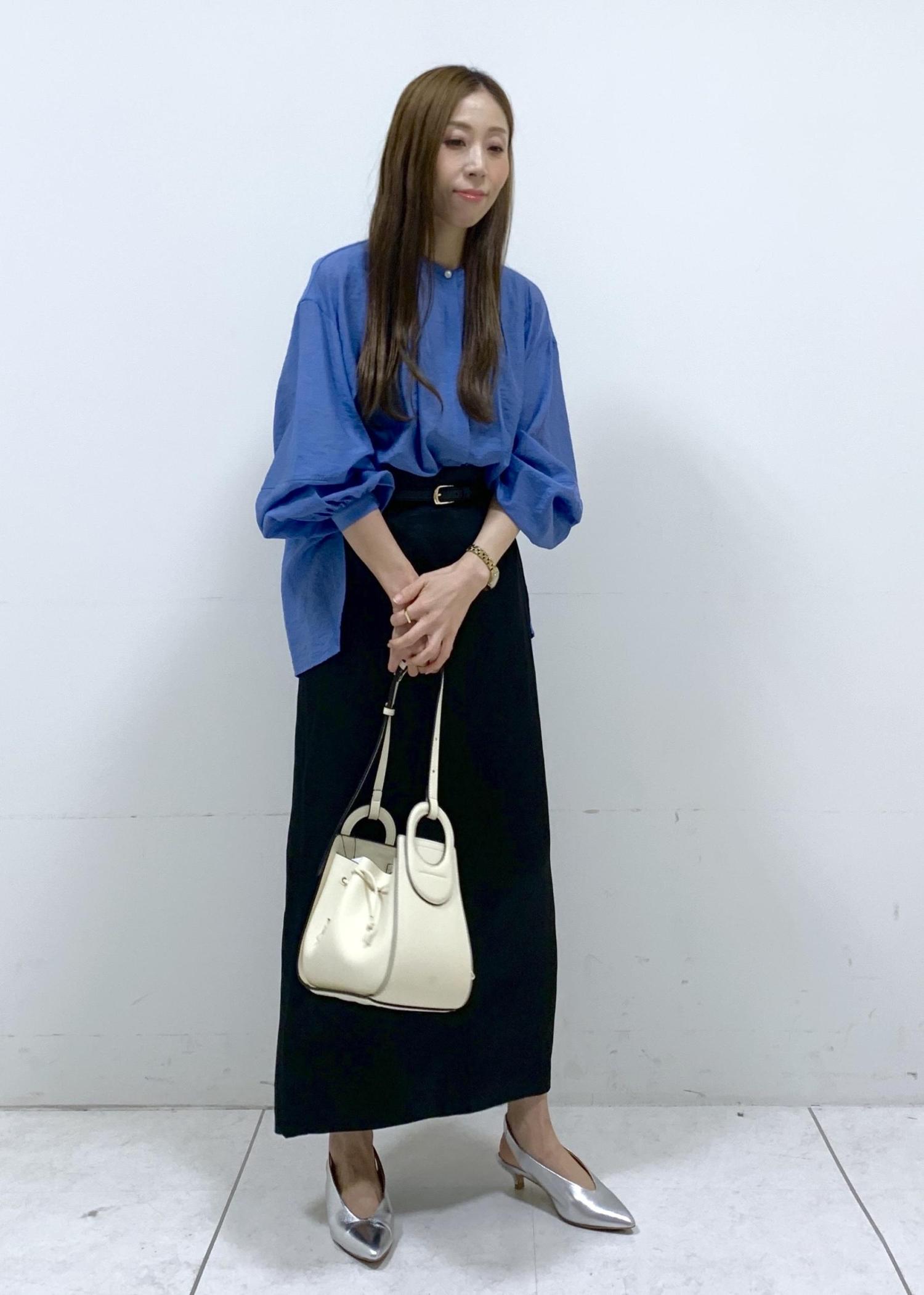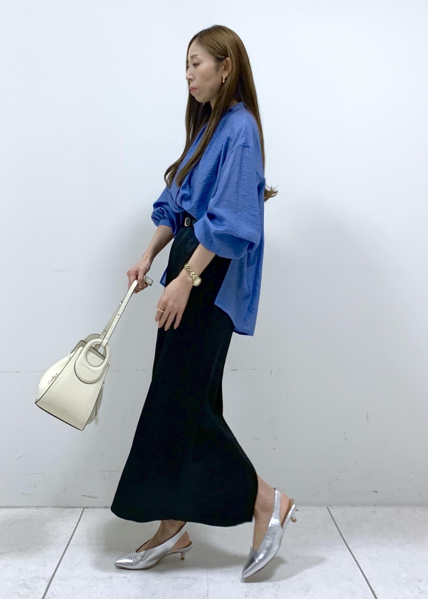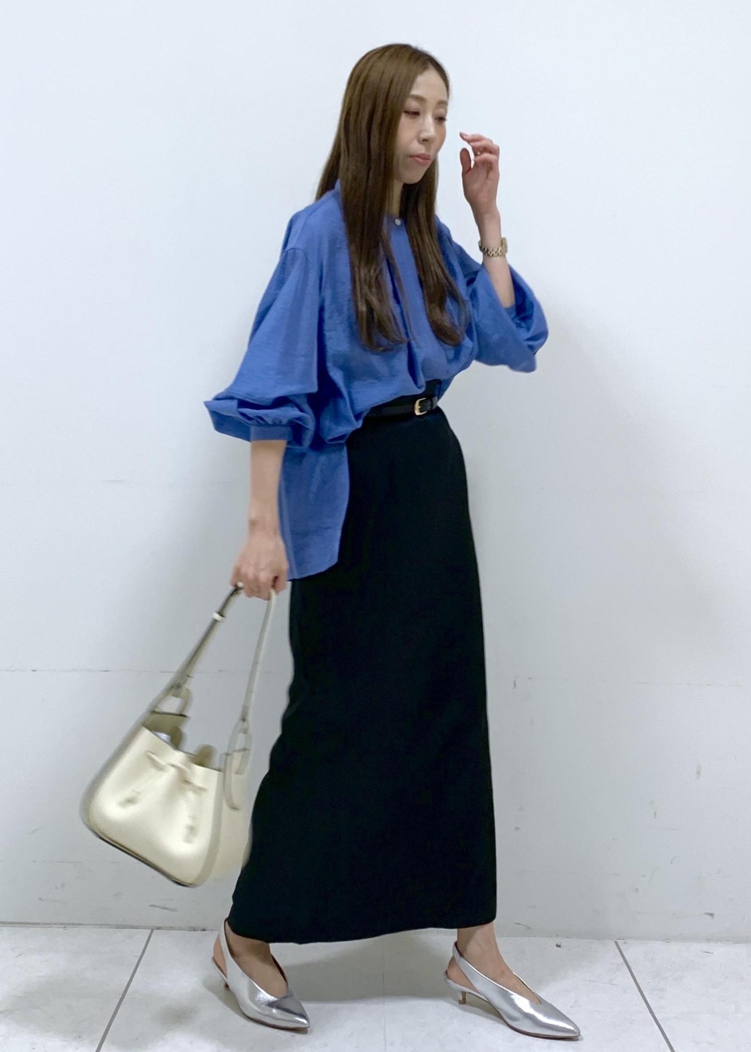 袖のボリューム感が大人かわいいデザインのブラウスに、艶と光沢が大人っぽいサテン素材のタイトスカートを合わせました。