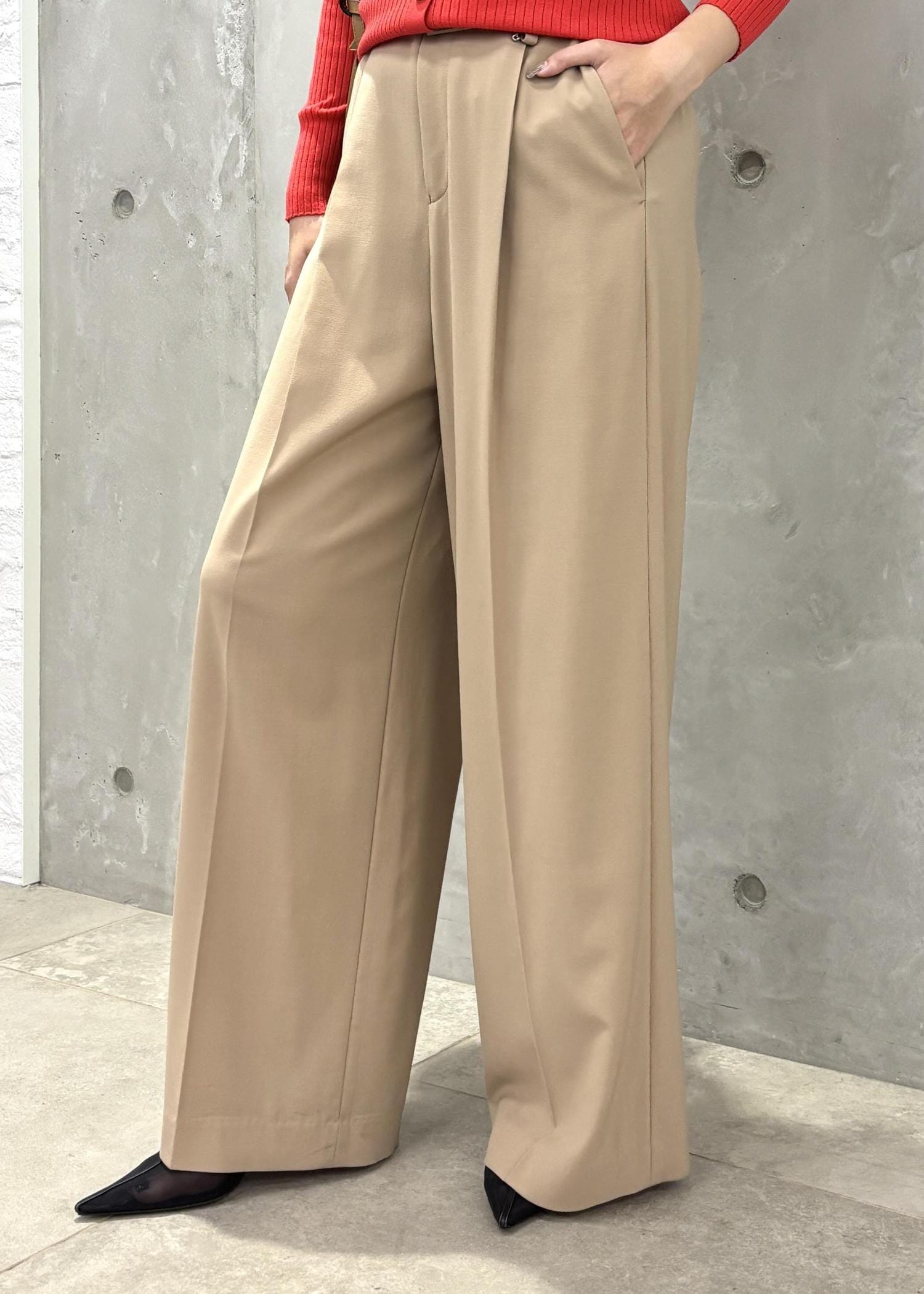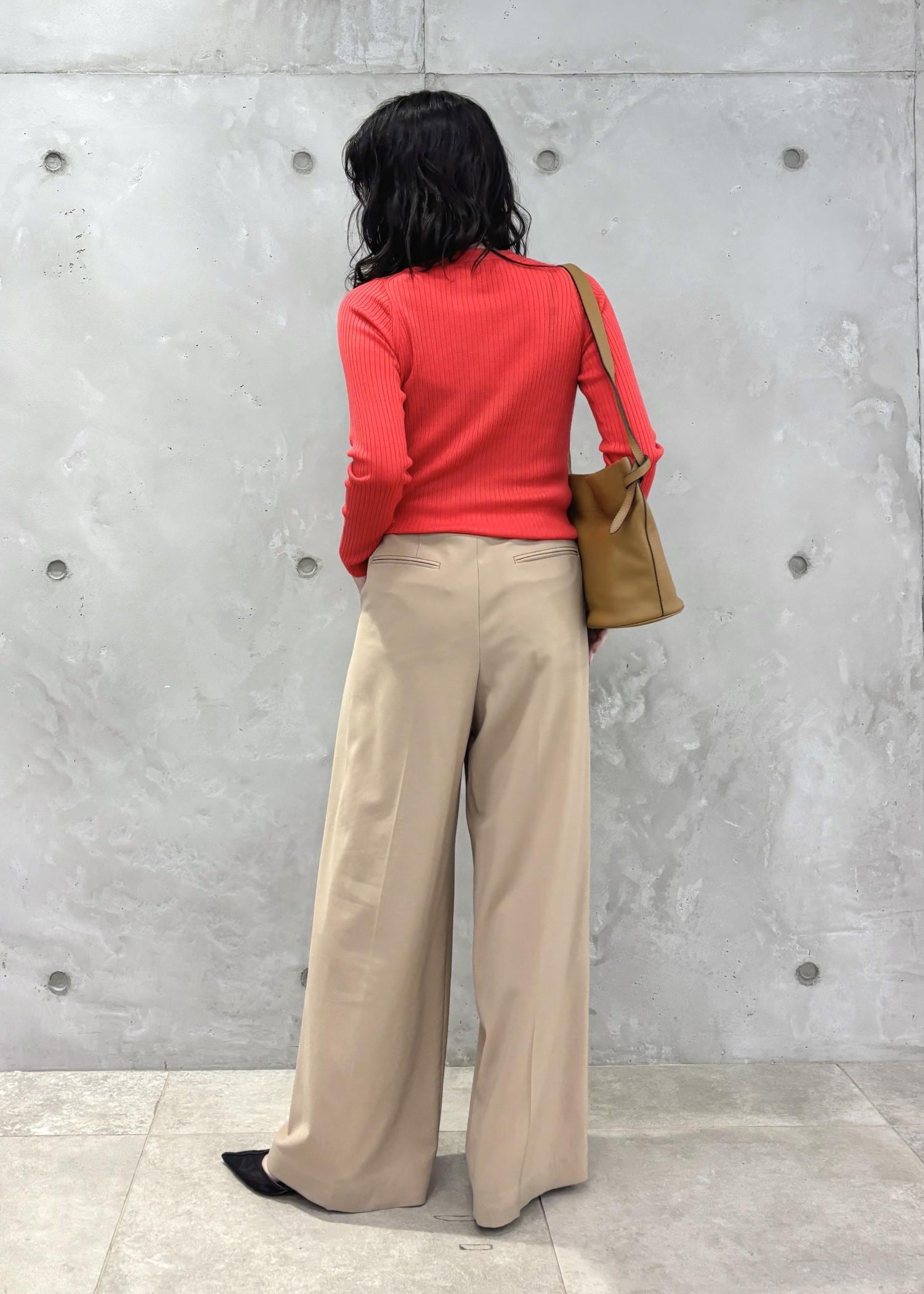 シルエットはワイドですが、ストレートのラインなので気になる骨盤周りを拾わず、脚長効果も◎です。