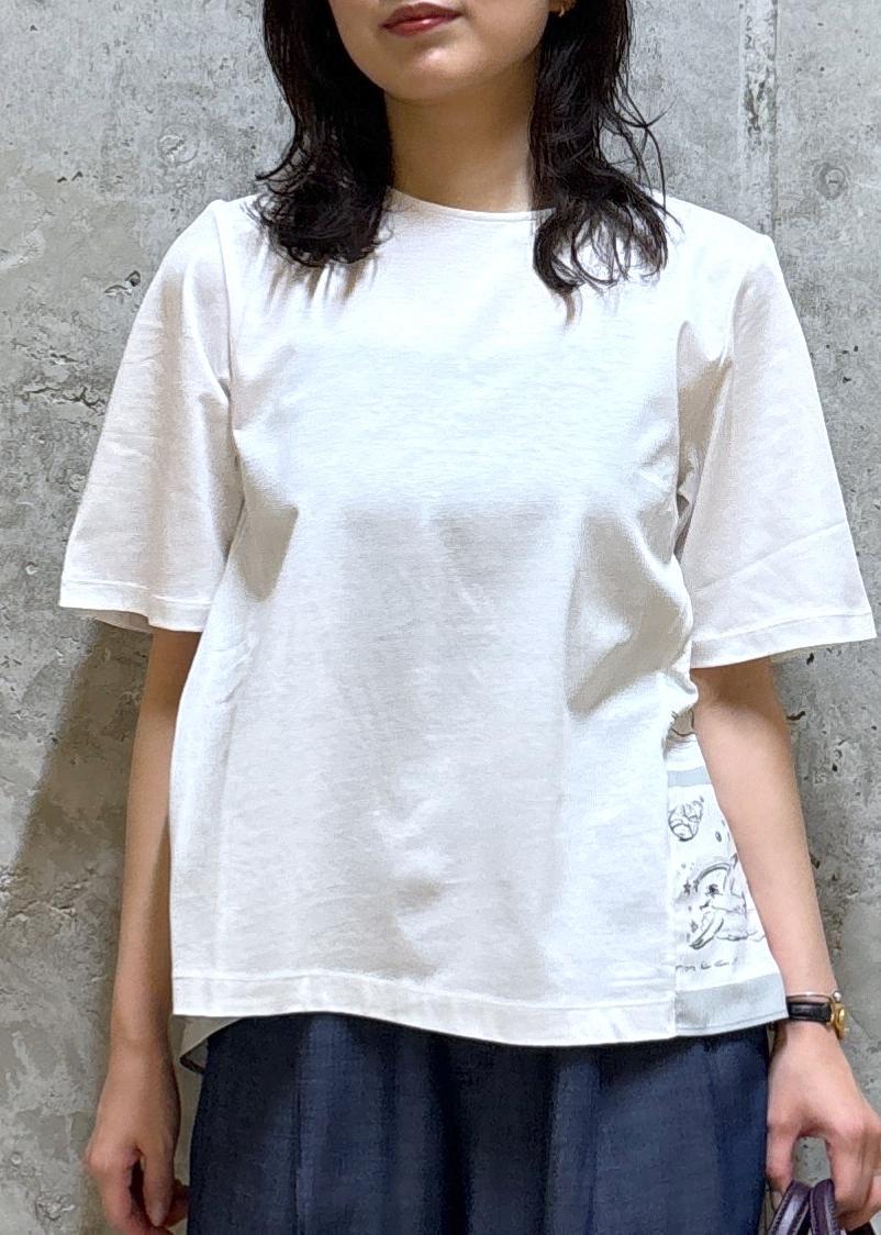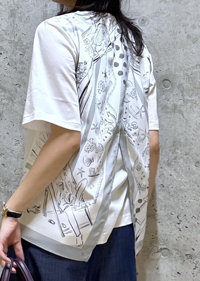 手触りは柔らかく、ややハリのあるカットソー生地にスカーフ柄の生地が背中から脇にかけて斜めにドッキングされたデザイン。